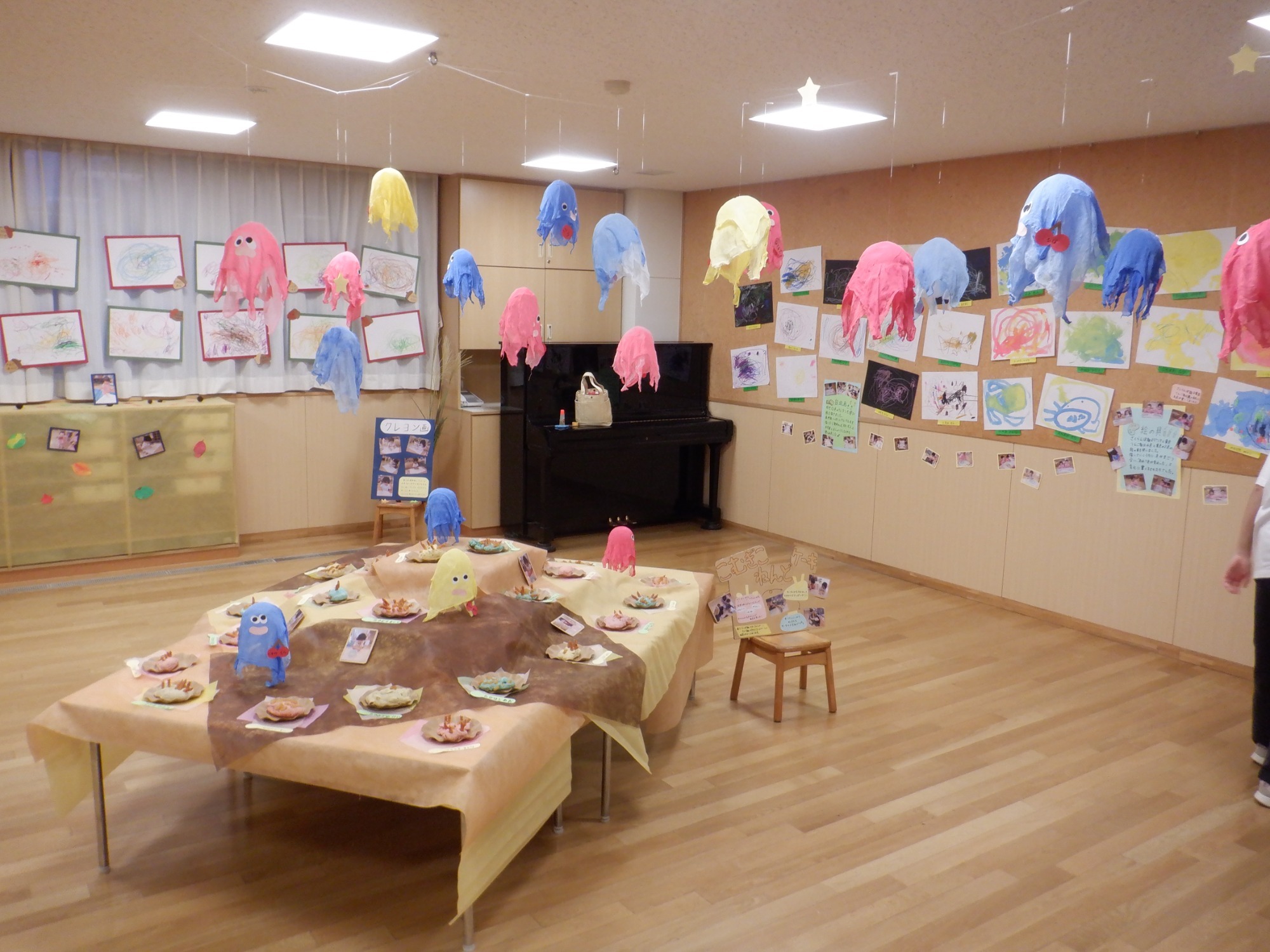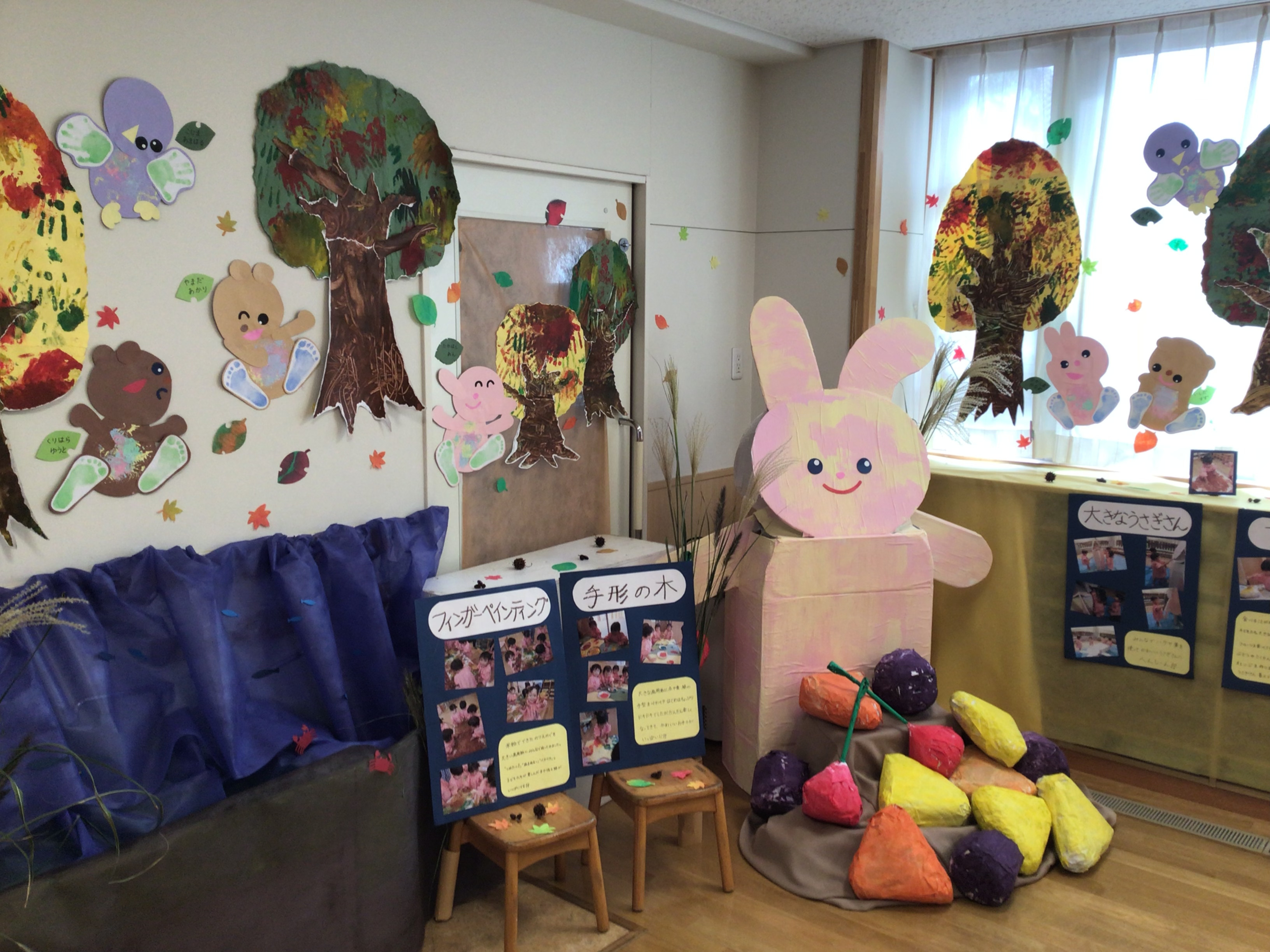 ナーサリー1歳うさぎ組・2歳児りんご組、満3歳児さくらんぼ組は日々の生活の中で楽しんで作った作品を展示しました。