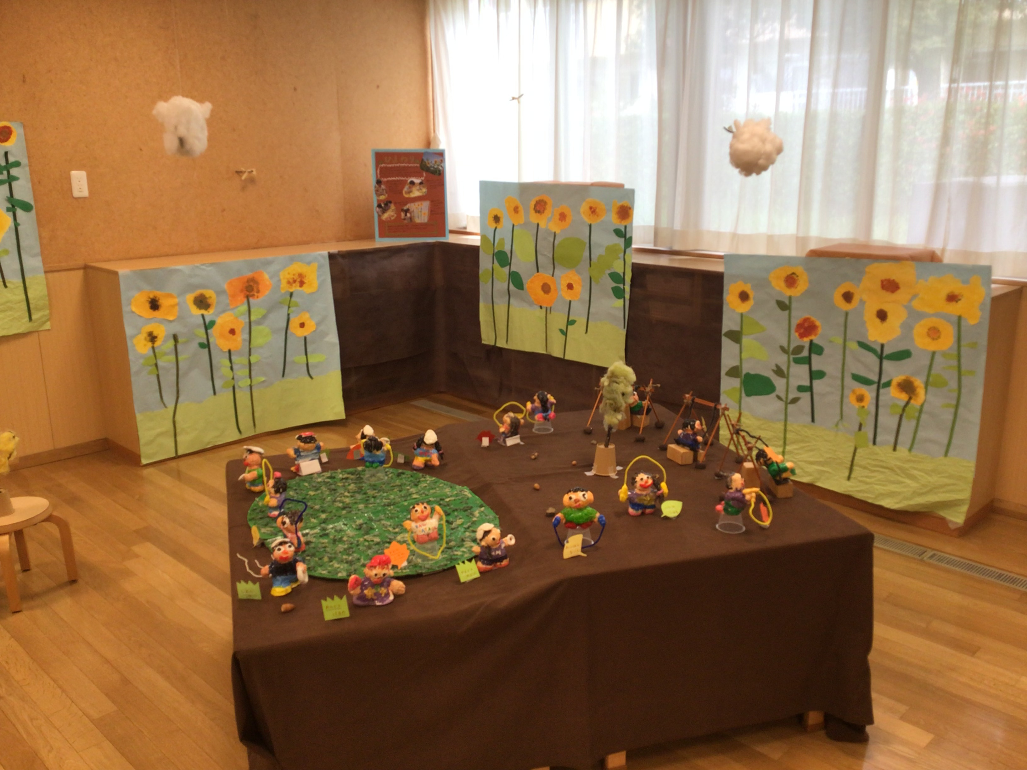 年長組は「園生活で好きな遊びは?」粘土で遊んでいる自分を表現。なわとび・鉄棒・山すべり台…いろんな遊びをしています。後ろの絵は、みんなで種を植え、元気に育ったひまわりを美術の先生に技法を教えてもらって作りました!