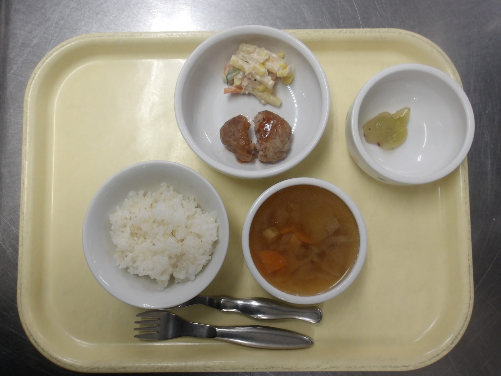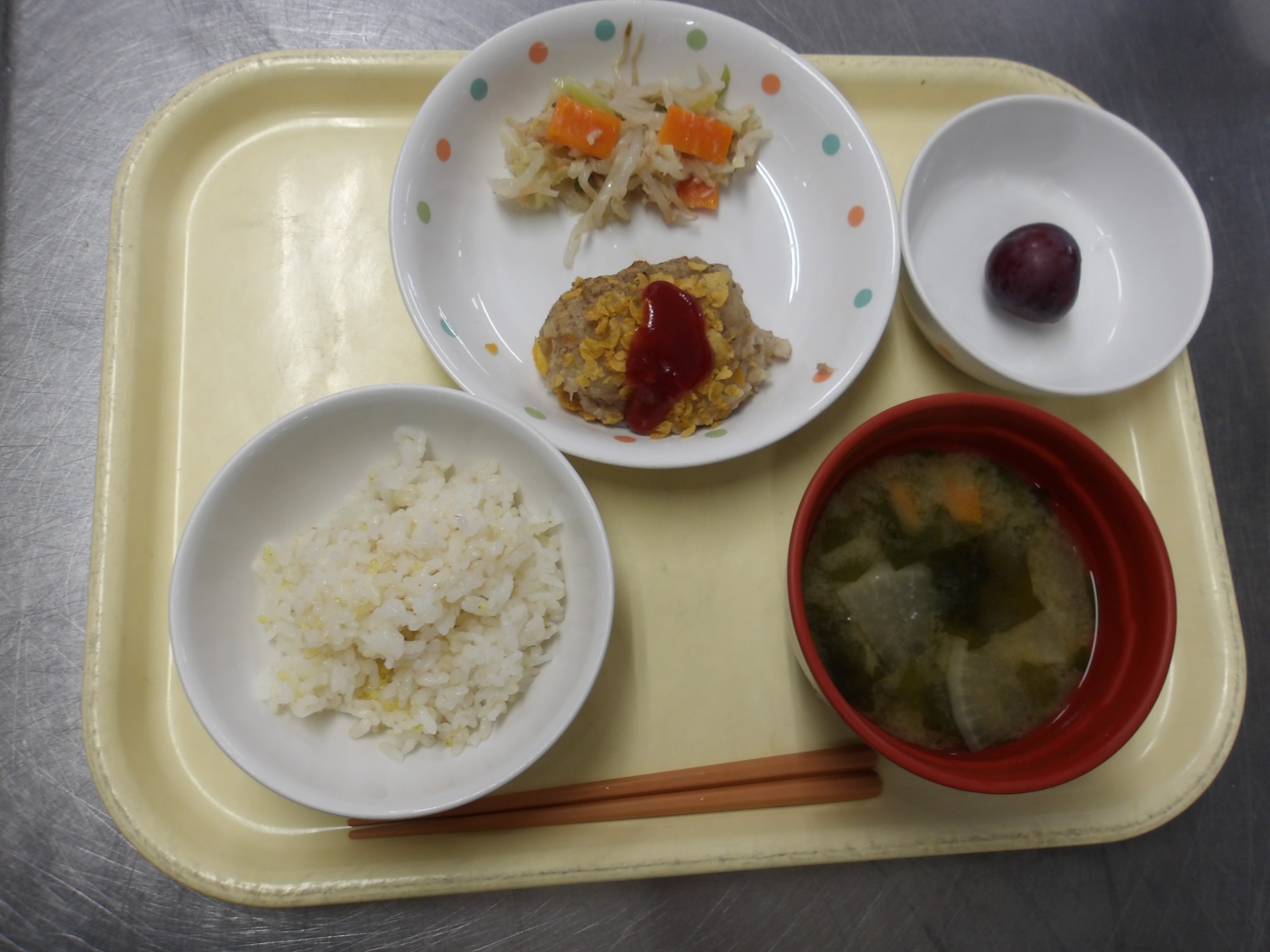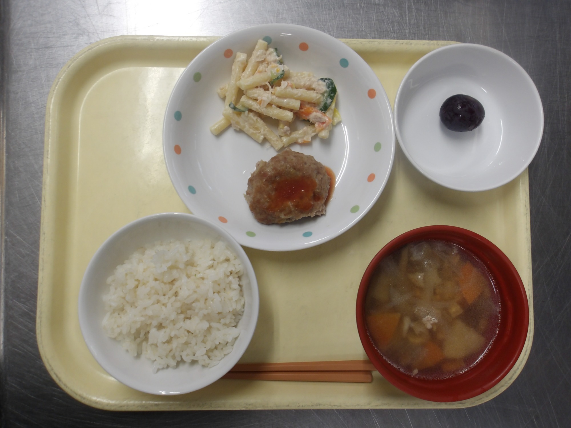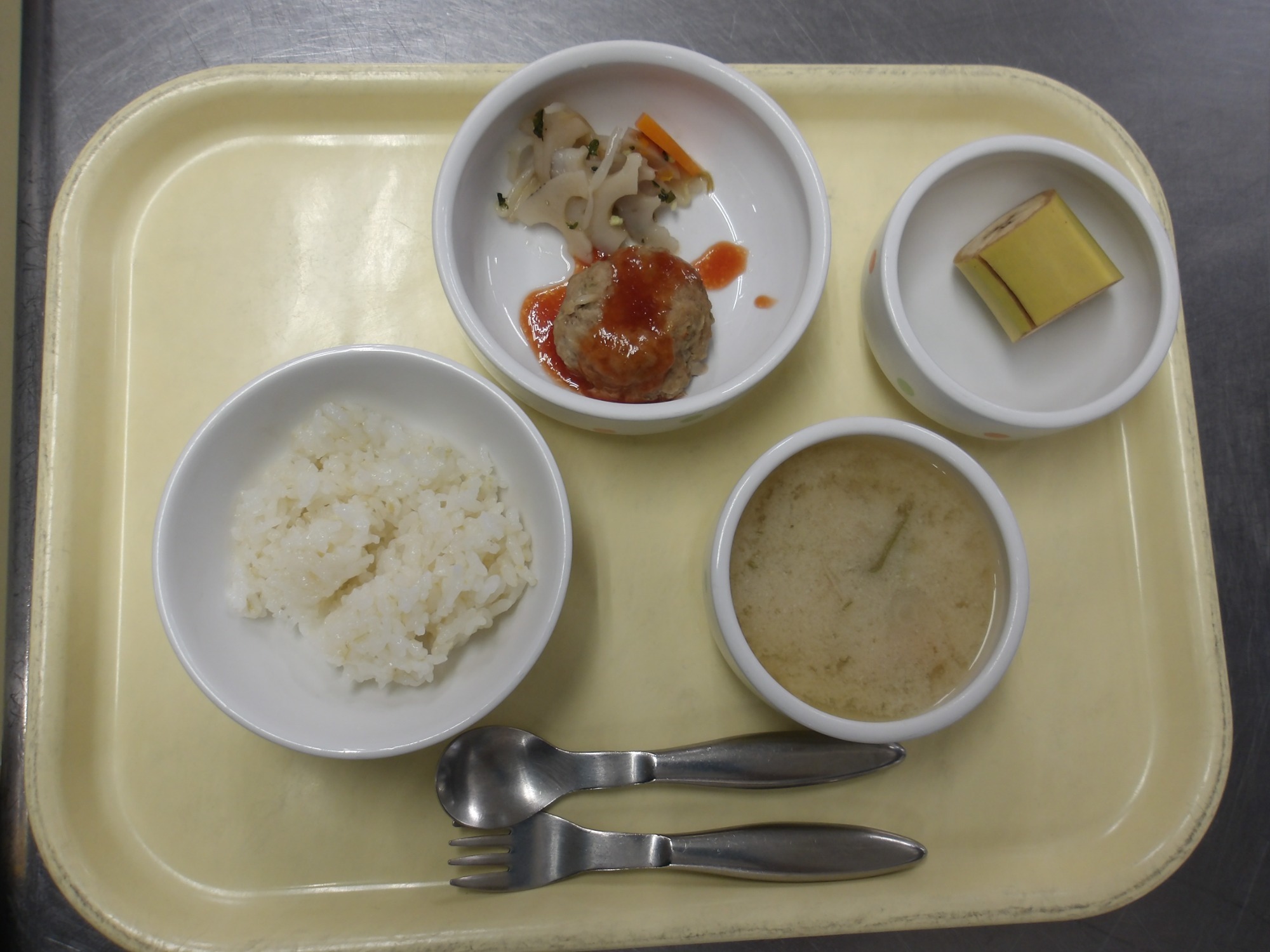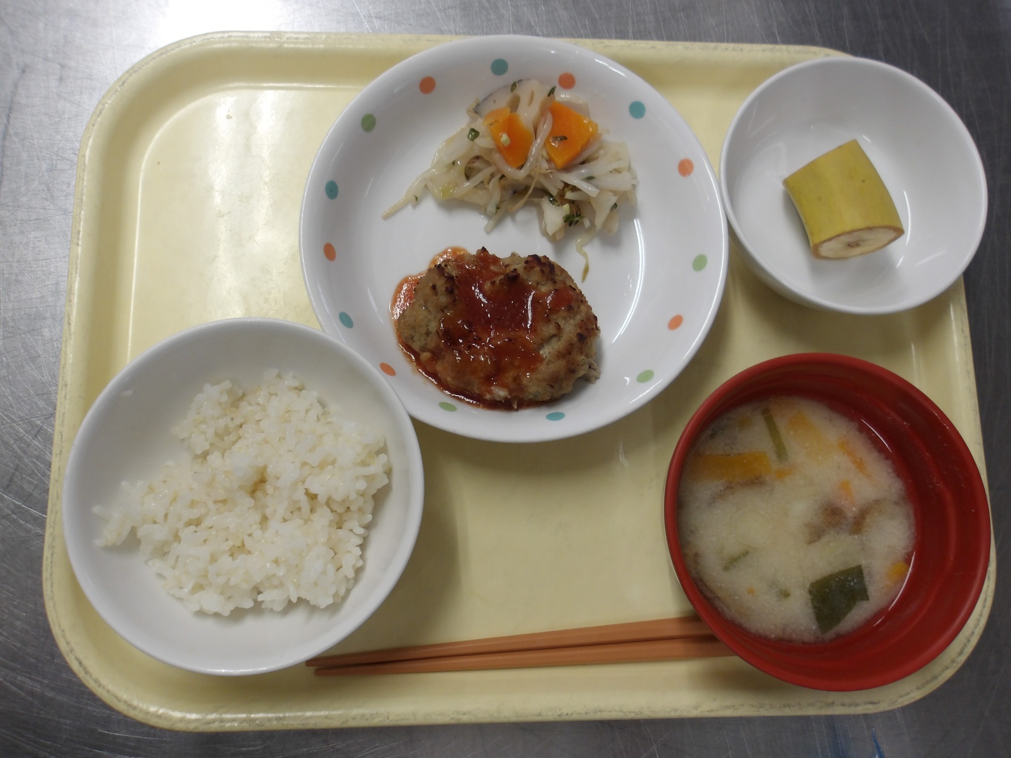 ごはん ハンバーグ れんこんのサラダ 根菜ミソスープ(出汁がコンソメ)バナナ おやつ:枝豆ケーキ