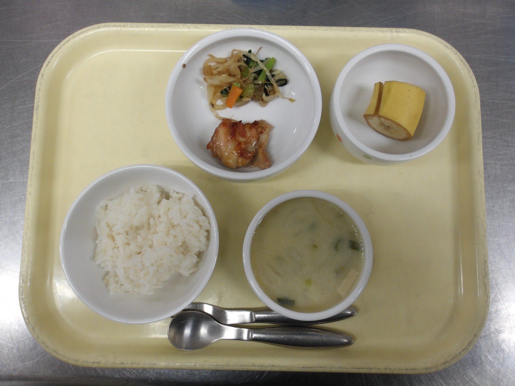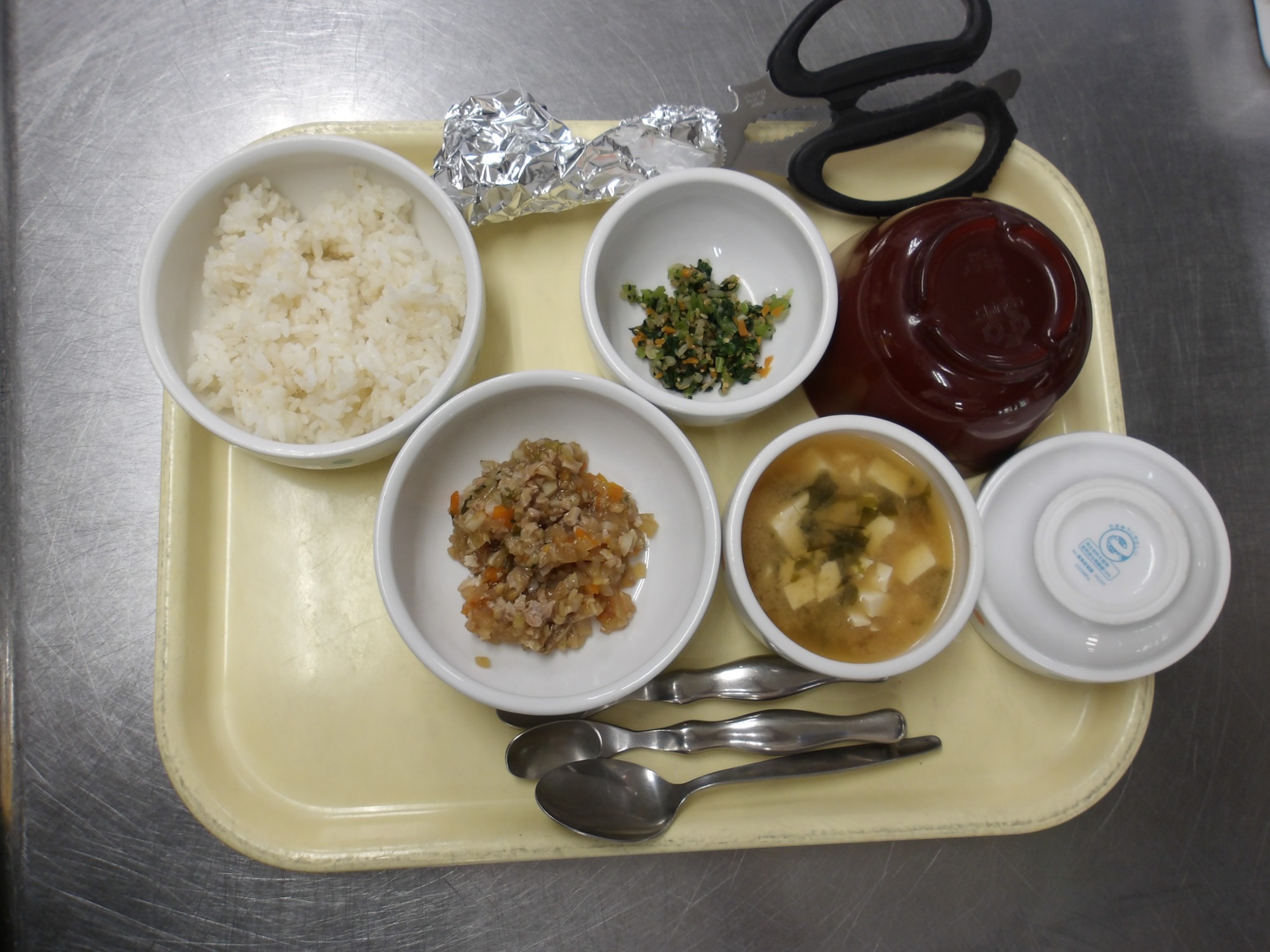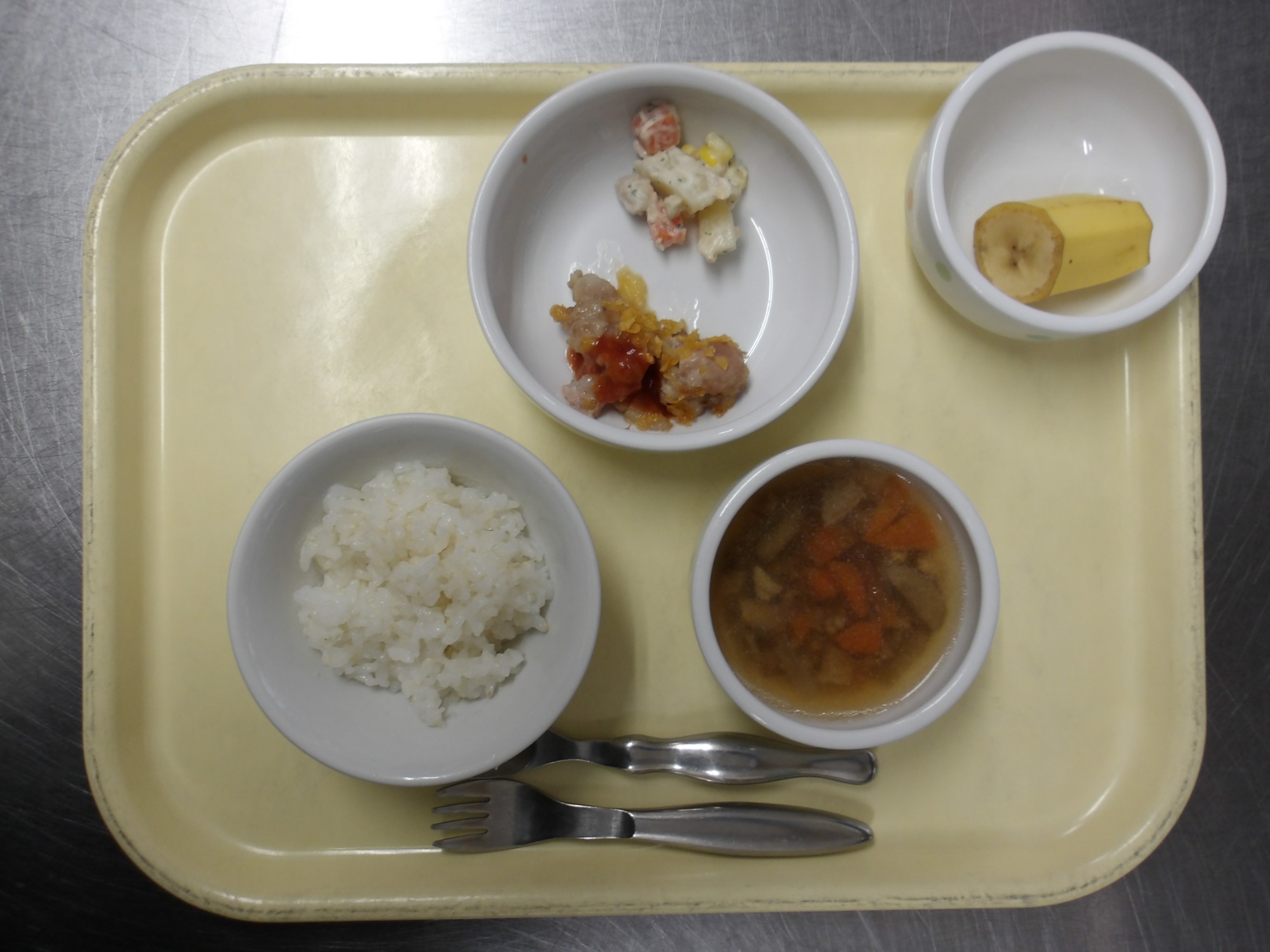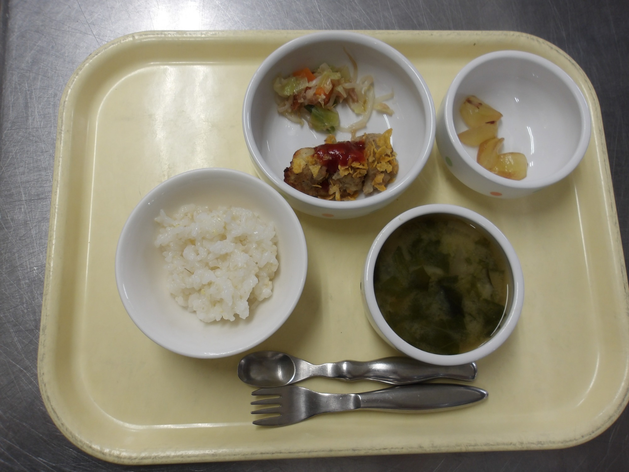 ごはん ハンバーグ れんこんのサラダ 根菜ミソスープ(出汁がコンソメ)バナナ おやつ:枝豆ケーキ