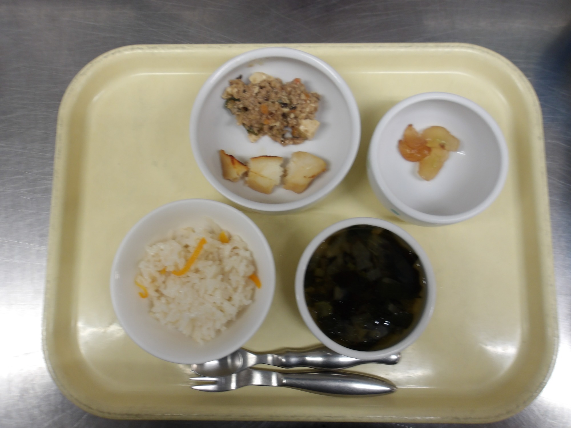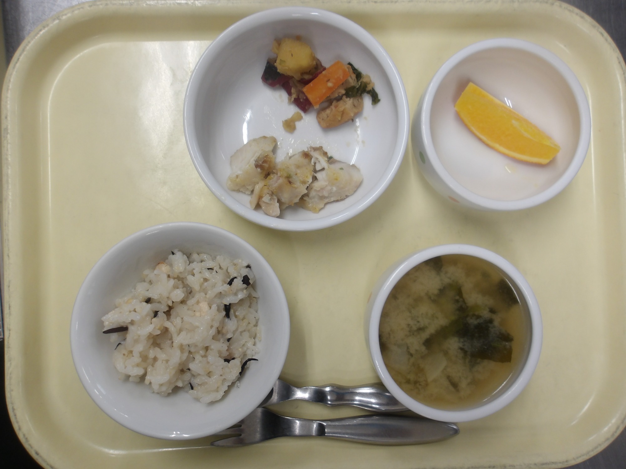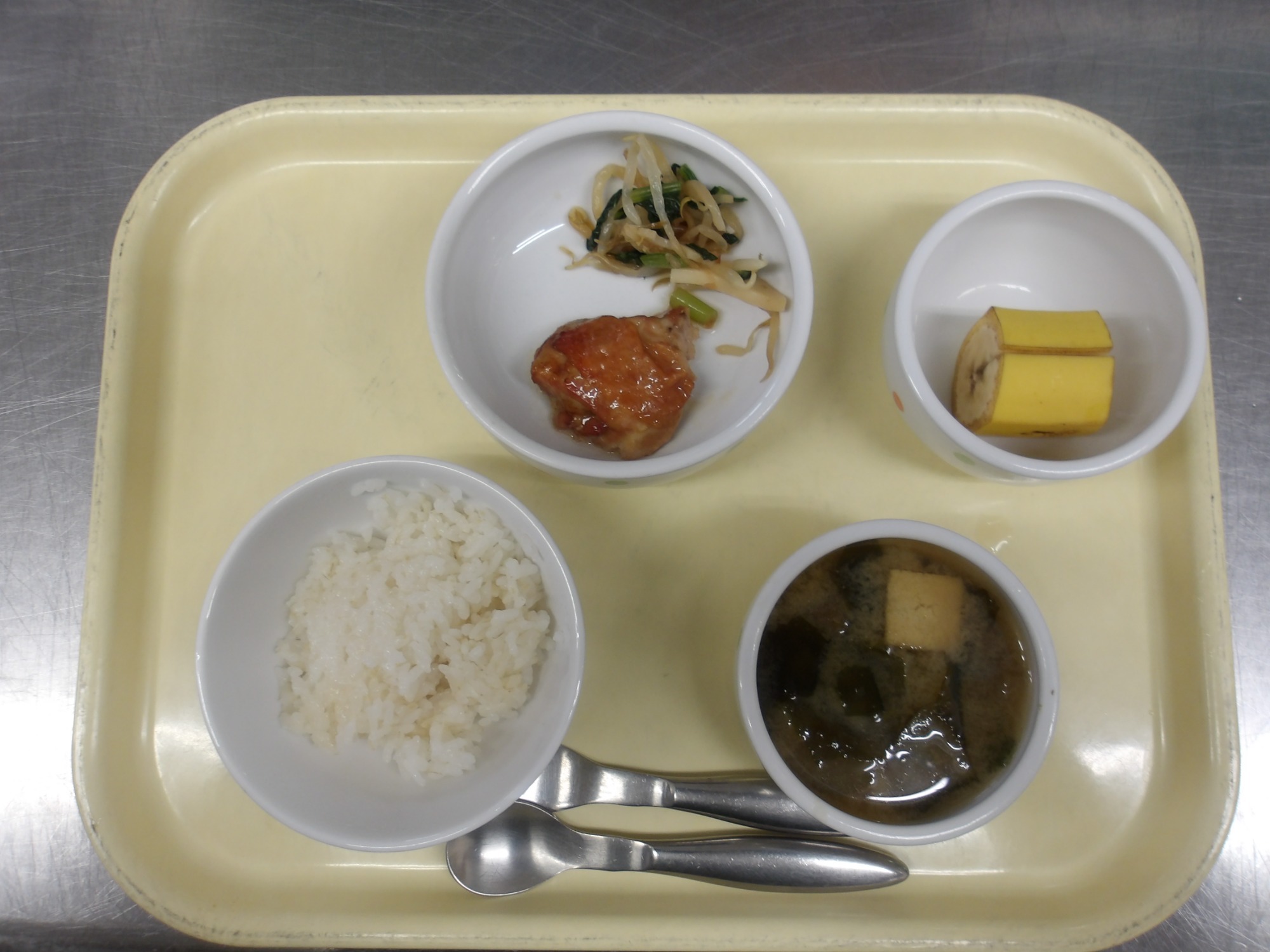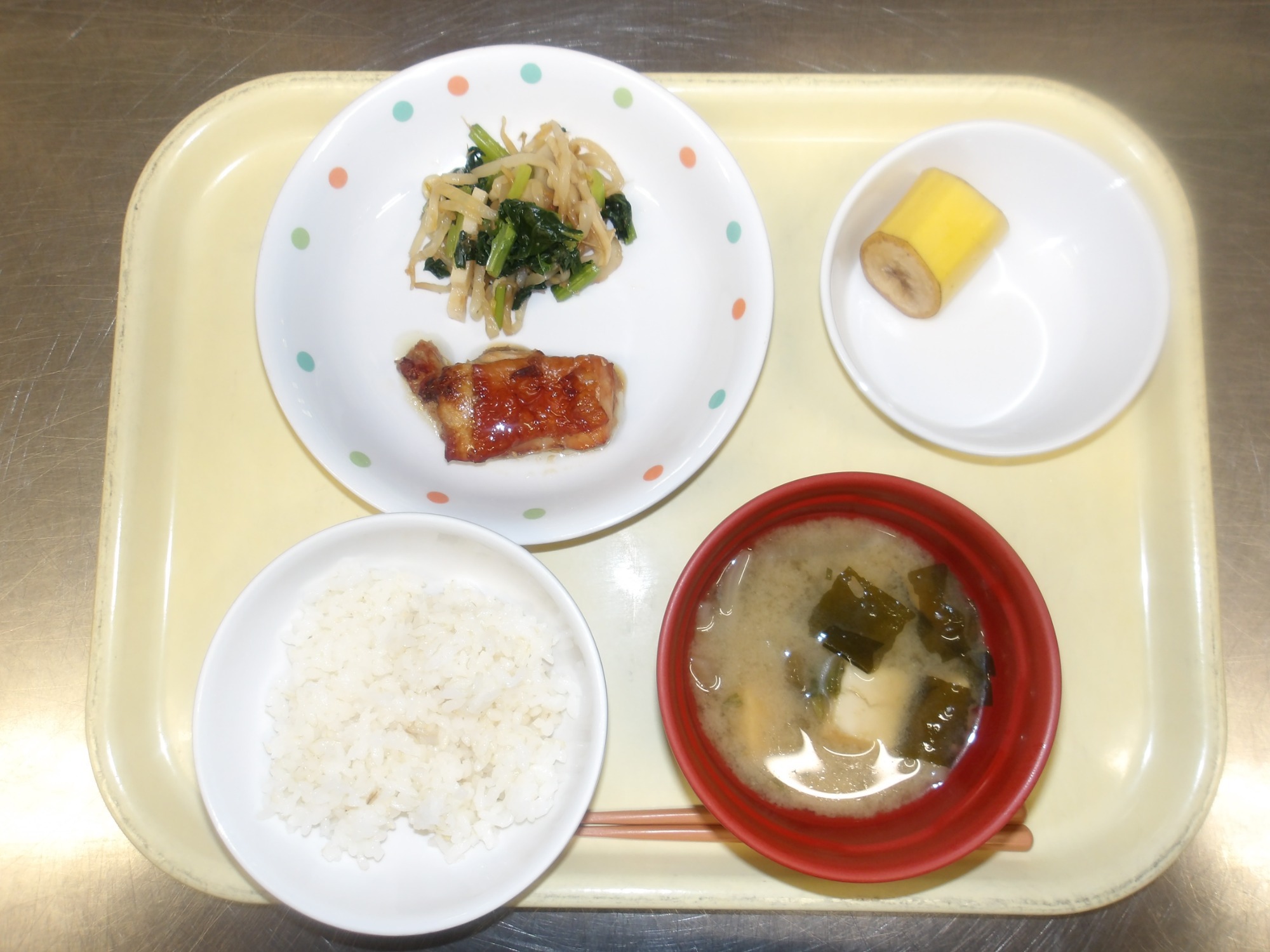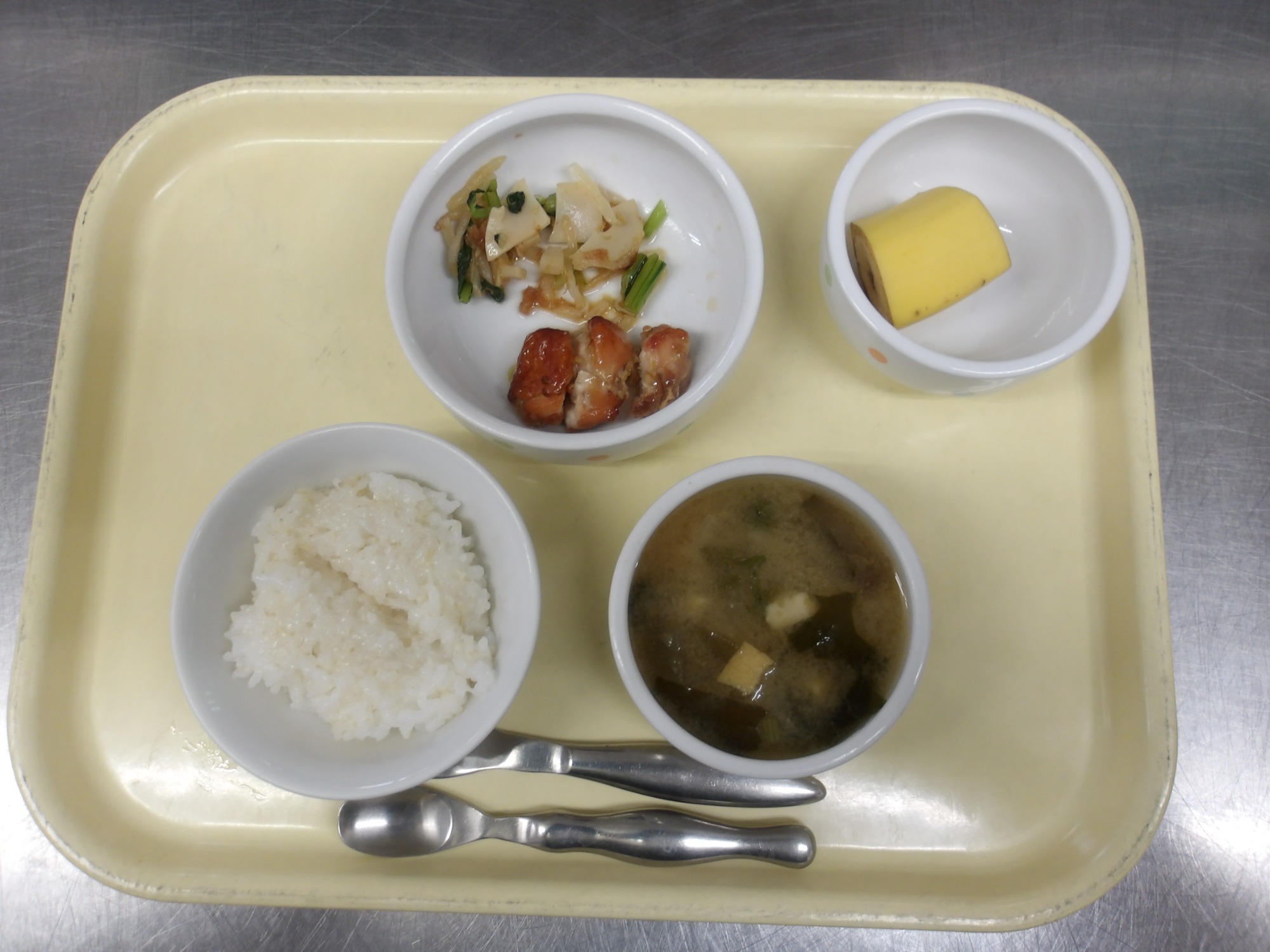 ごはん ハンバーグ れんこんのサラダ 根菜ミソスープ(出汁がコンソメ)バナナ おやつ:枝豆ケーキ