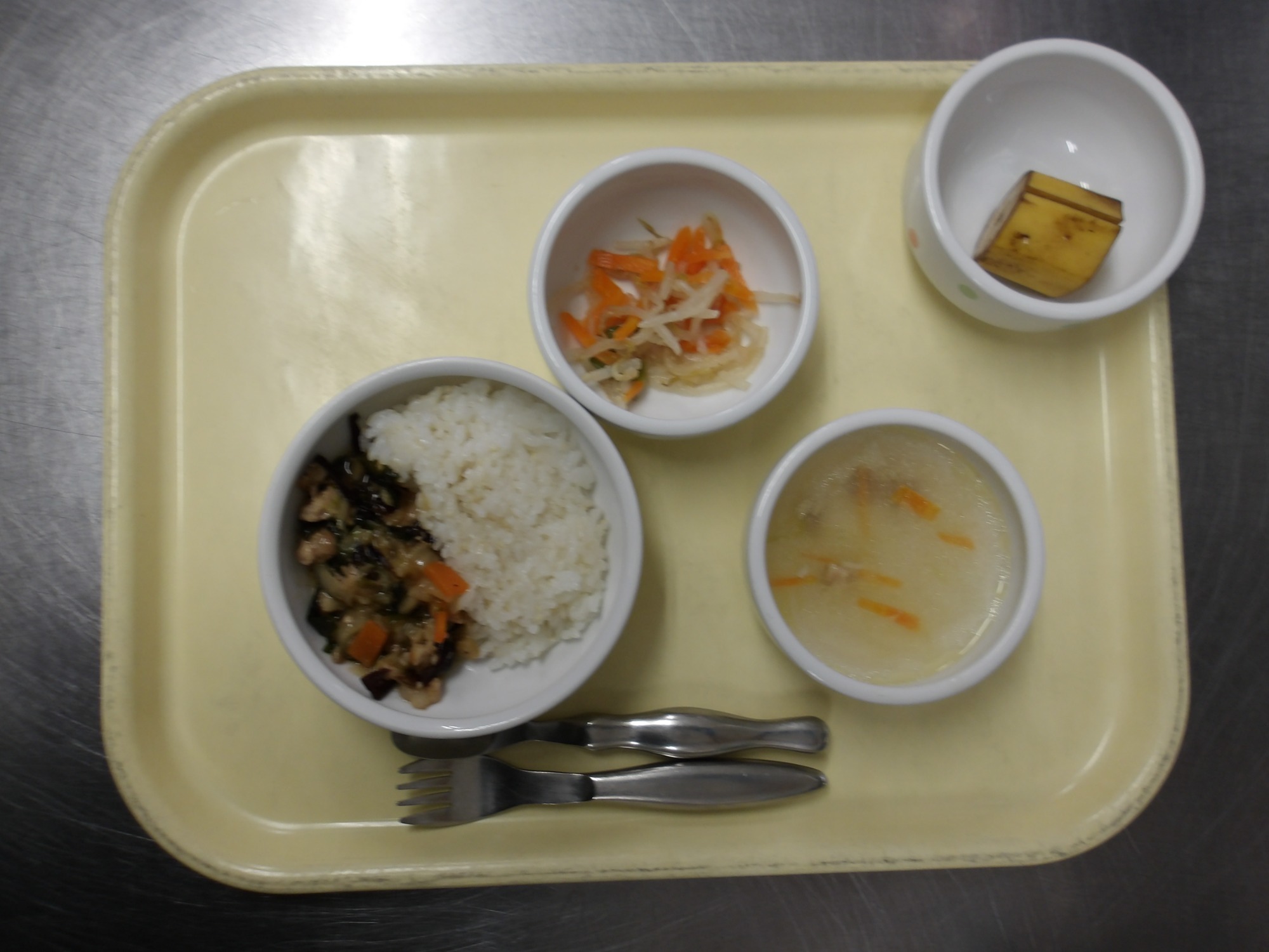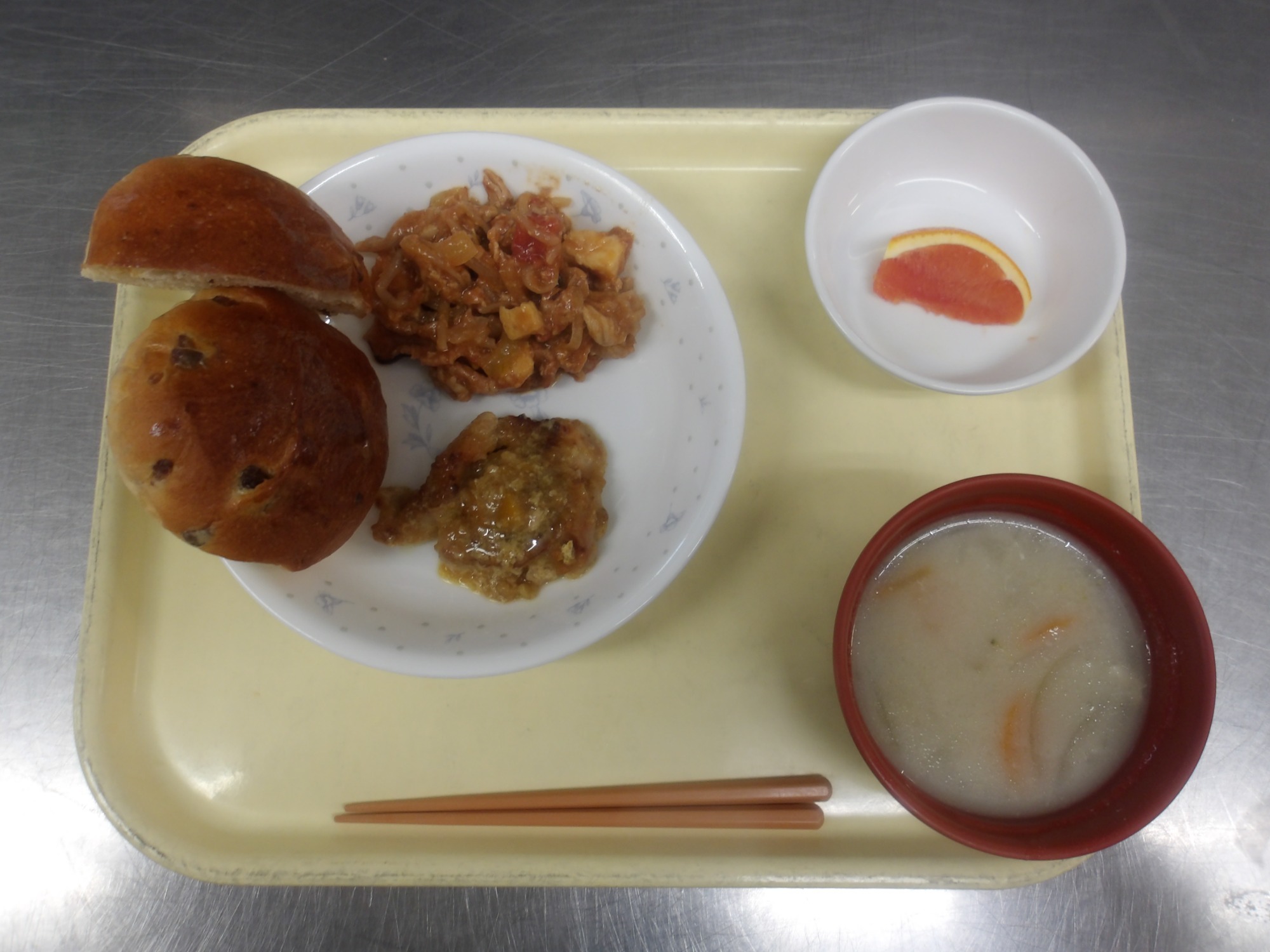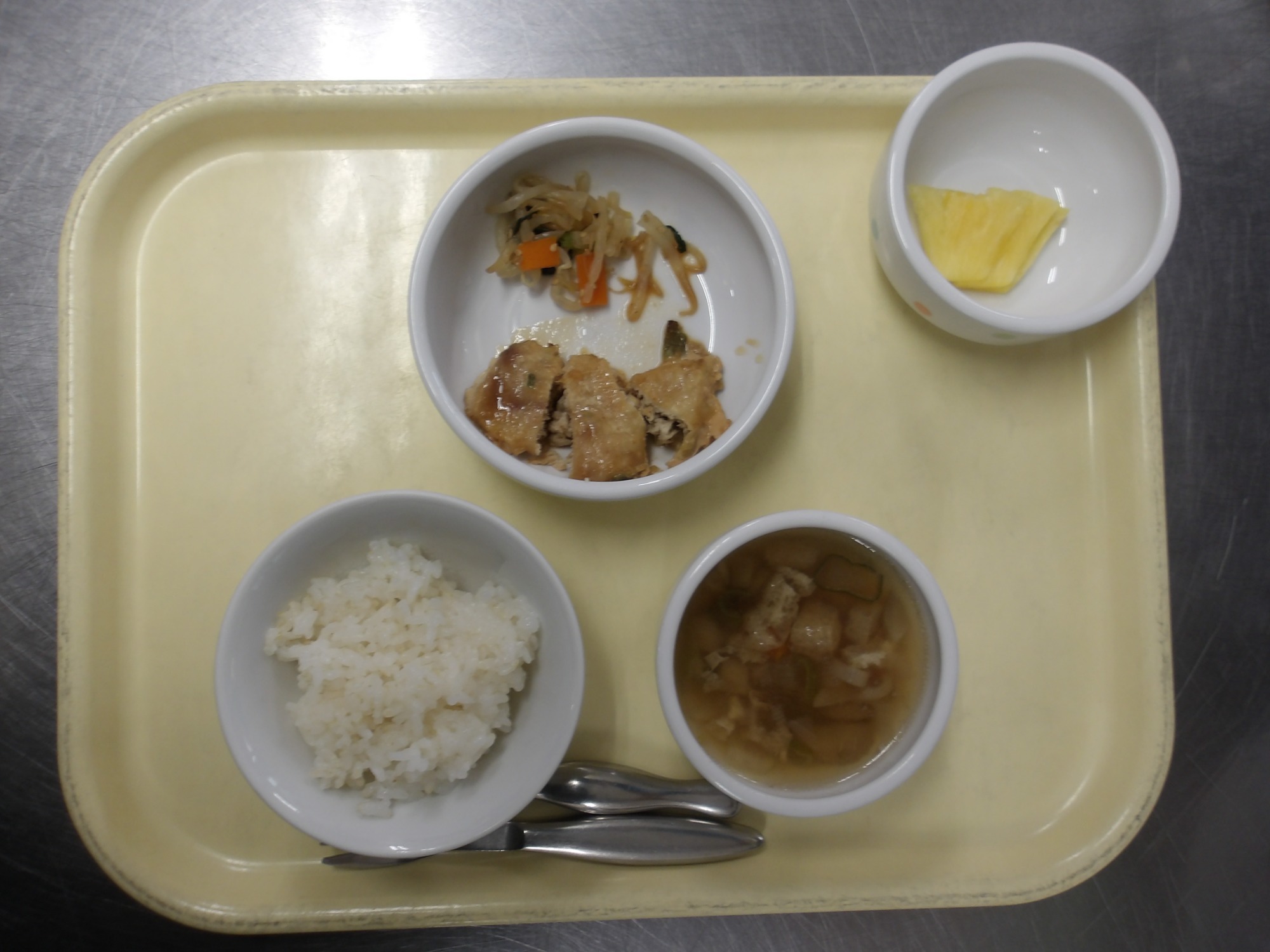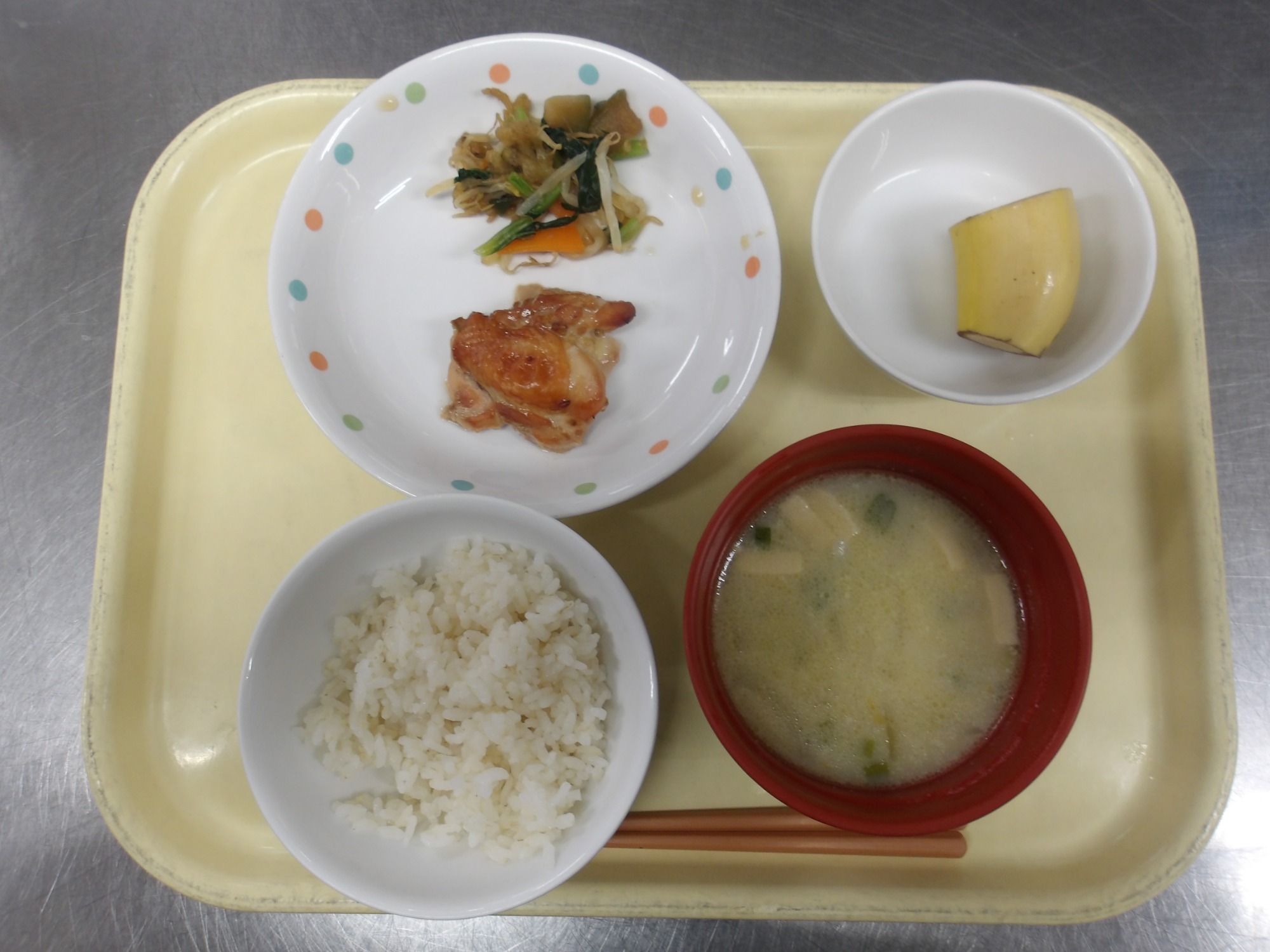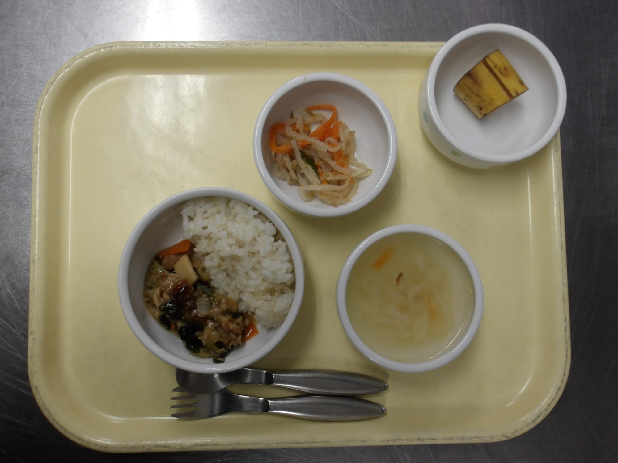 ごはん ハンバーグ れんこんのサラダ 根菜ミソスープ(出汁がコンソメ)バナナ おやつ:枝豆ケーキ