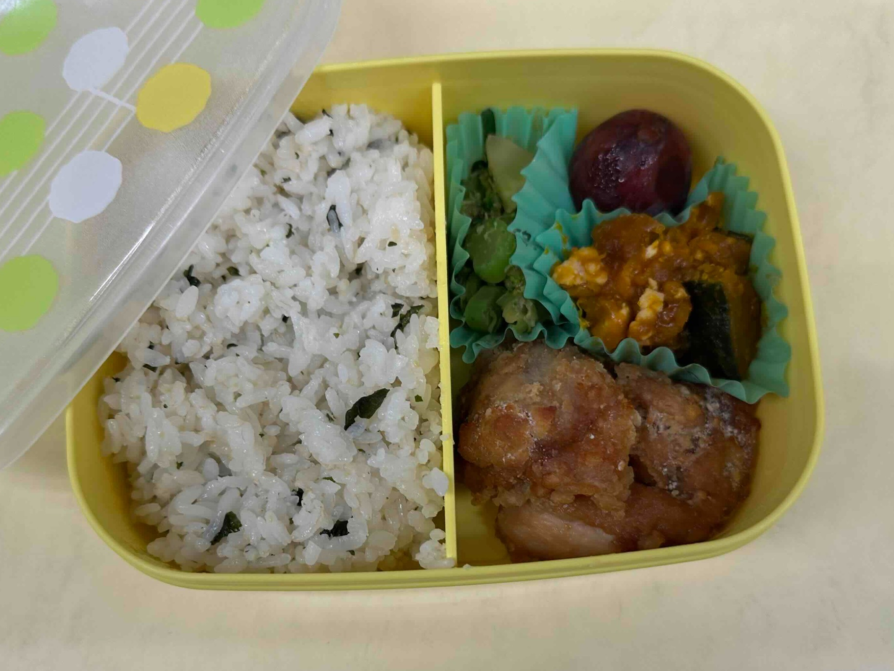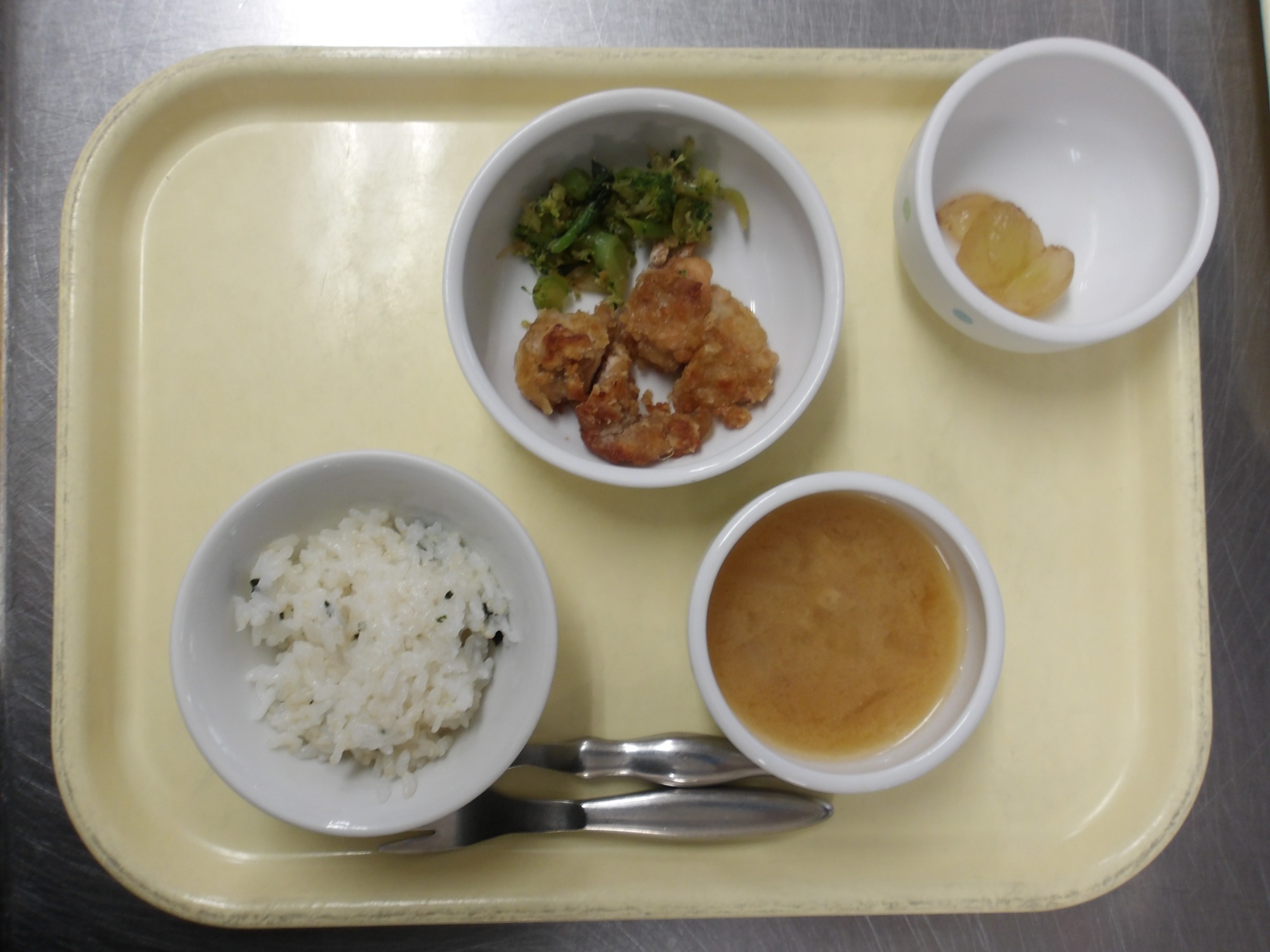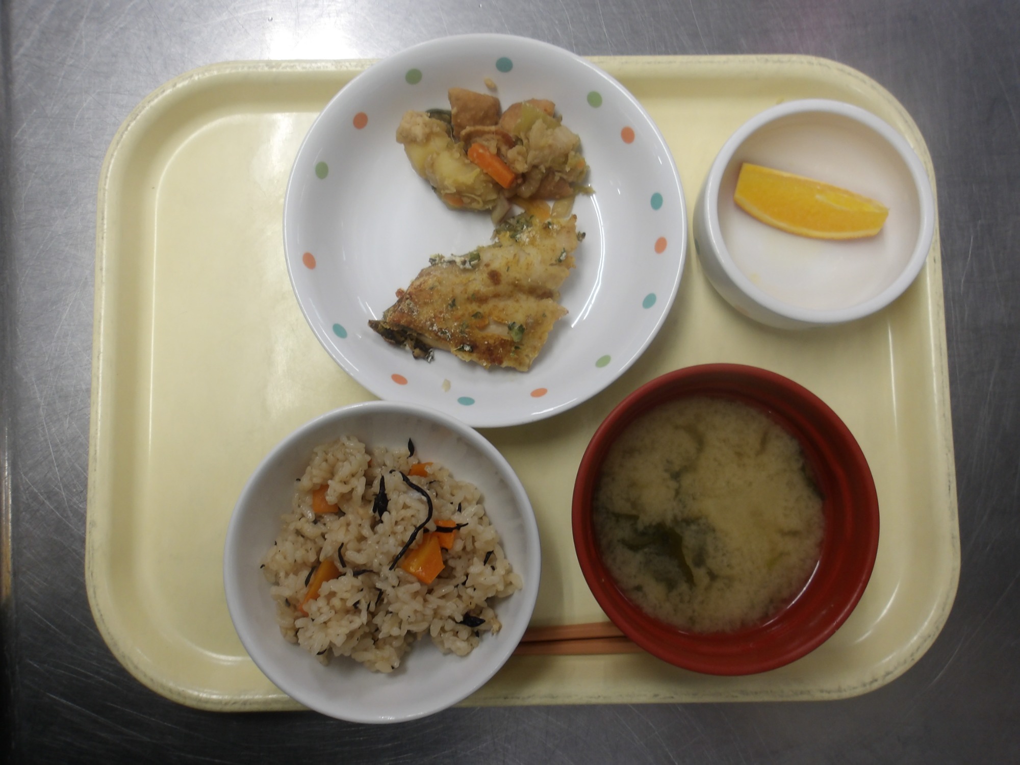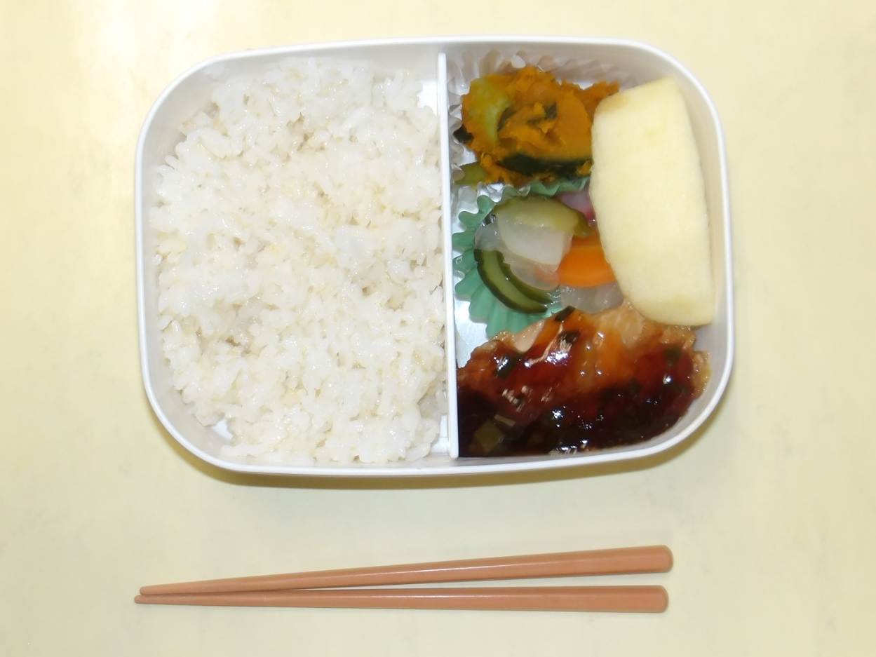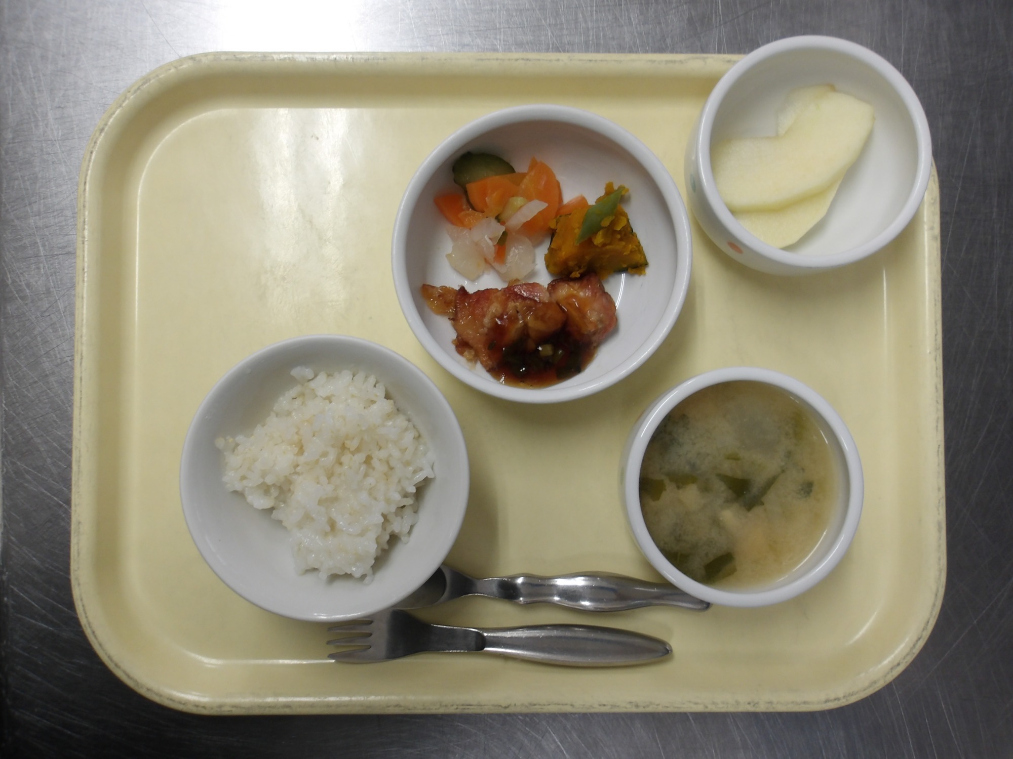 ごはん 油淋鶏 ふかしかぼちゃ 大根のピクルス りんご ナーサリー:みそ汁 おやつ:じゃこトースト