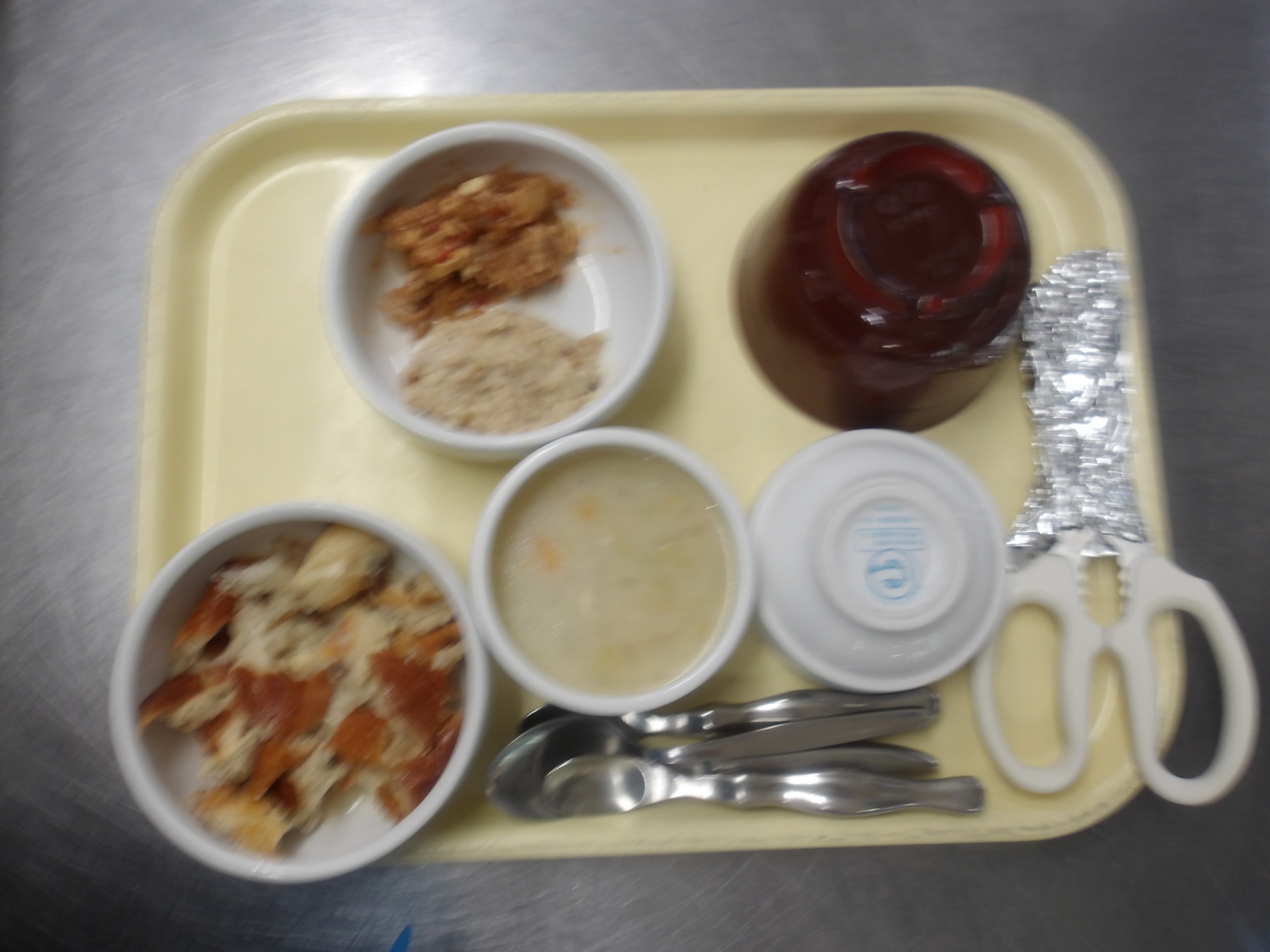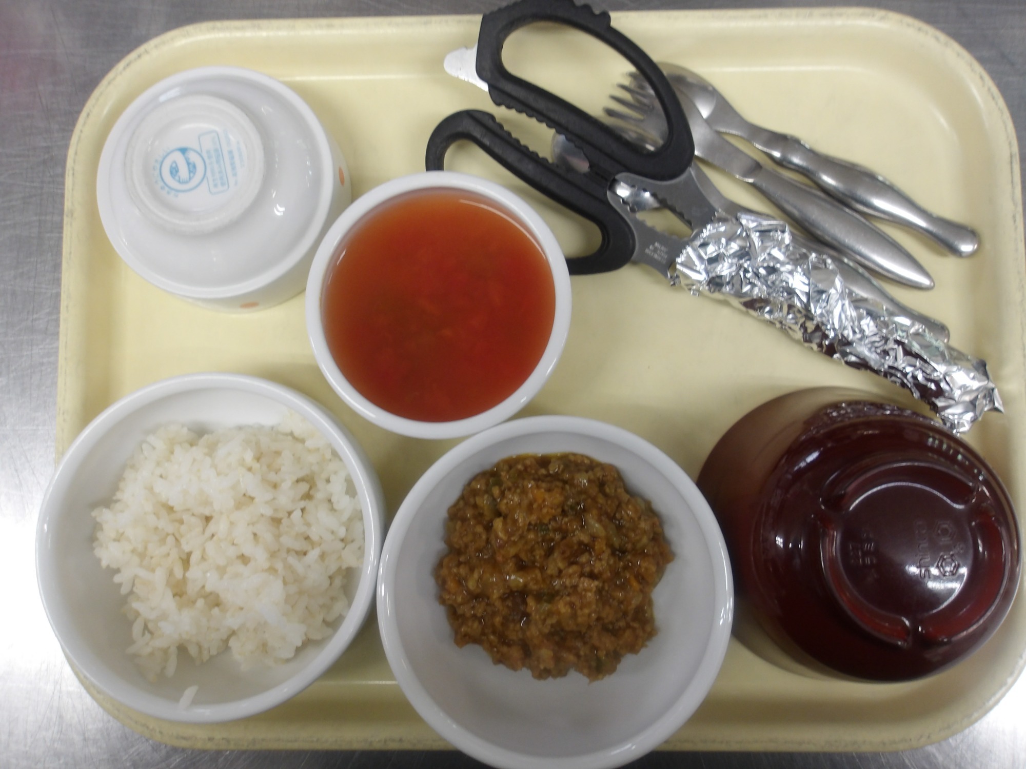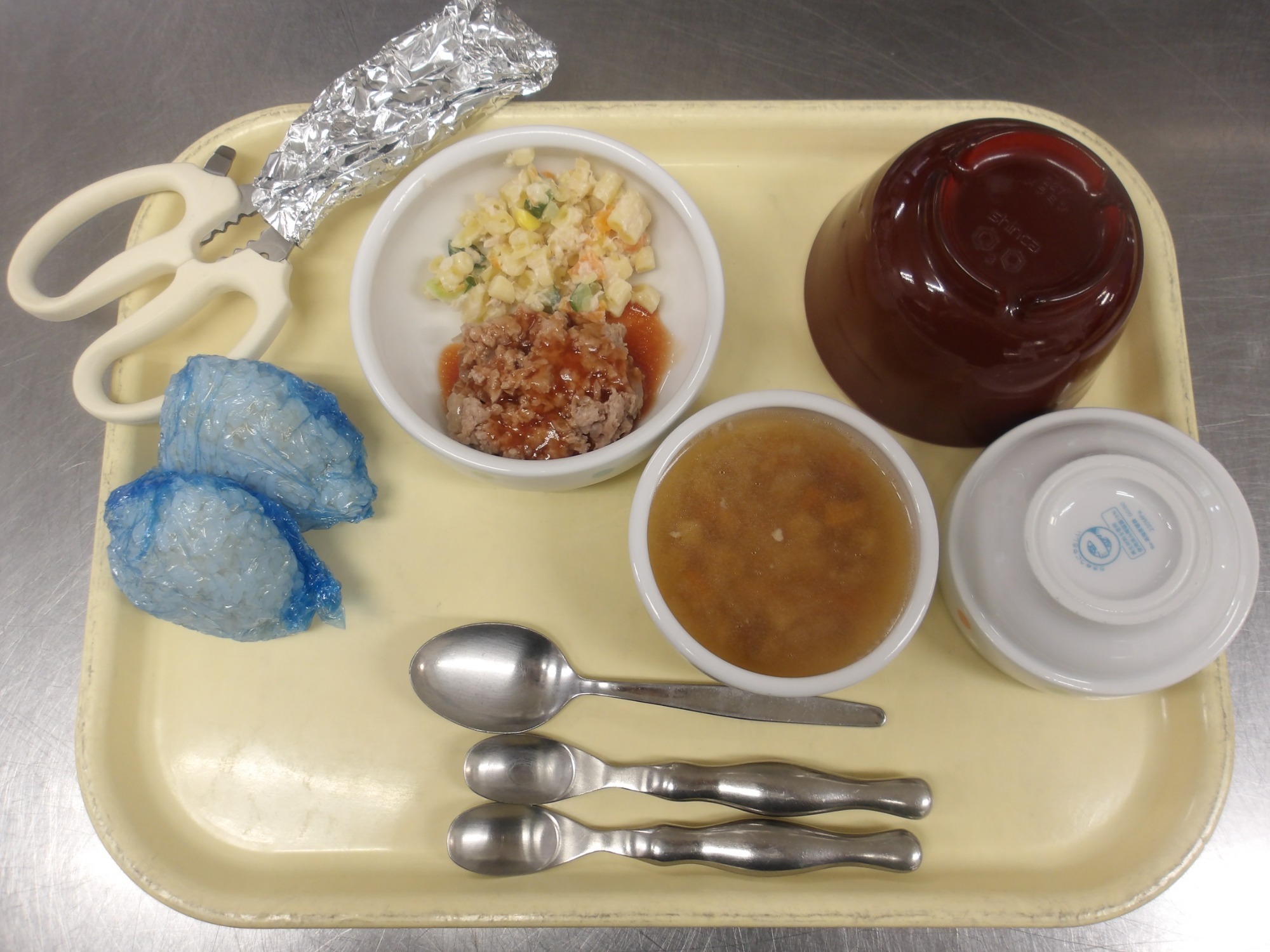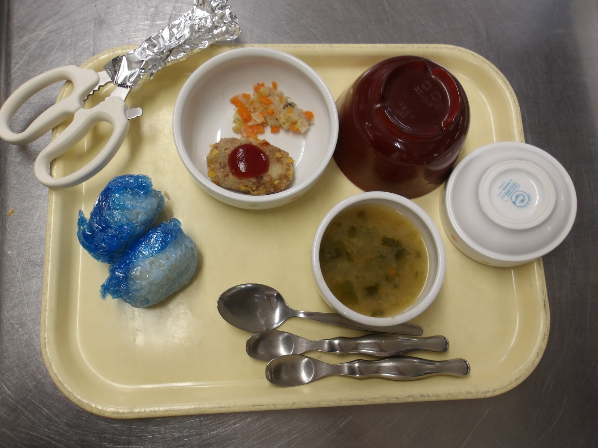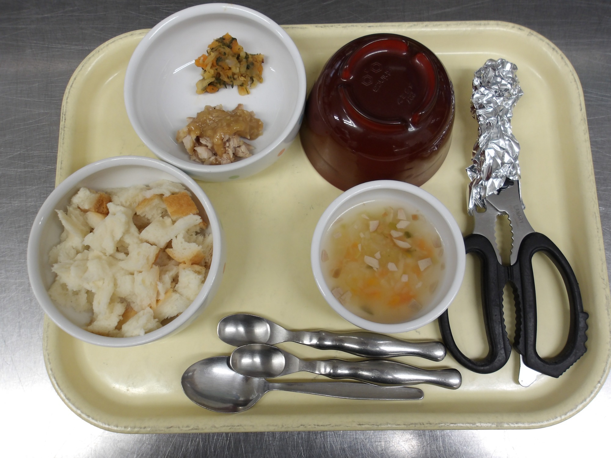 きざみ食はコロッケはすべて刻まれているためそのまま提供しました。お部屋で加工できるようにハサミをつけています。