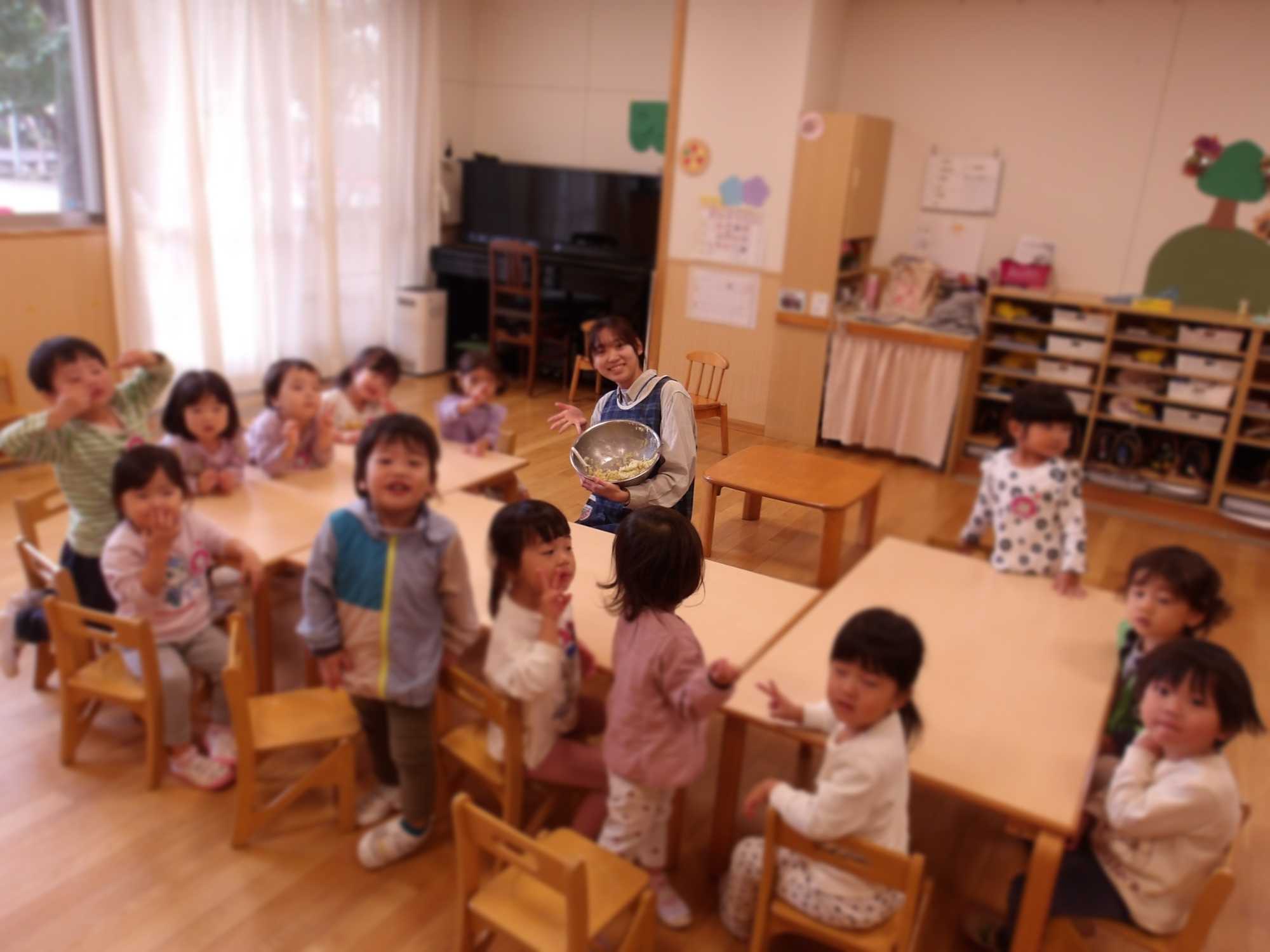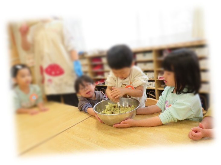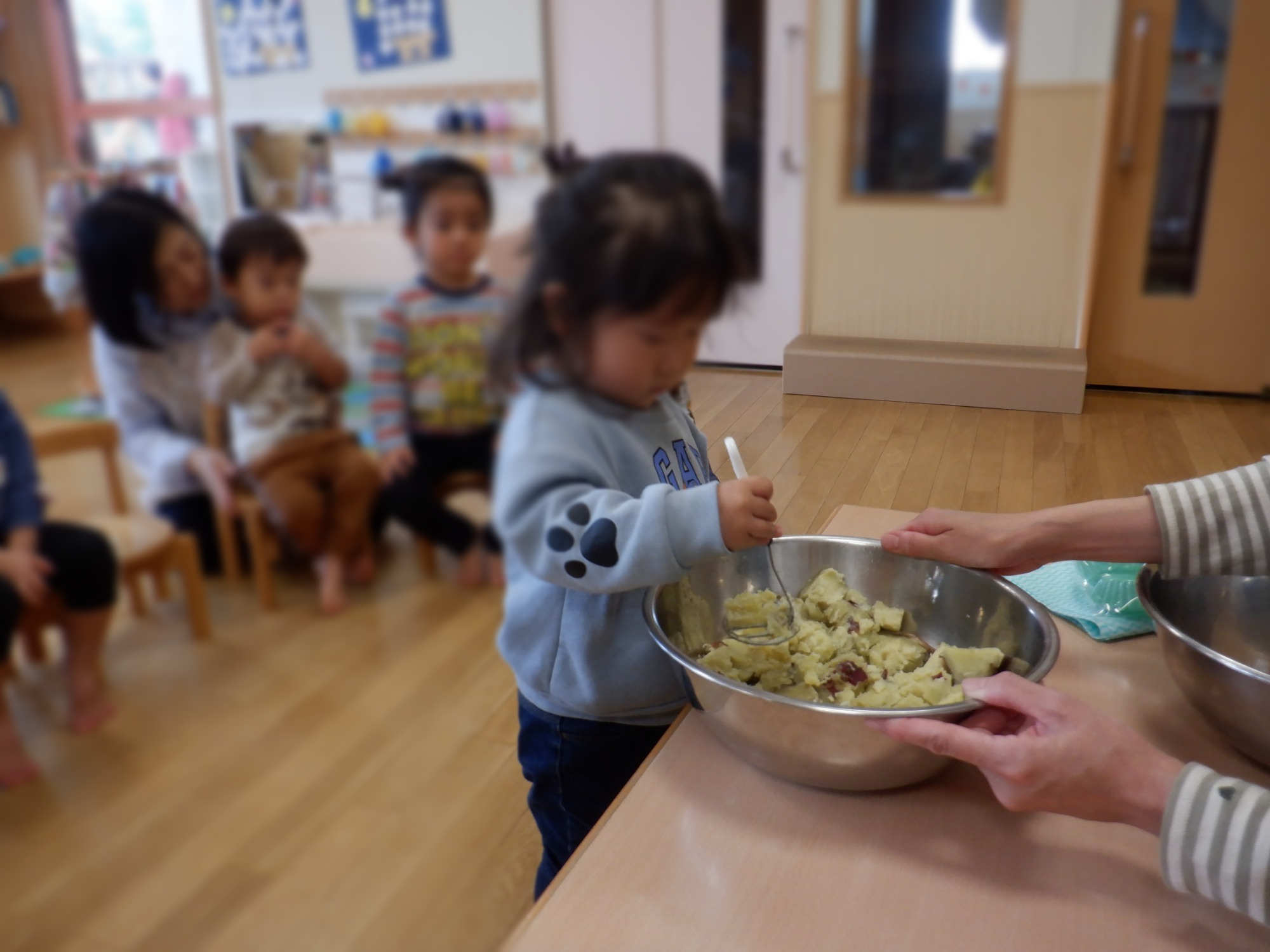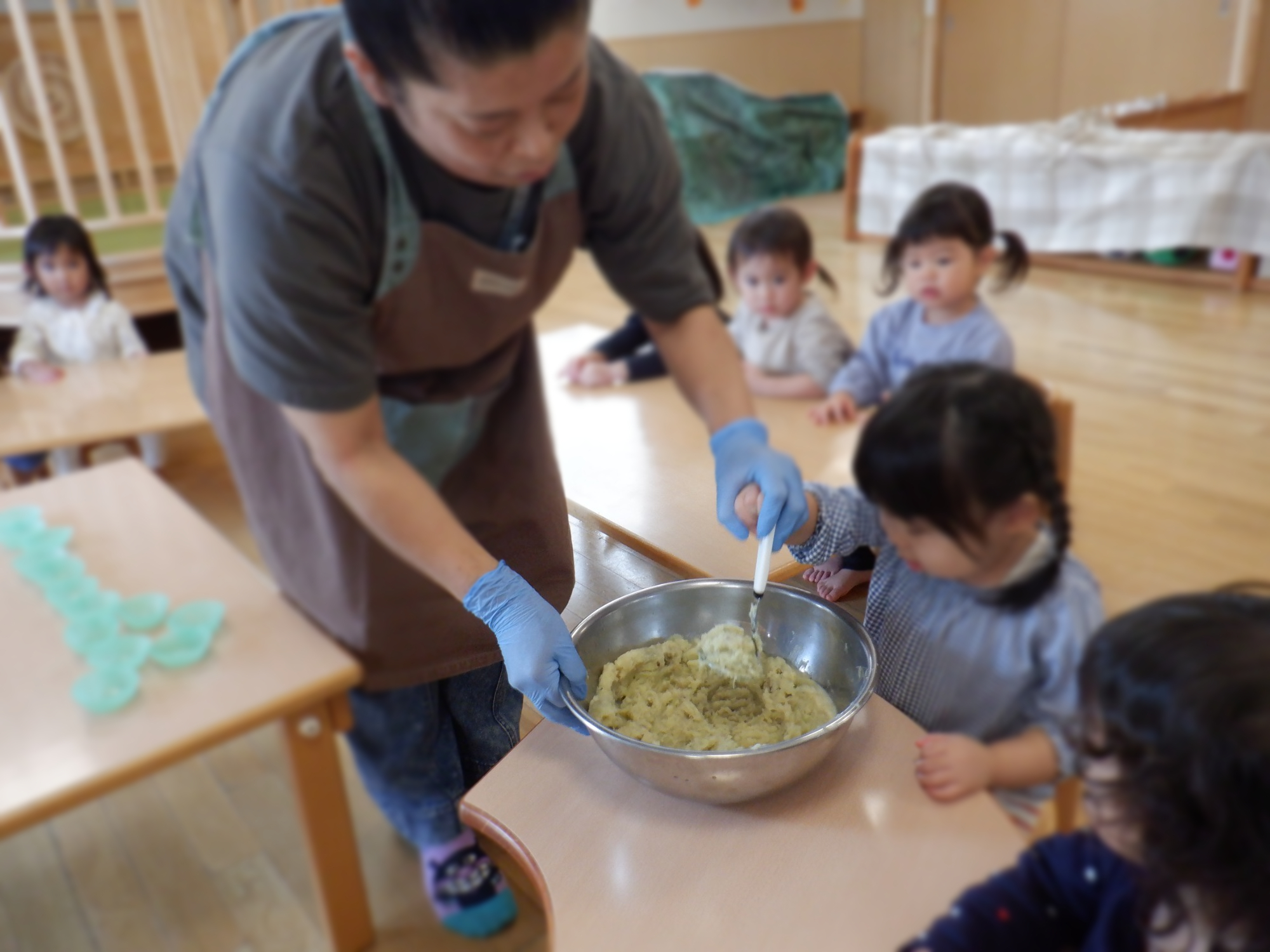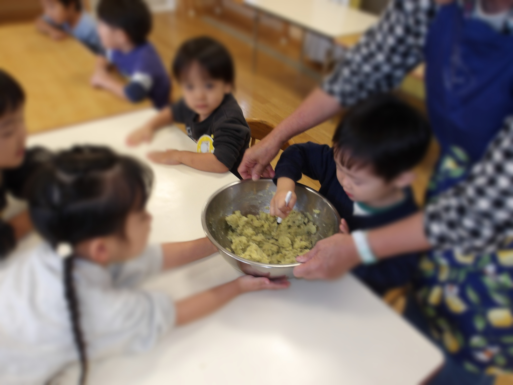 きょうは年少組がクッキング!お芋をつぶしてきんとんにしました。みんなで掘ってきたお芋をみんなできんとんづくり♪おいしかったね