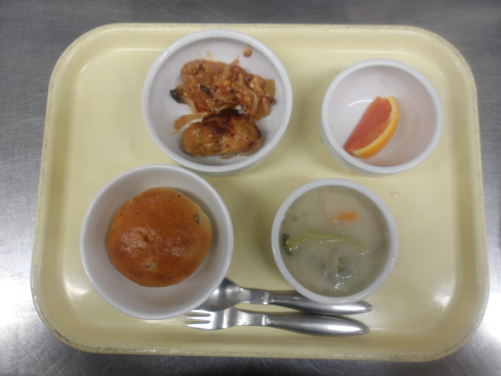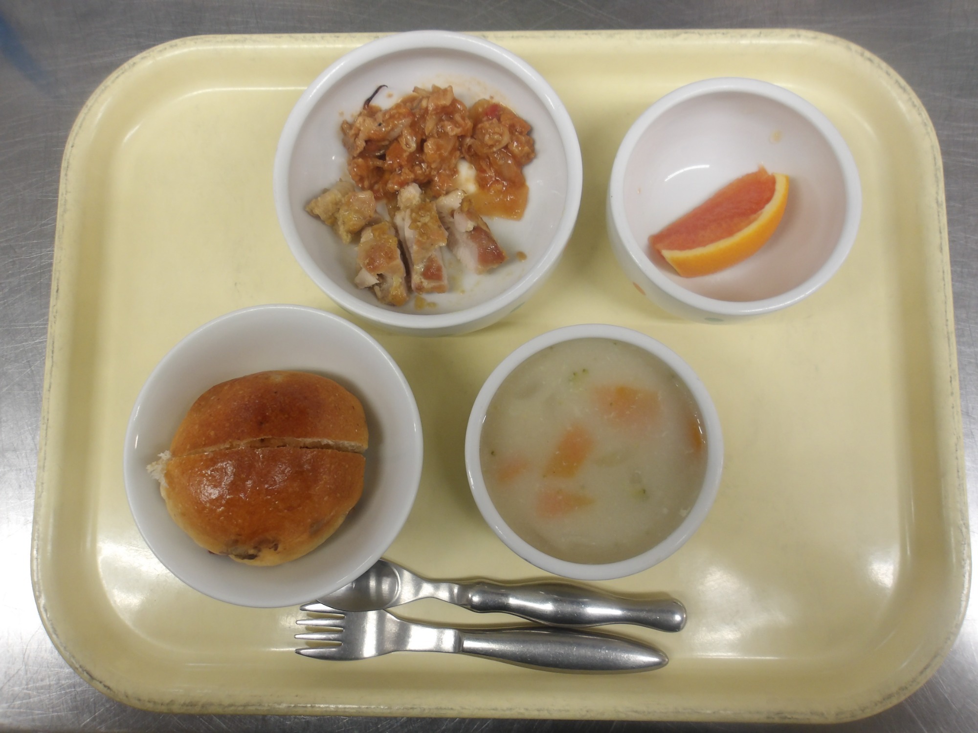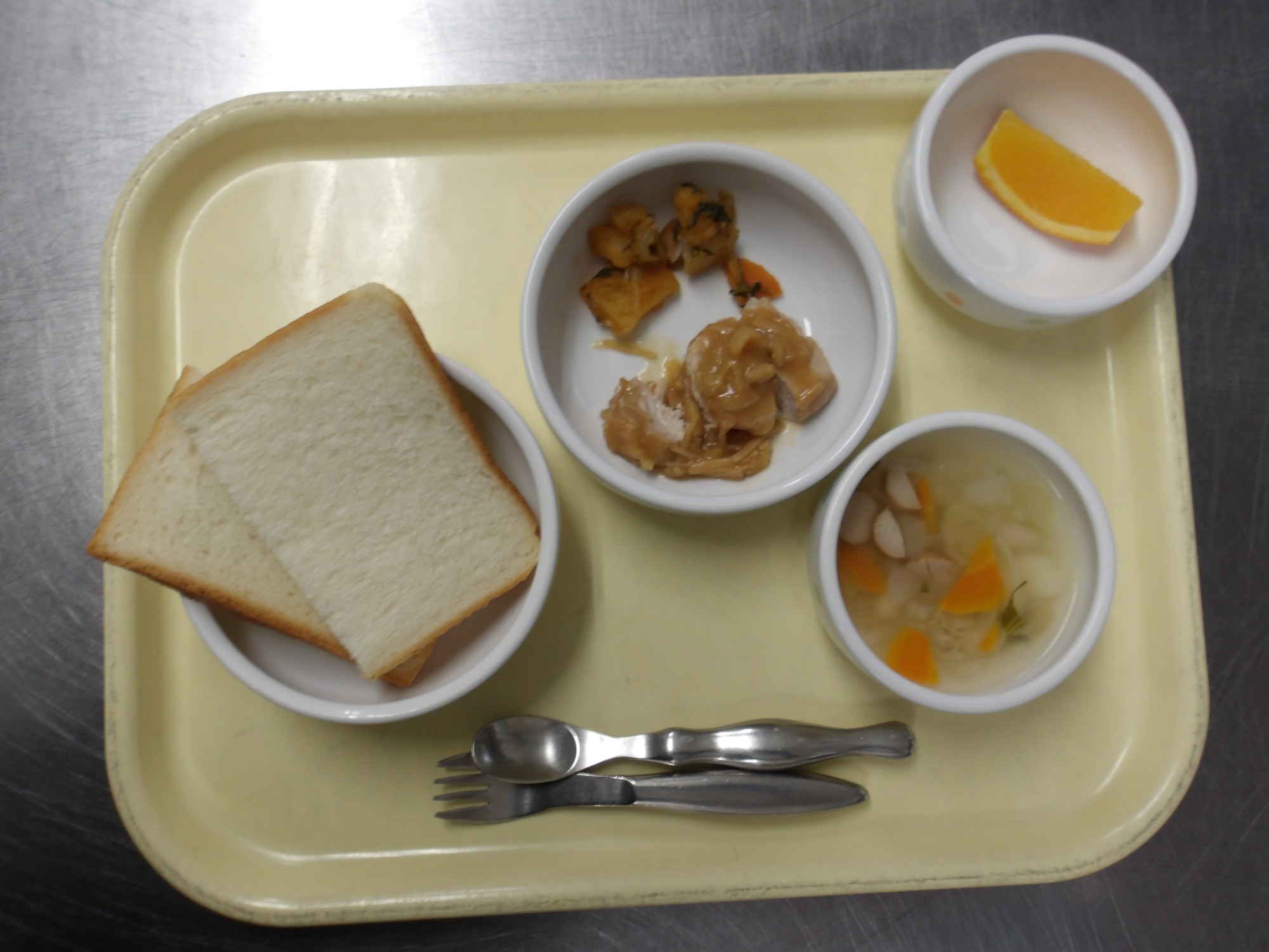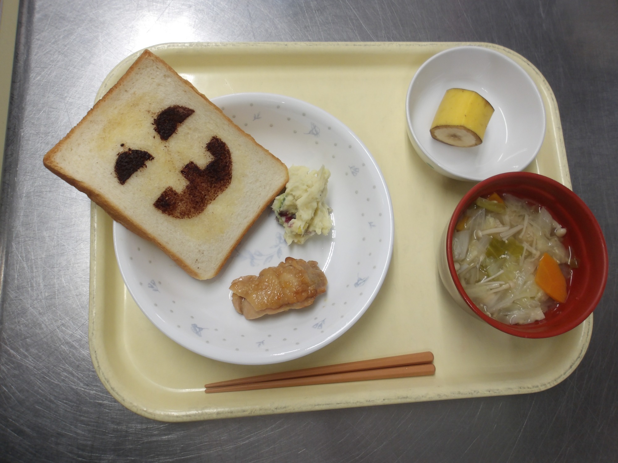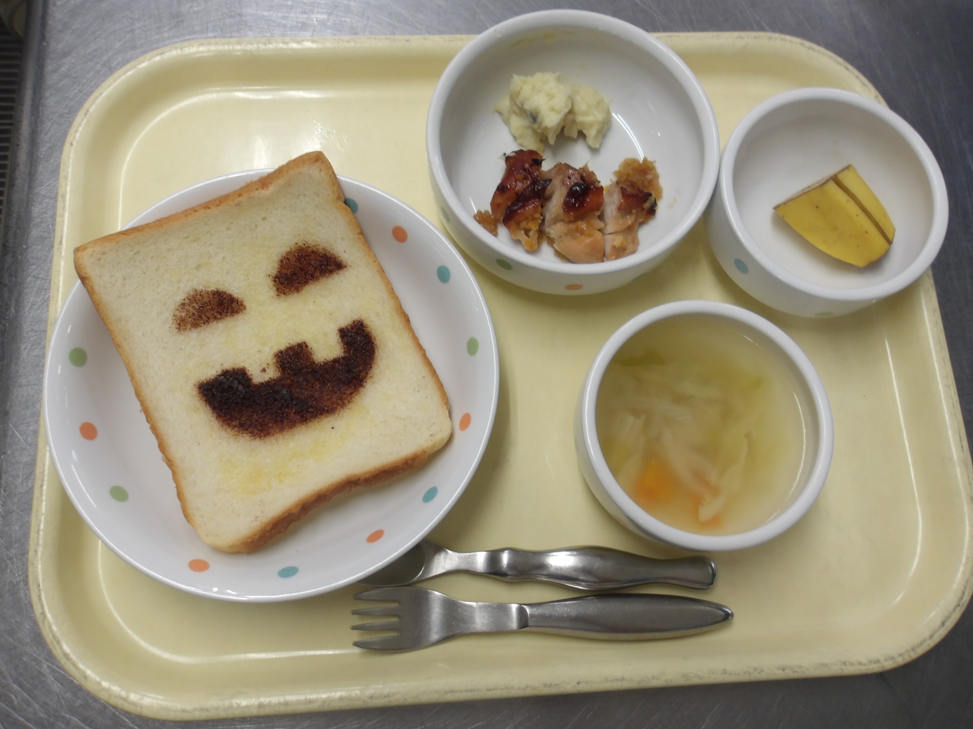 ハロウィントースト ローストチキン みんなが収穫してきたさつまいものサラダ チキンスープ バナナ おやつ:かぼちゃのクッキー