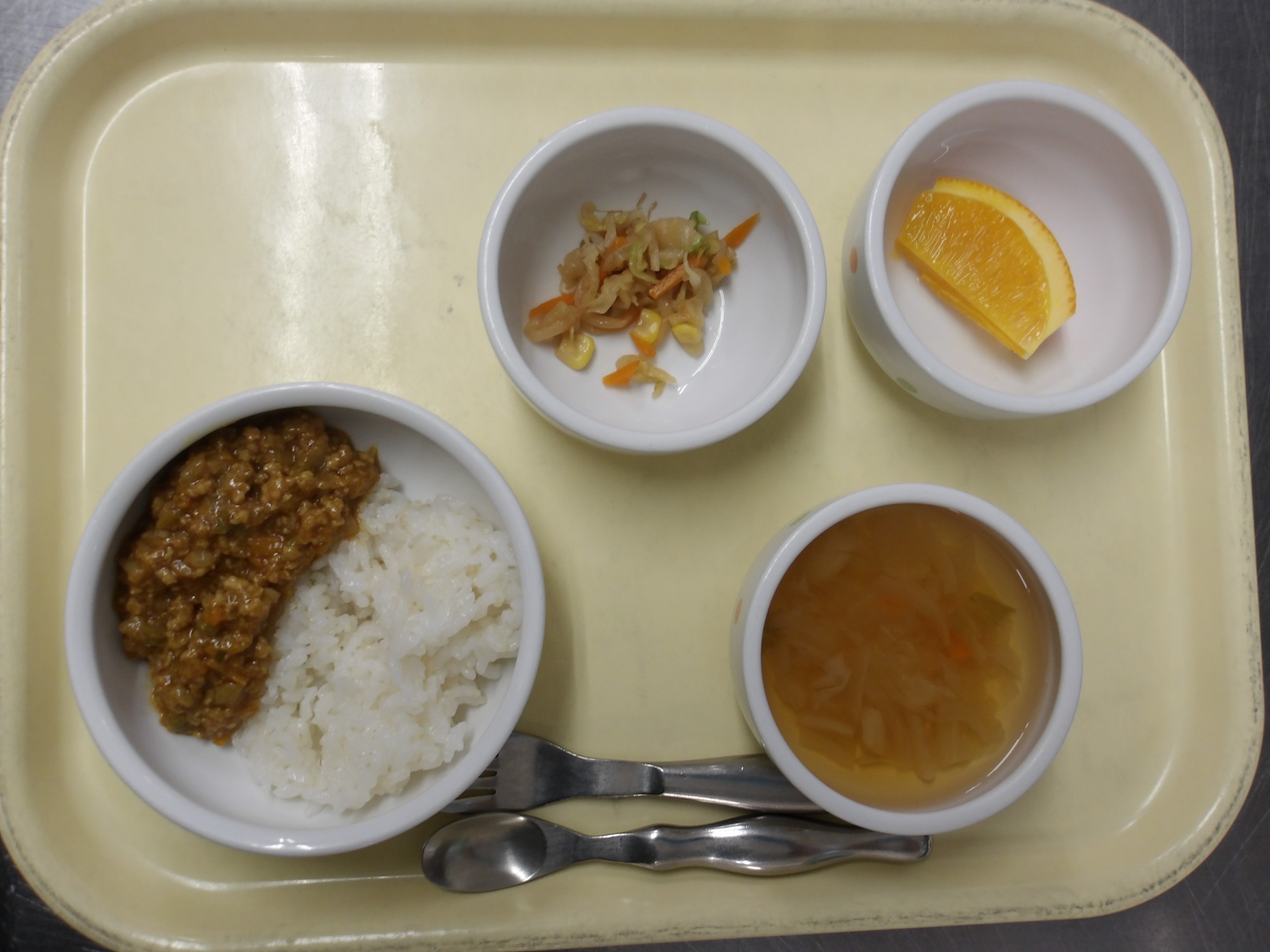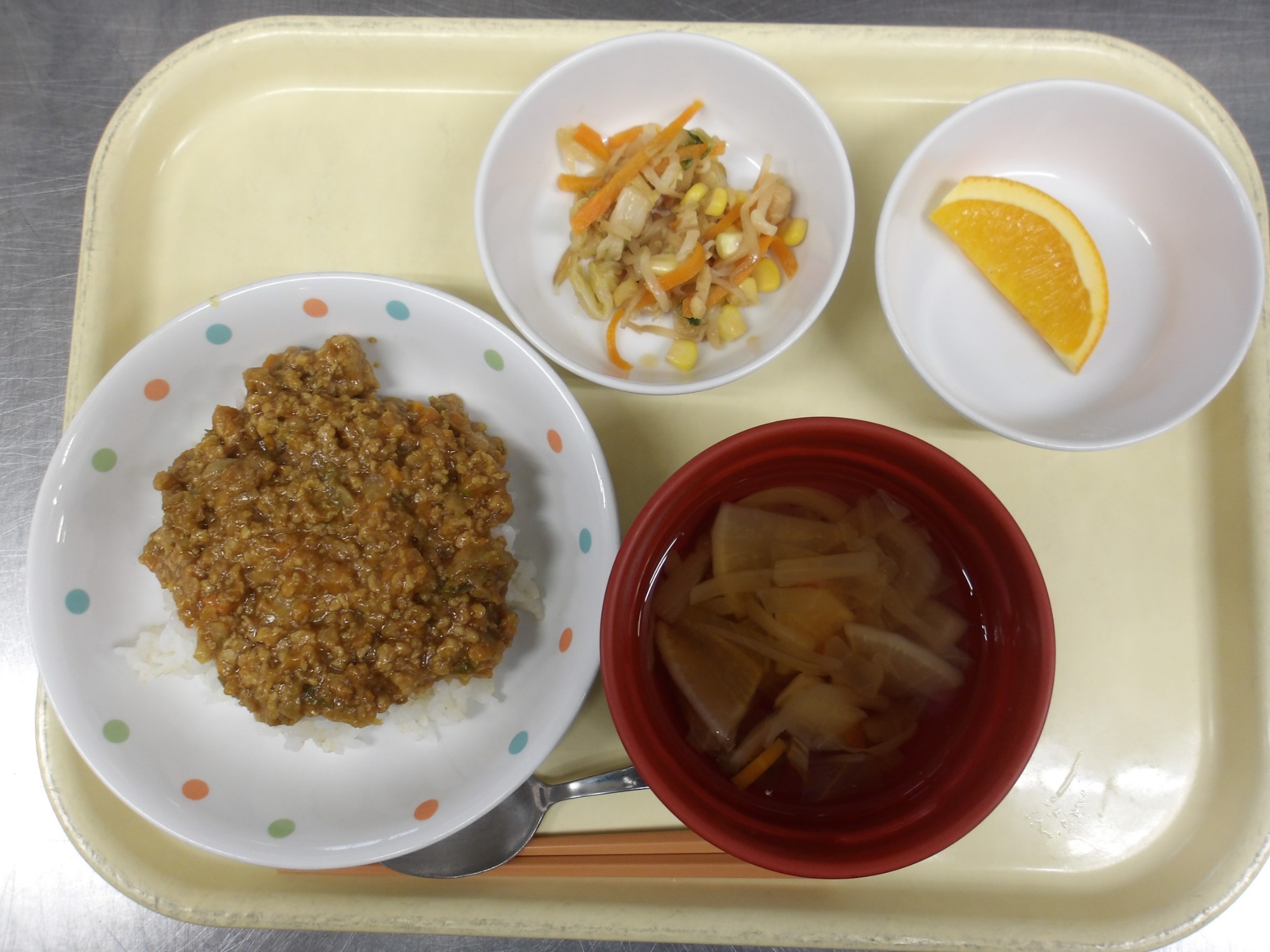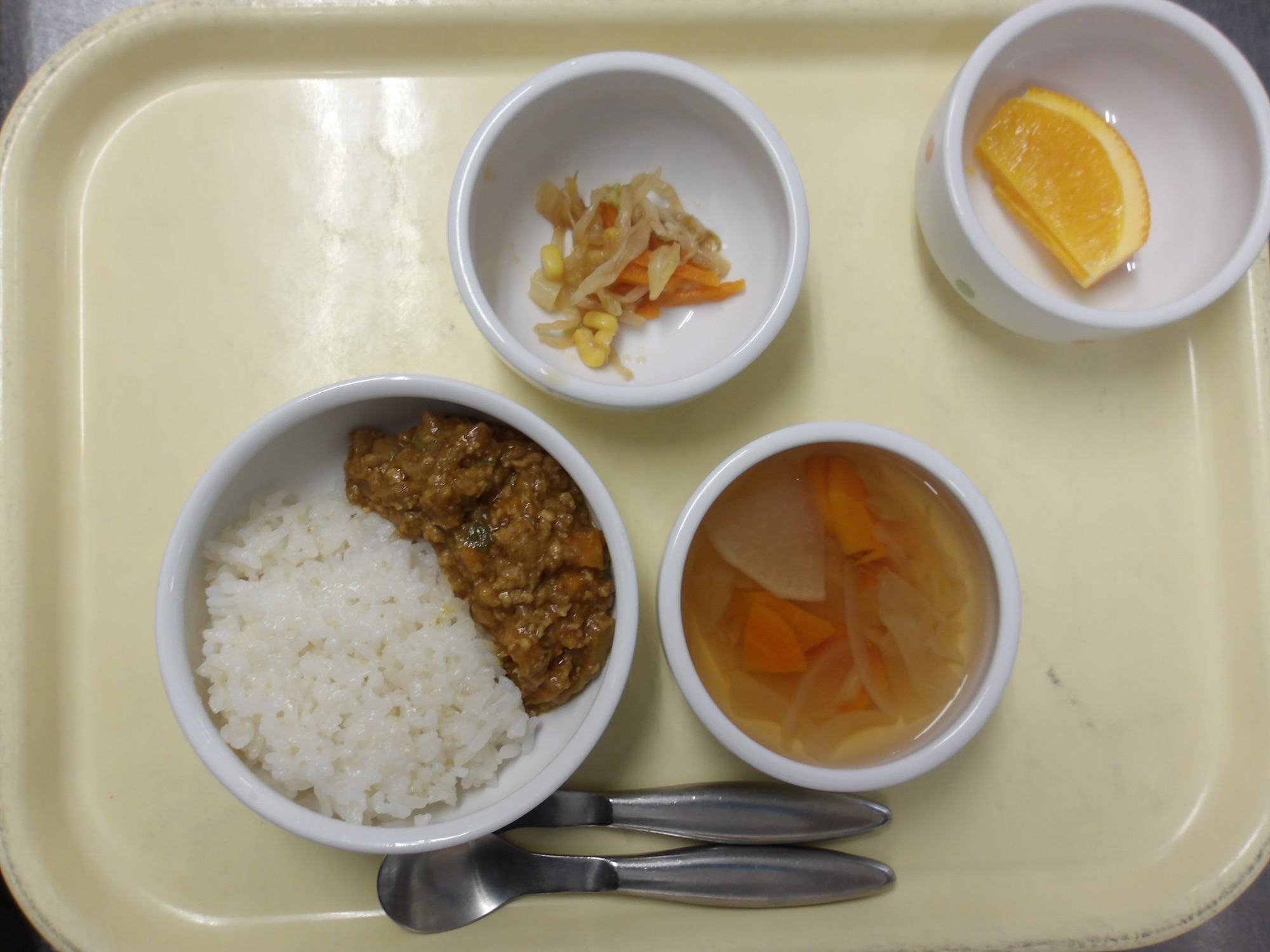 ドライカレーライス もやしのサラダ 野菜スープ オレンジ おやつ:ふかしいも