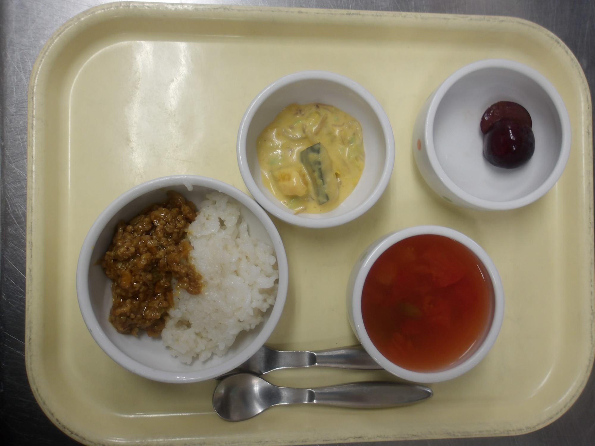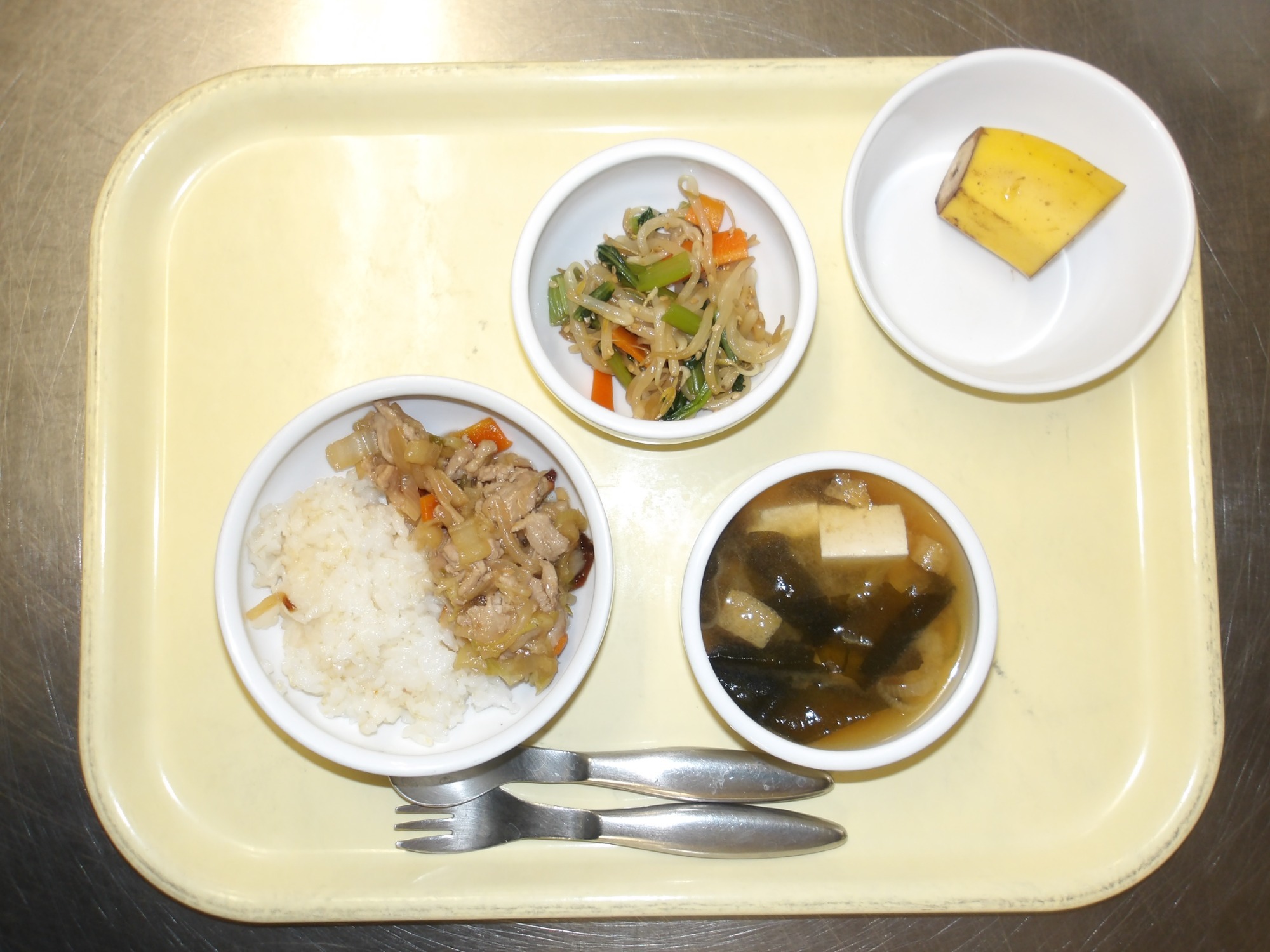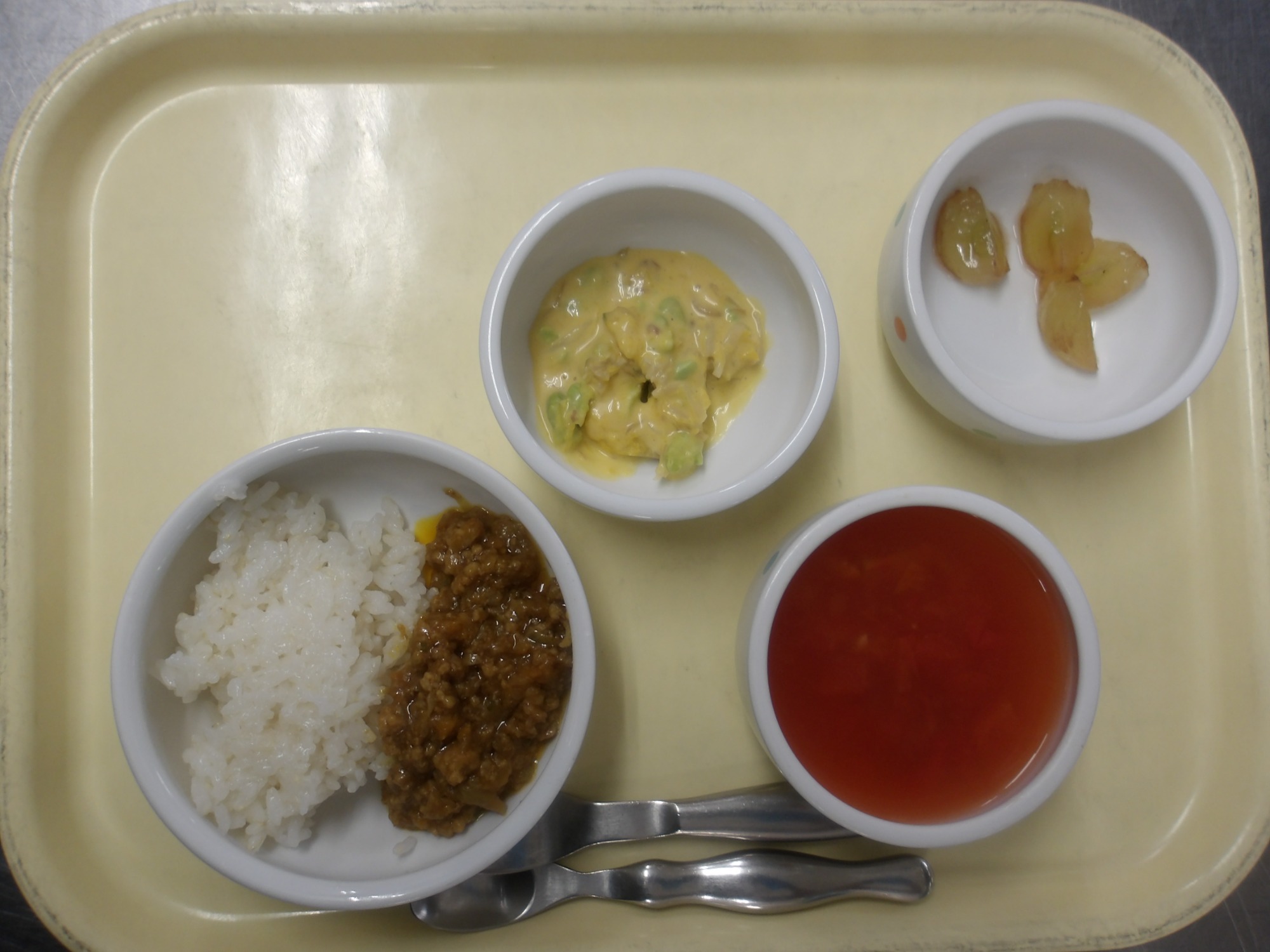 ドライカレーライス もやしのサラダ 野菜スープ オレンジ おやつ:ふかしいも