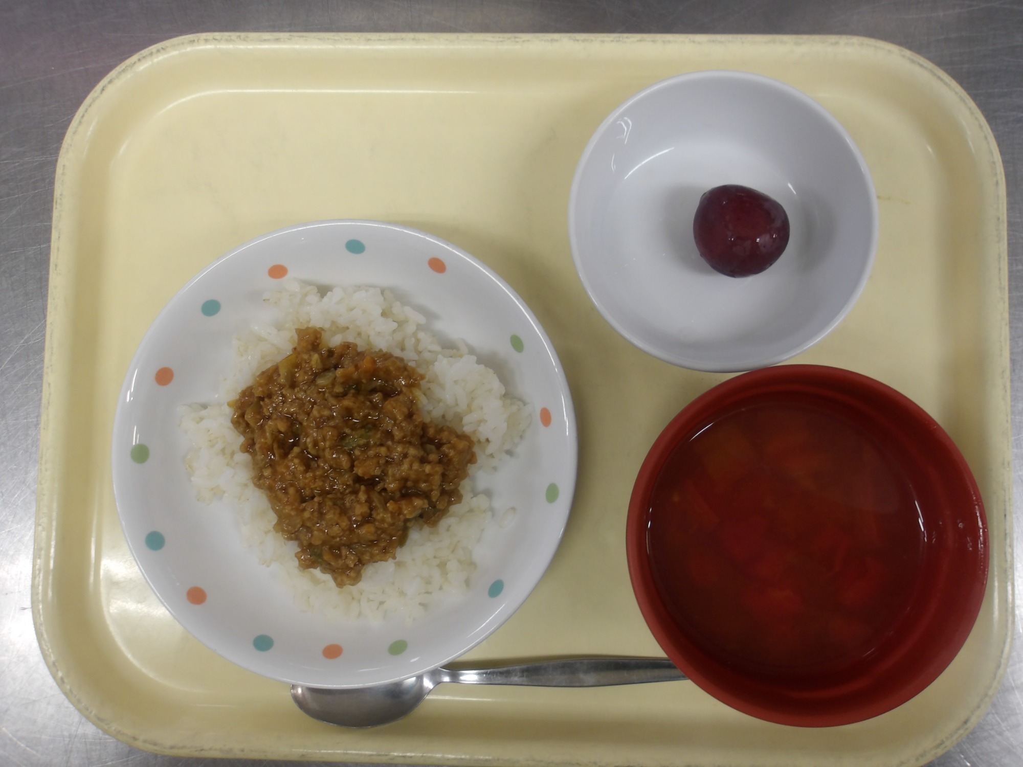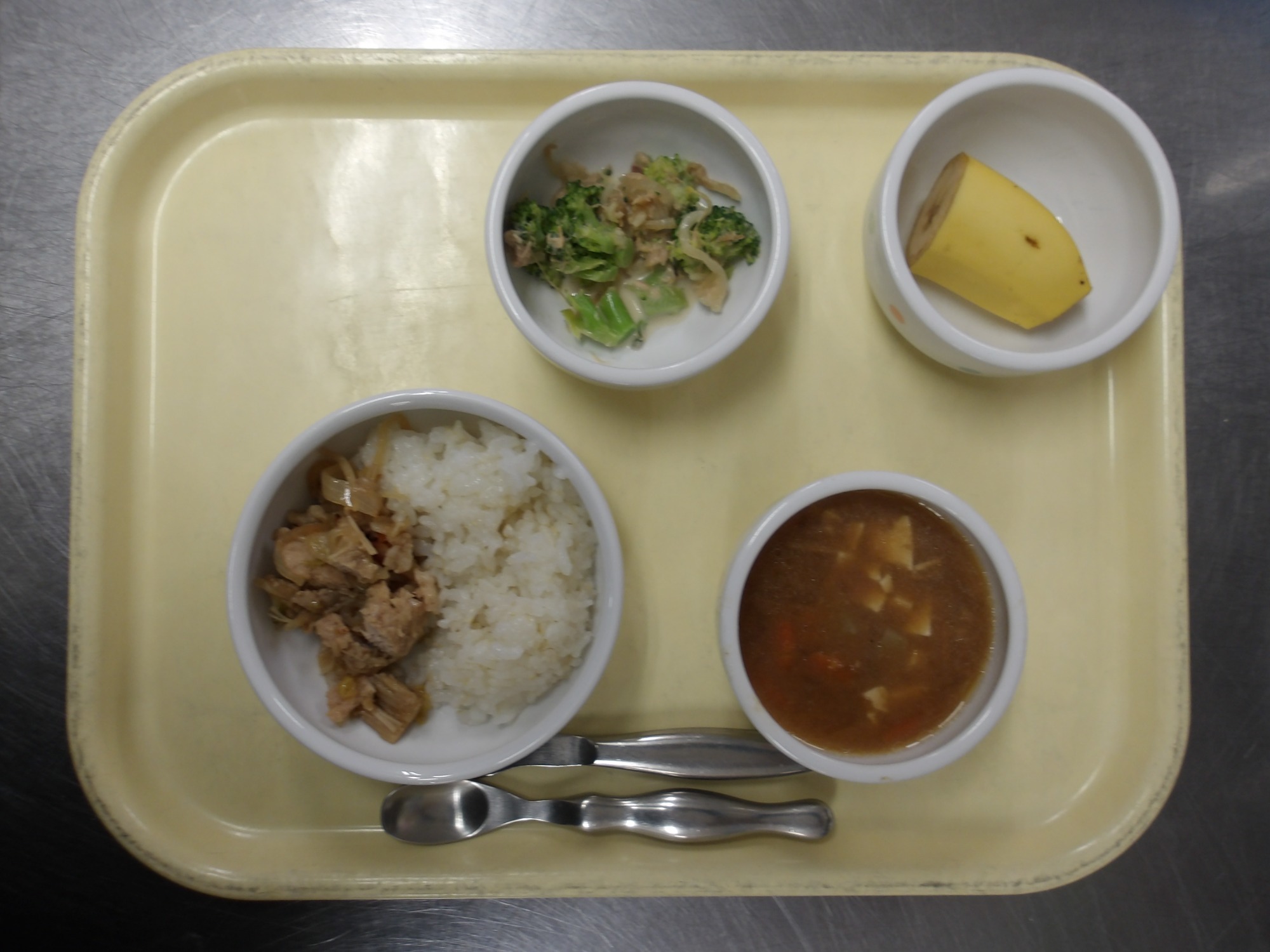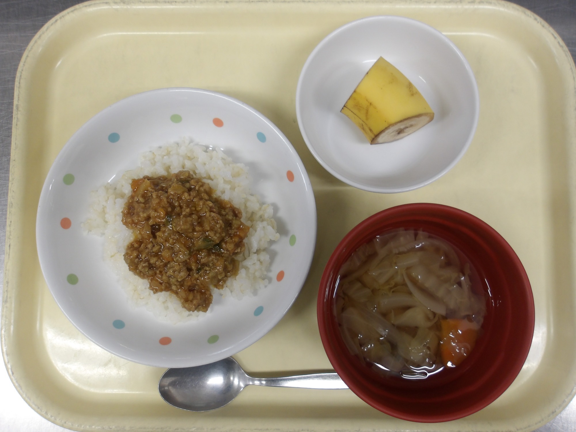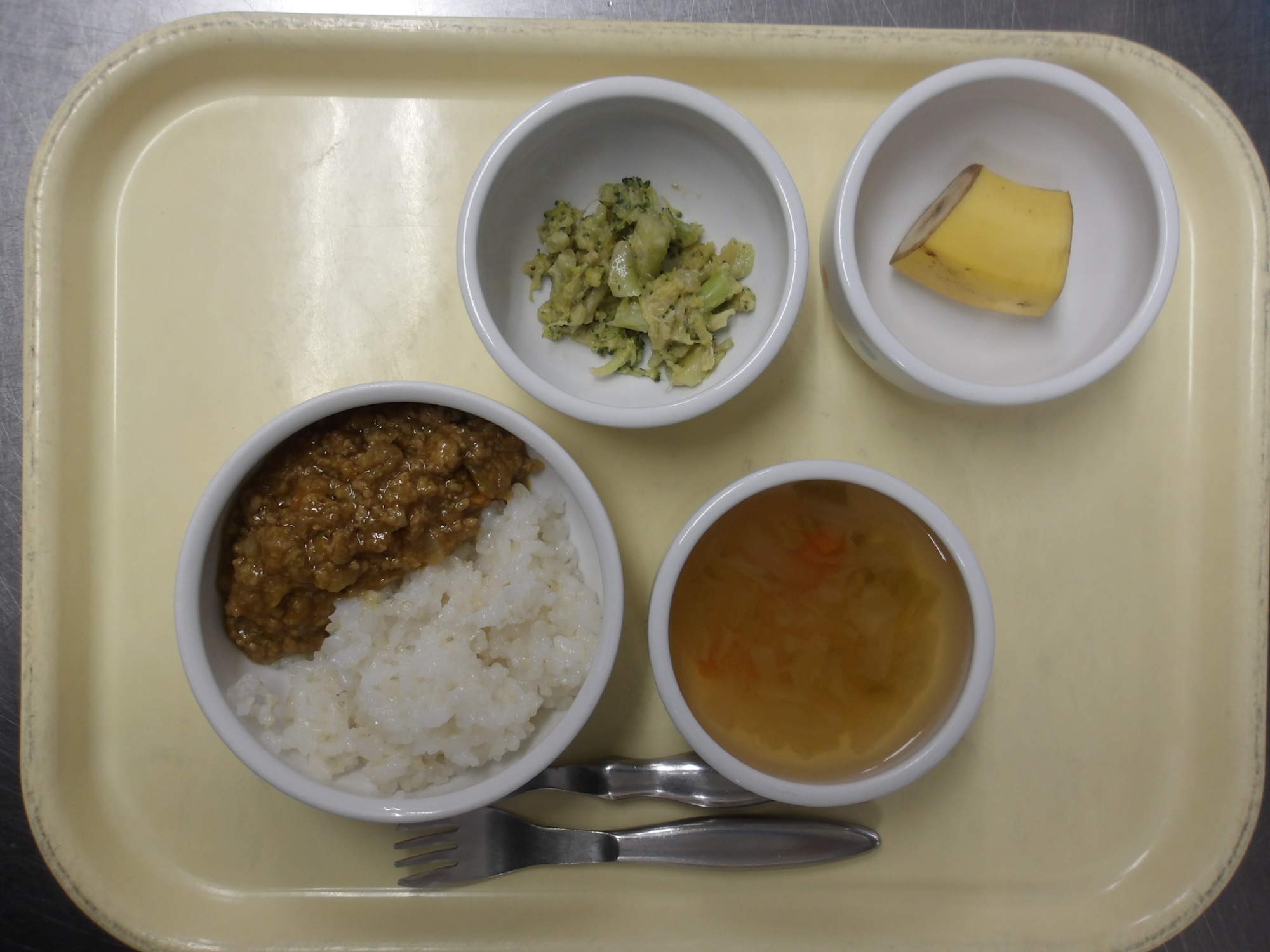 ドライカレーライス 野菜スープ バナナ ナーサリー:ブロッコリのサラダ おやつ:五平餅