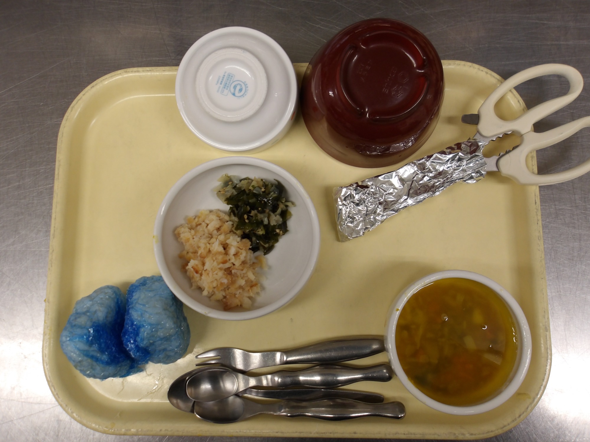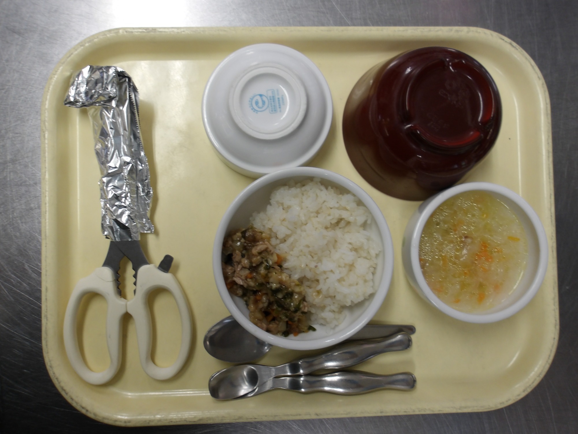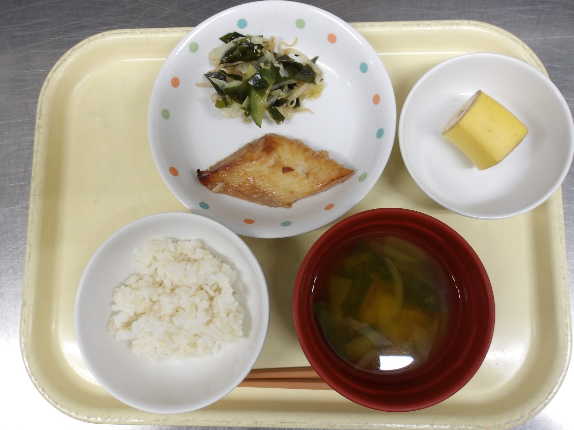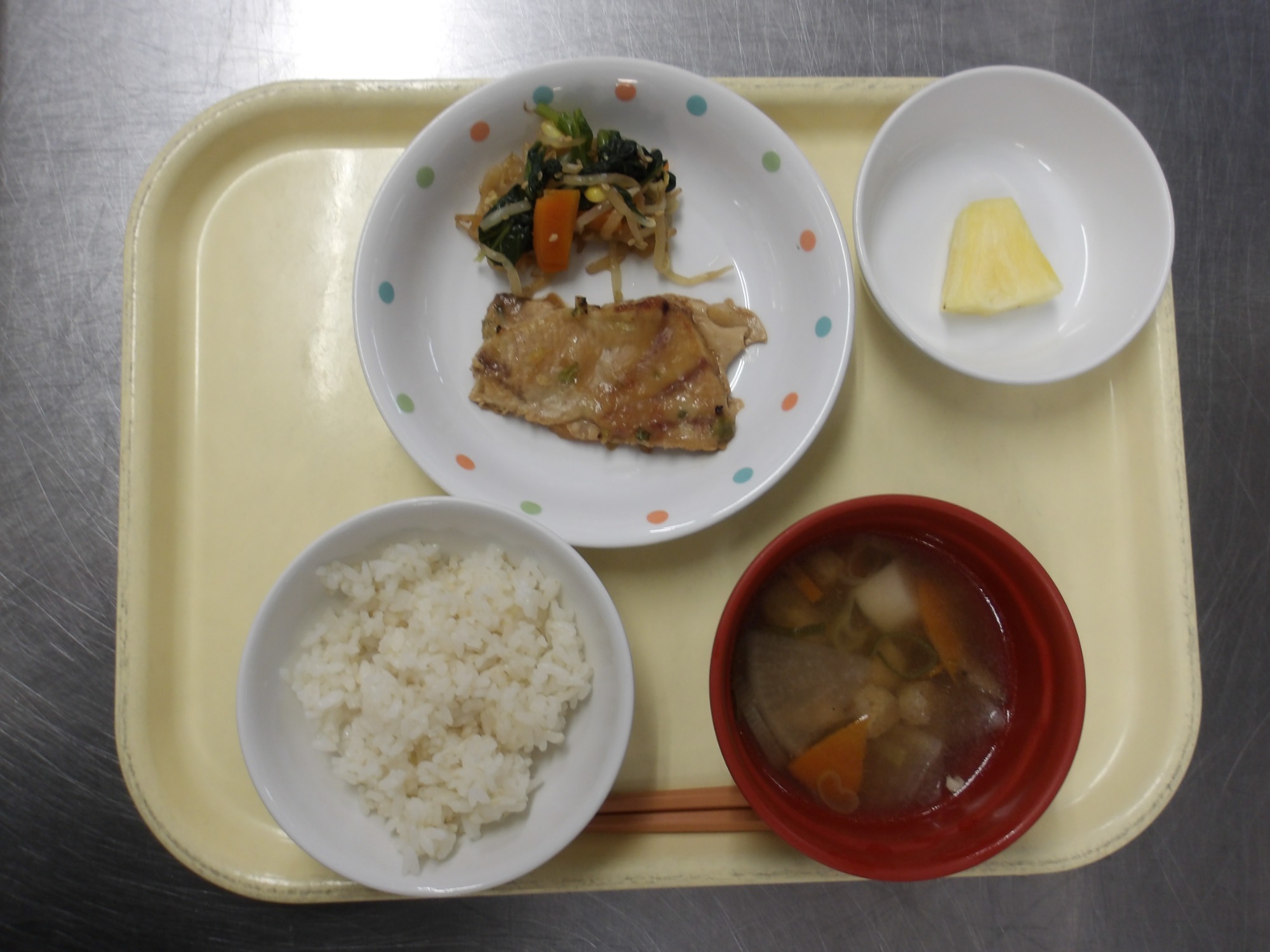 えのきたけと白菜が一緒に入ったみそでしたがみその濃いめの味付けと一緒に野菜をよく食べている様子でした。みそは、材料を発酵させて作った発酵食品です。お腹の中から調子を整えてくれます。