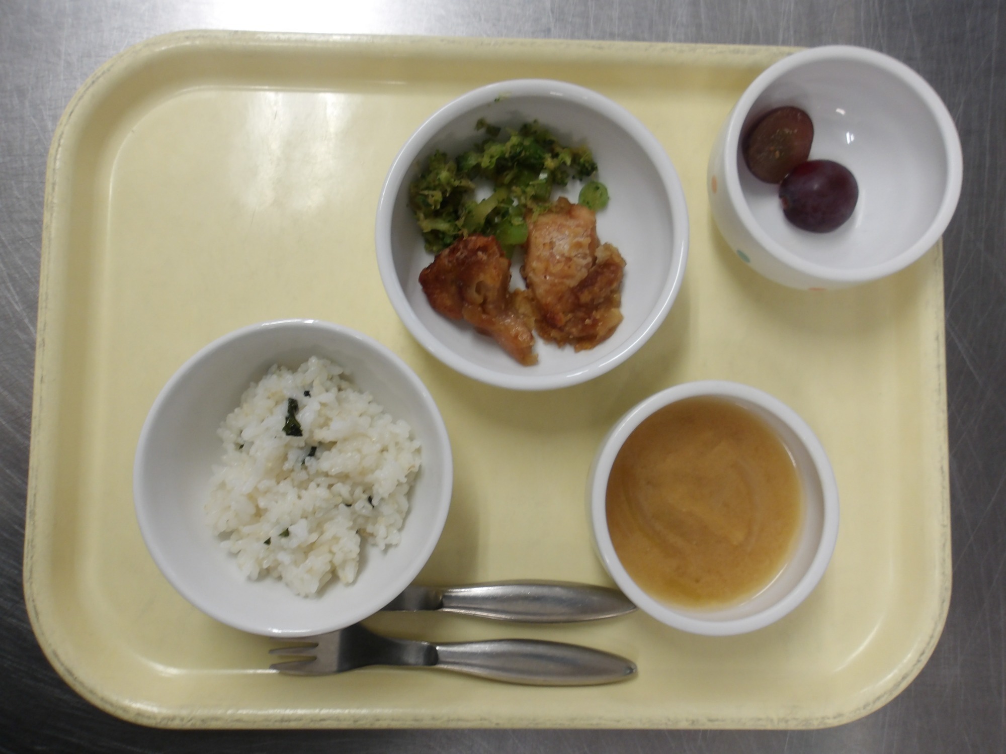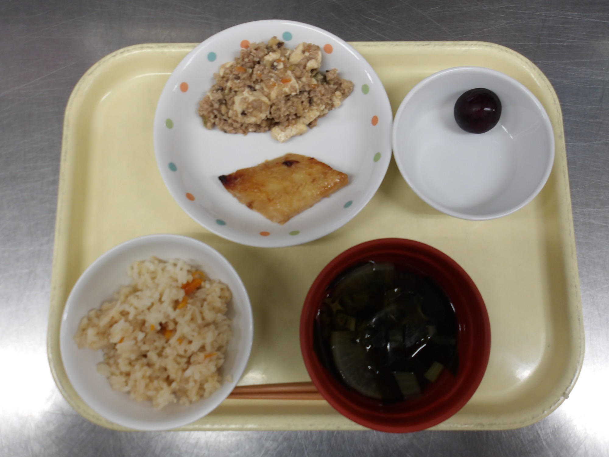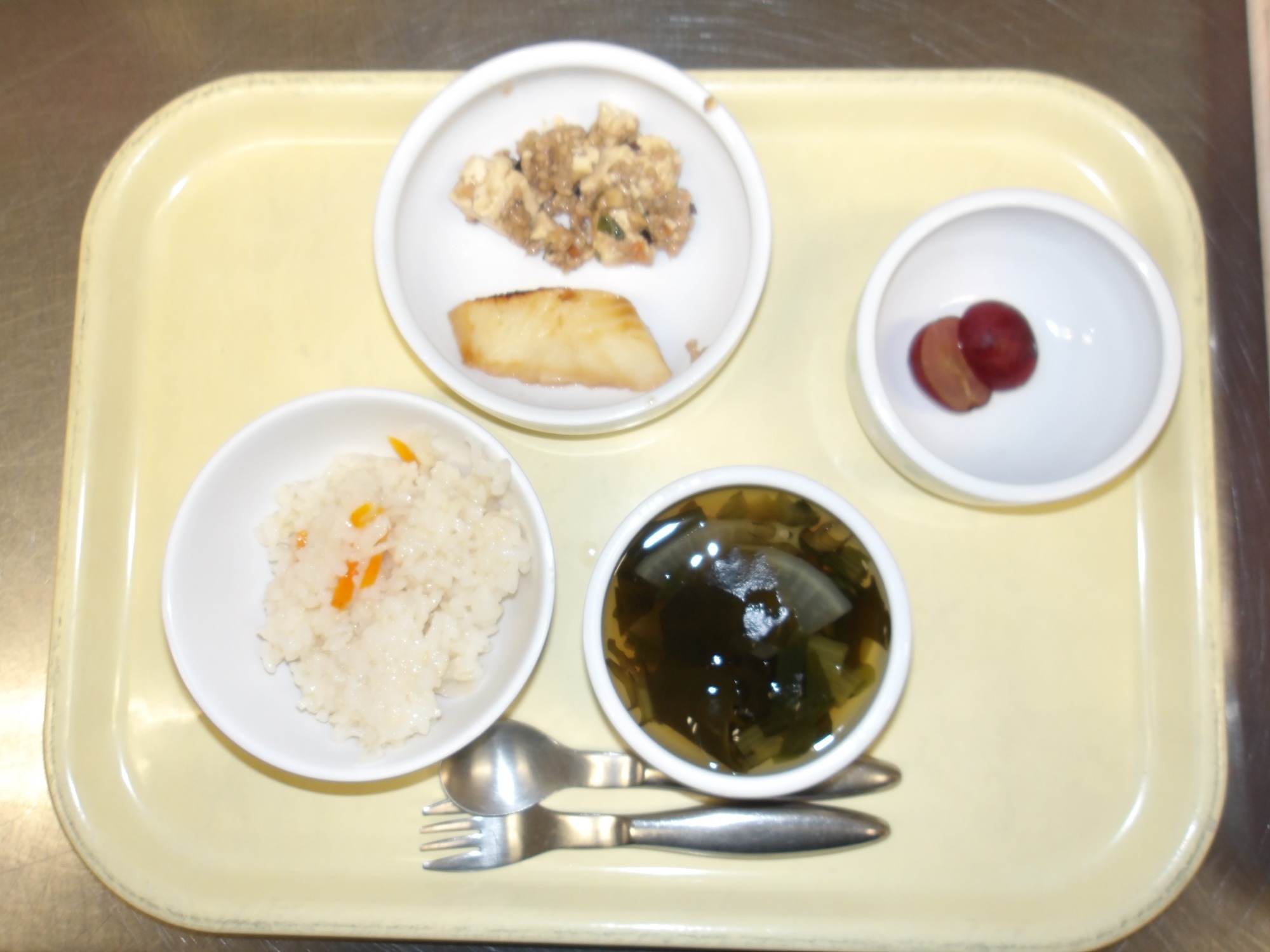 はりはりご飯 マーボー豆腐 カレイのつけ焼わかめ汁 巨峰 おやつ:おからクッキー