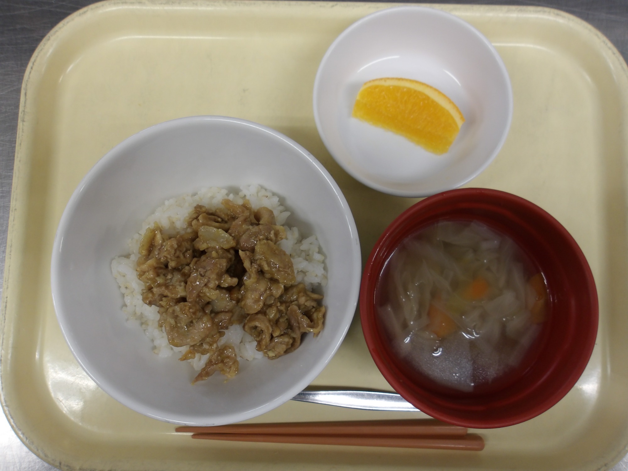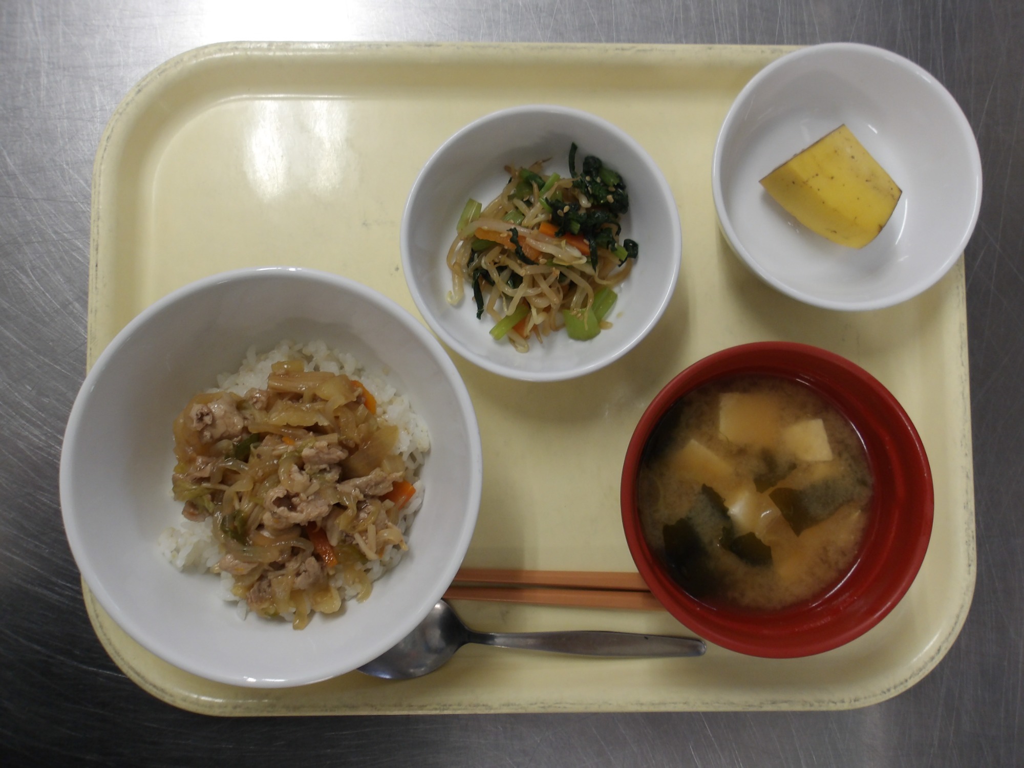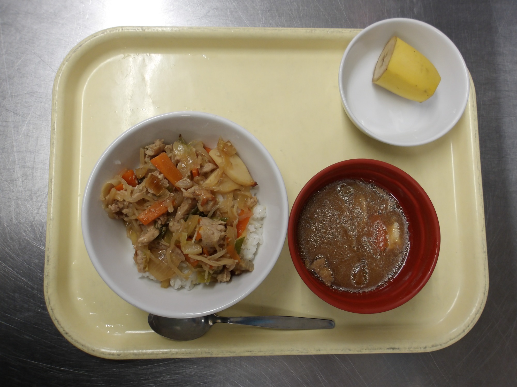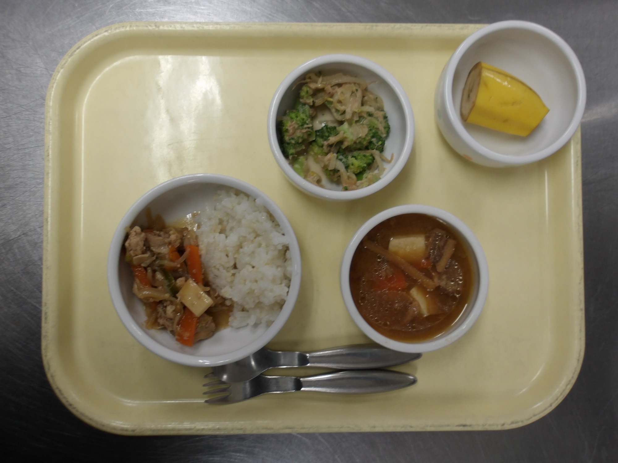 すき焼き風どんぶり 備蓄用食材の豚汁缶 バナナ ナーサリー:ブロッコリーサラダ おやつ:ツナトースト