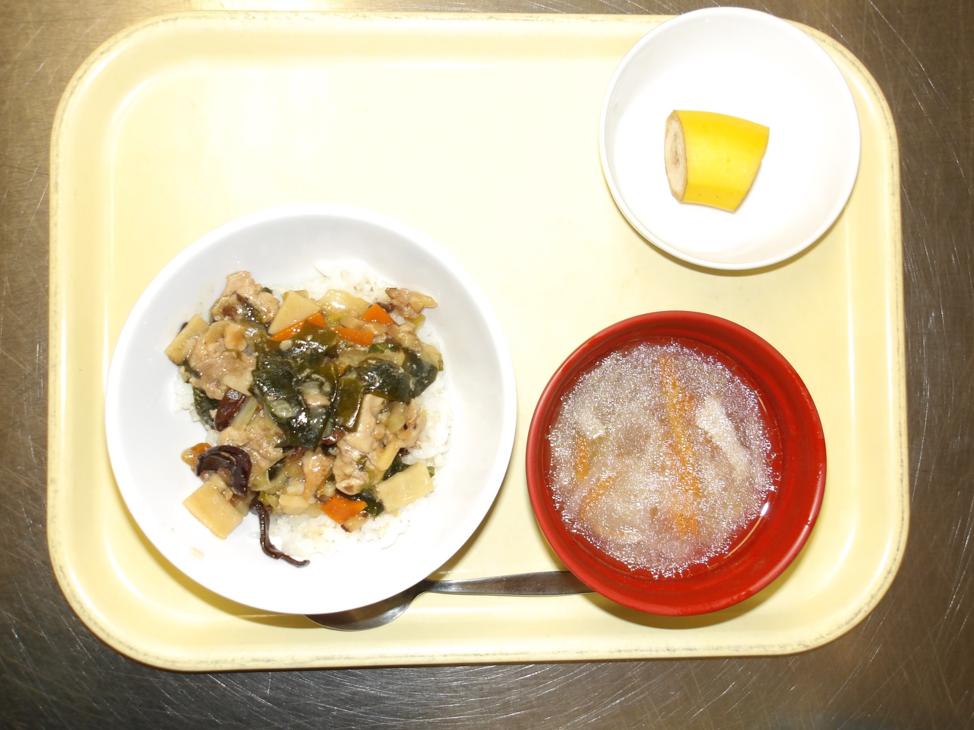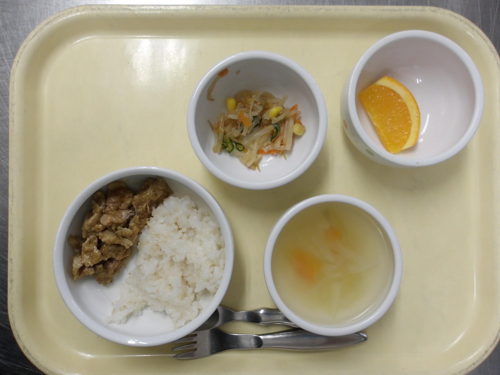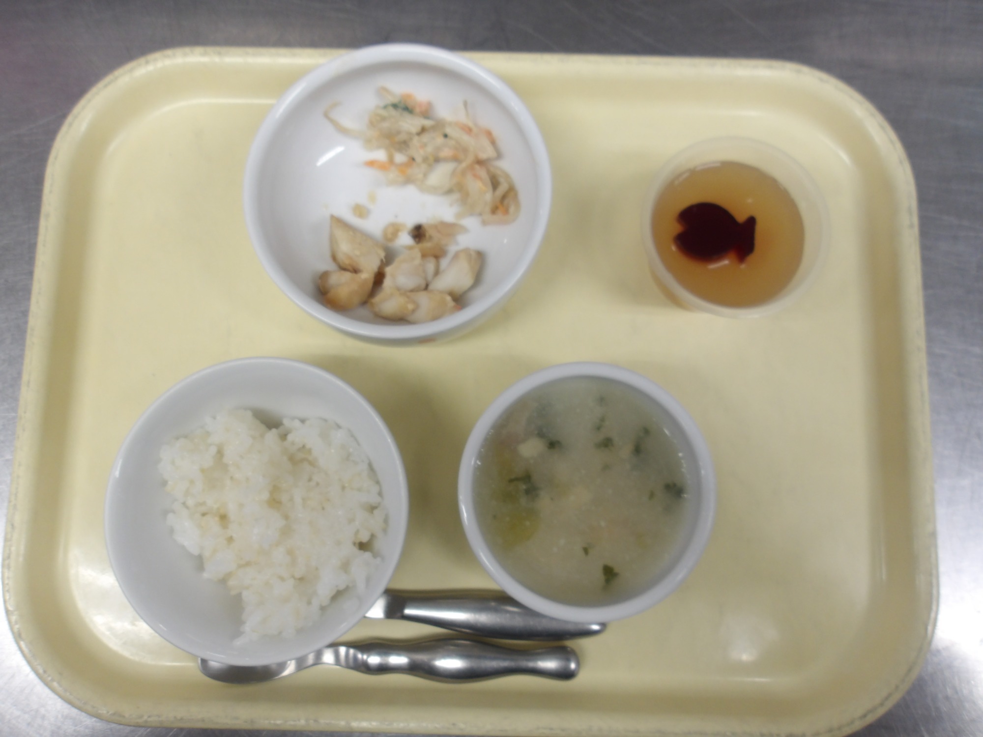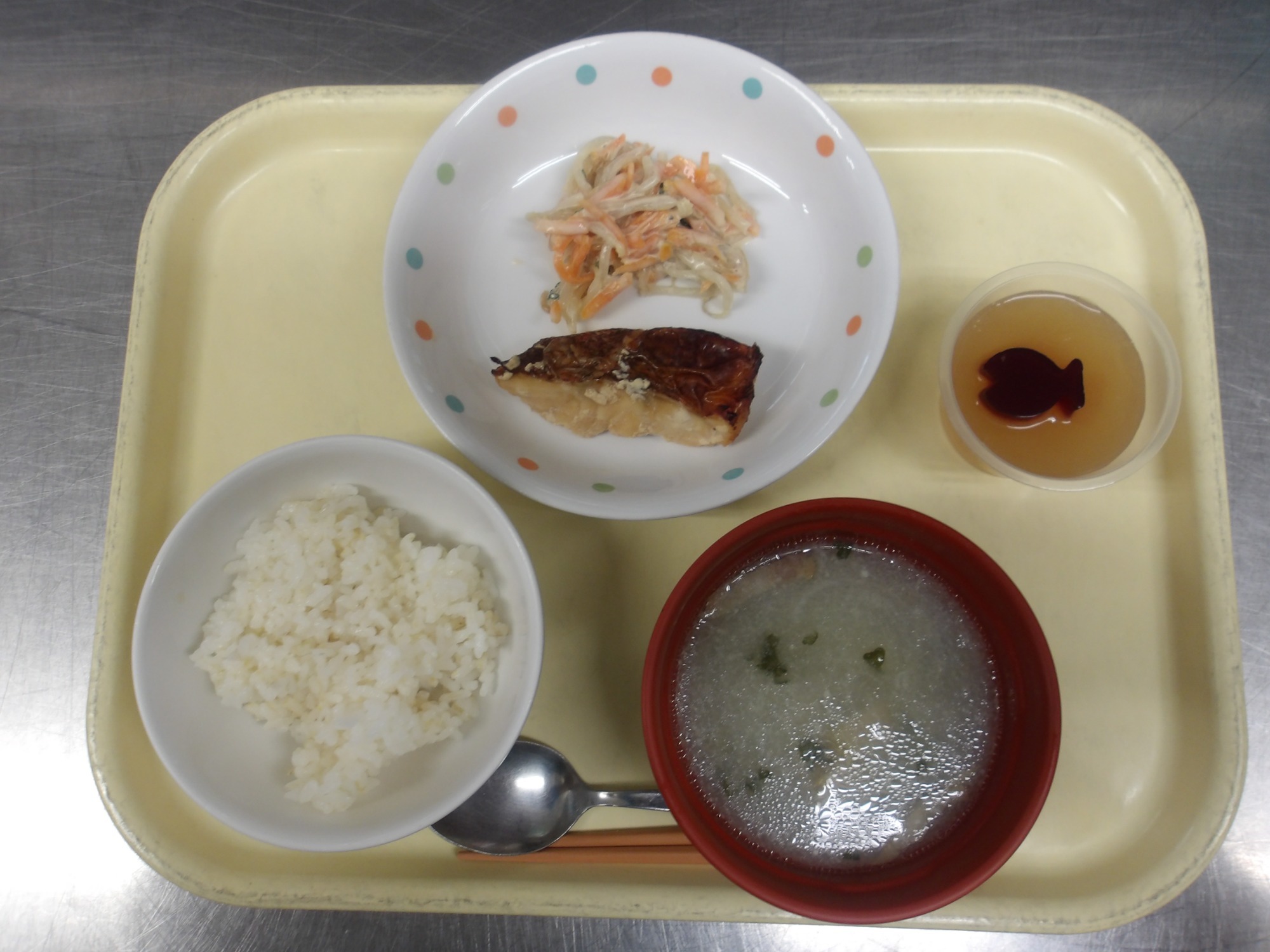 ごはん めばるの照り焼き にんじんサラダ 凍り豆腐のスープ きんぎょがにげた!ゼリー
