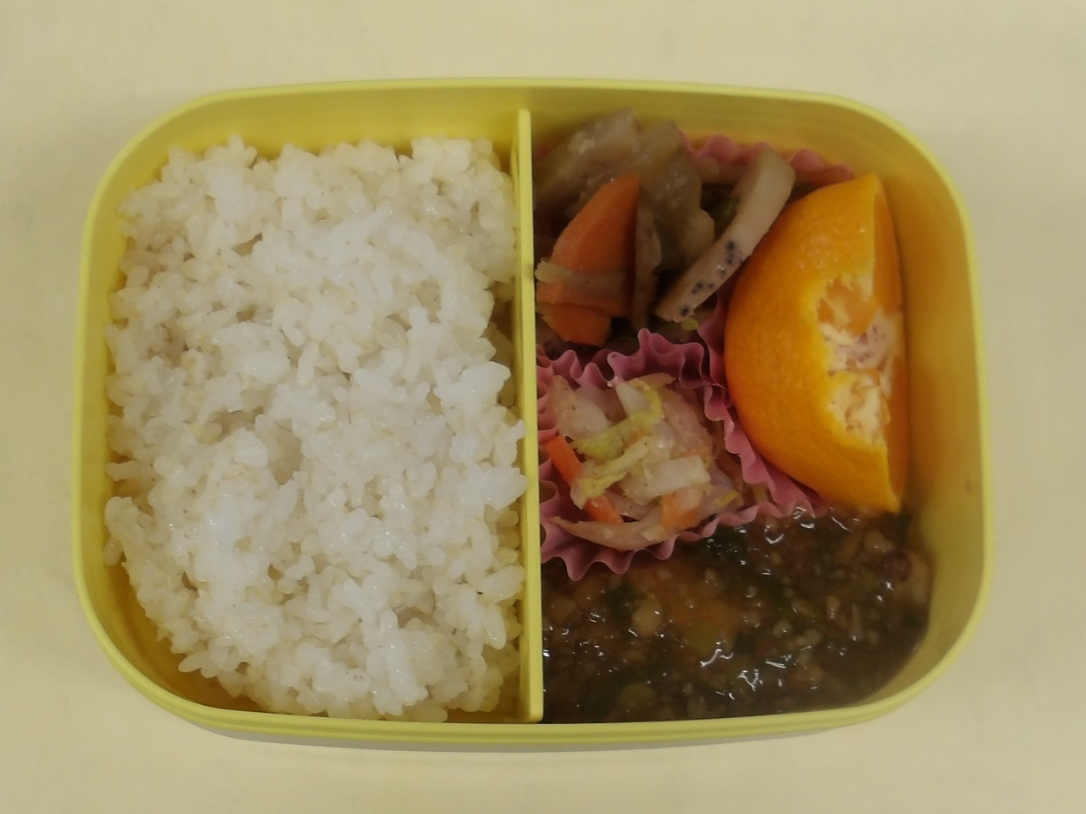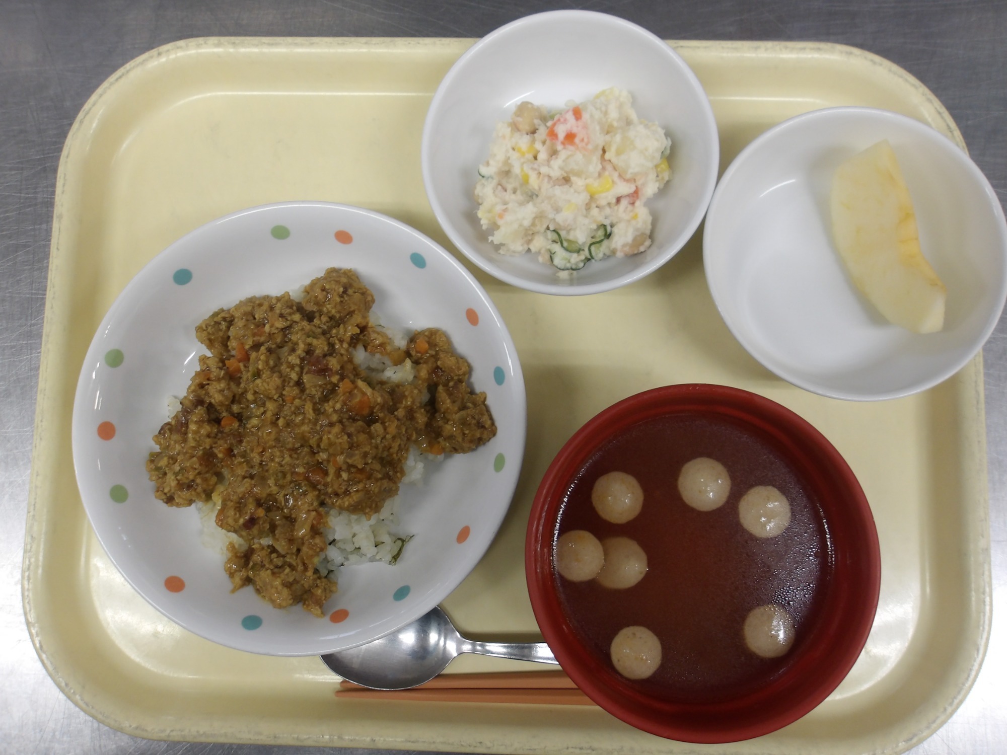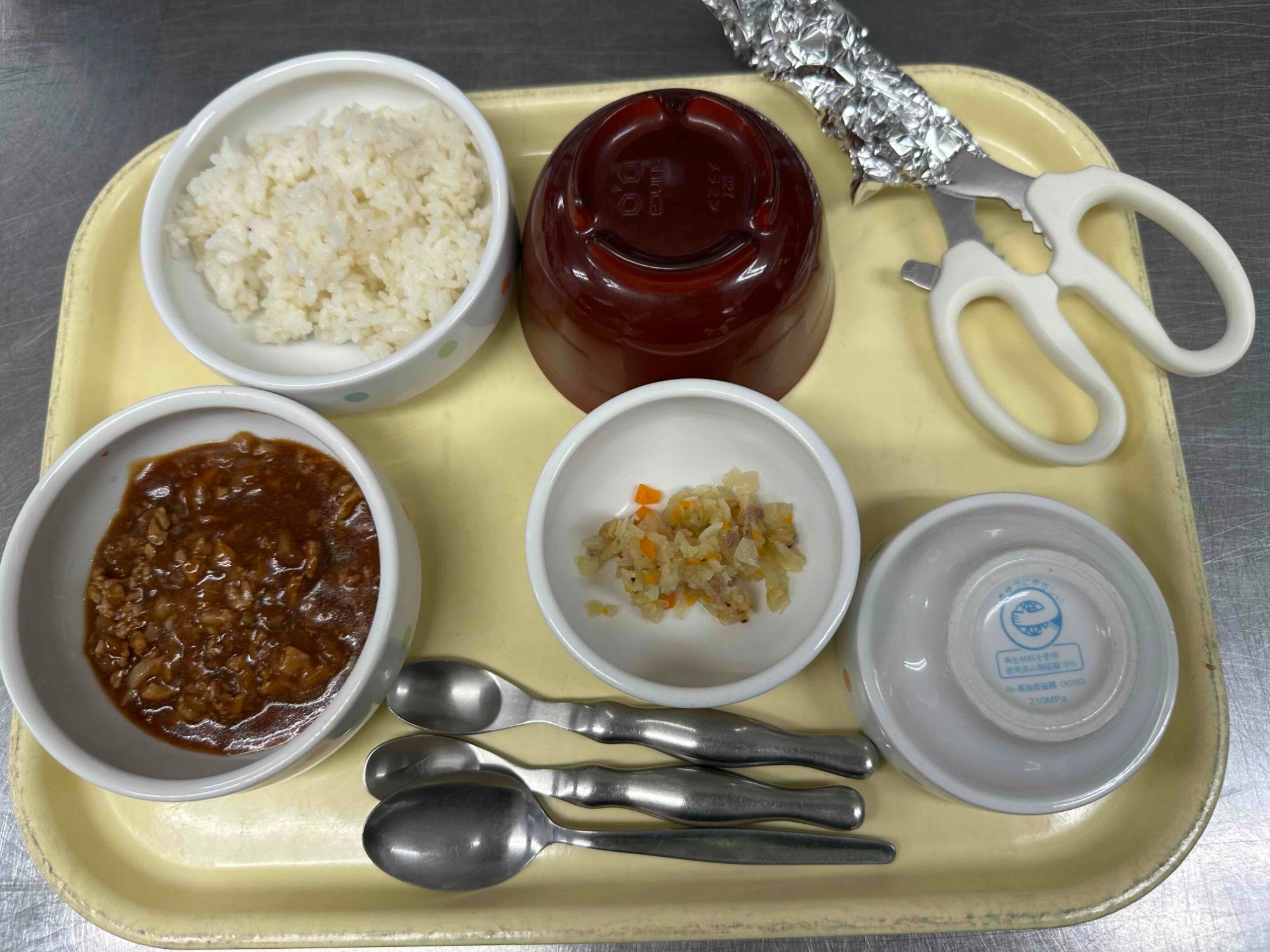 マーボ―豆腐には、凍り豆腐も一緒に入っていました。栄養素がぎゅっと凝縮されてカルシウムたっぷりの食材です。当園の給食はパン以外に牛乳・乳製品、たまご、小麦粉を使った食材やそのものを使いません。そのため不足しがちなカルシウムやタンパク質をほかの食材から摂るようにしています
