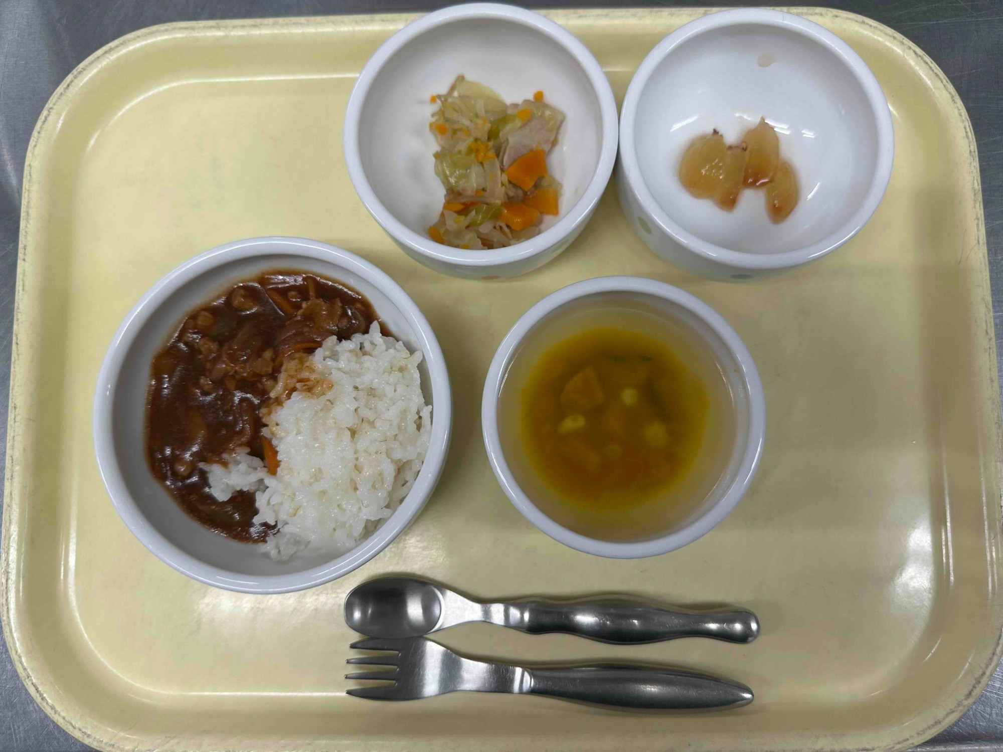 うさぎ組(1歳児クラス)は、柿を半分にカットしてかじり取りやすいようにしています。また、カレーも豆乳をいれてまろやかに。 もりもり食べたらしく、ご飯のおかわりにきましたね♪カレーはおいしいね!!