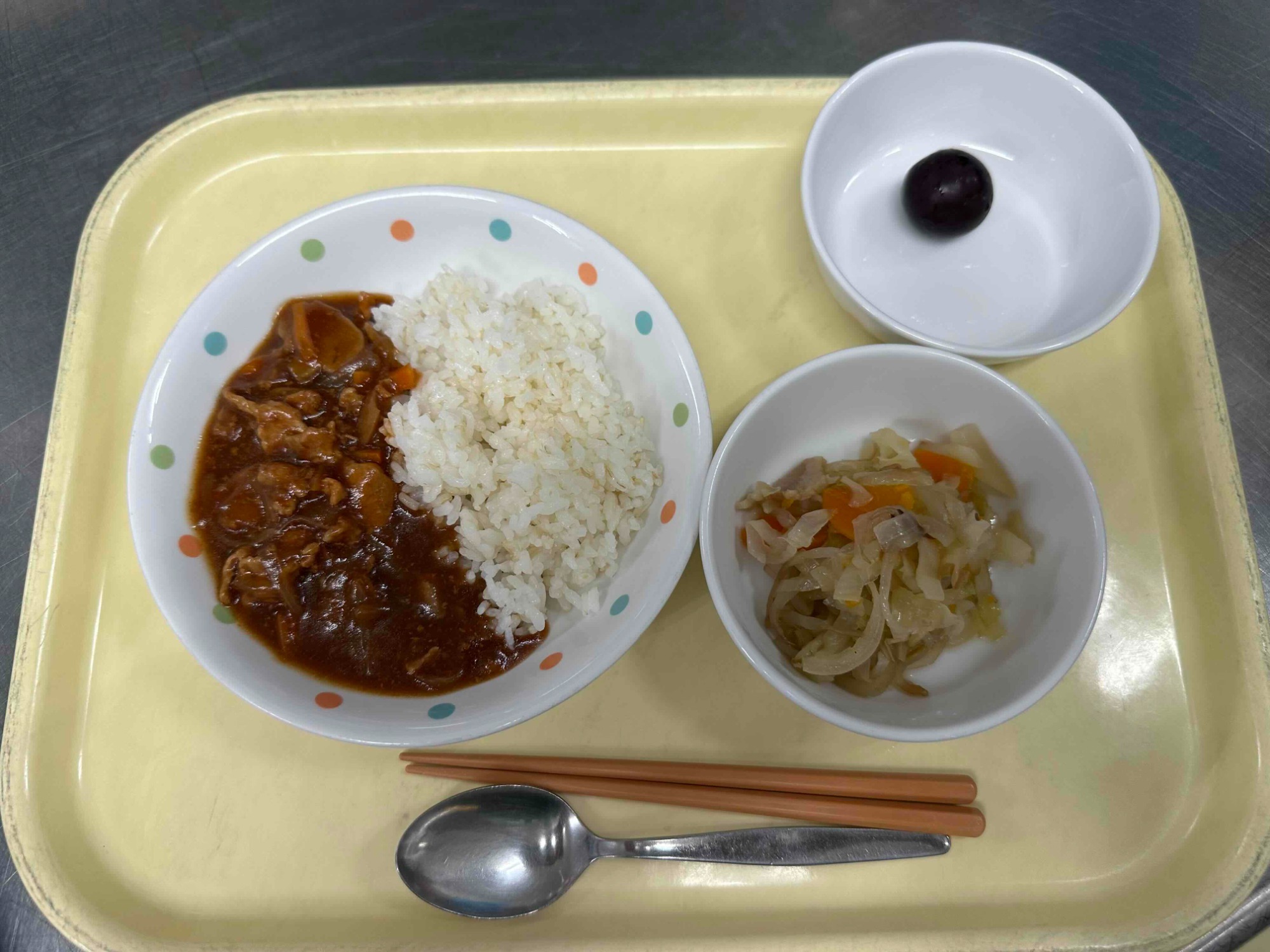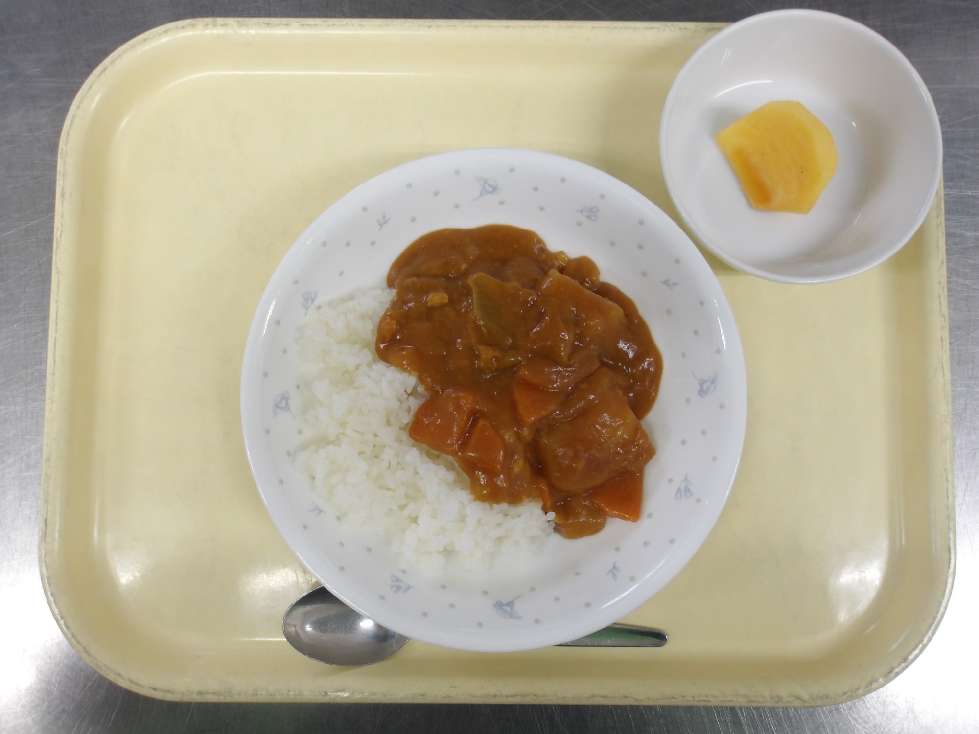 さふらんカレー 柿 40年近く続いているさふらんカレー!最初は保護者の方が作ってくださっていました。 職員が引き継ぎ、今の味になりました♪