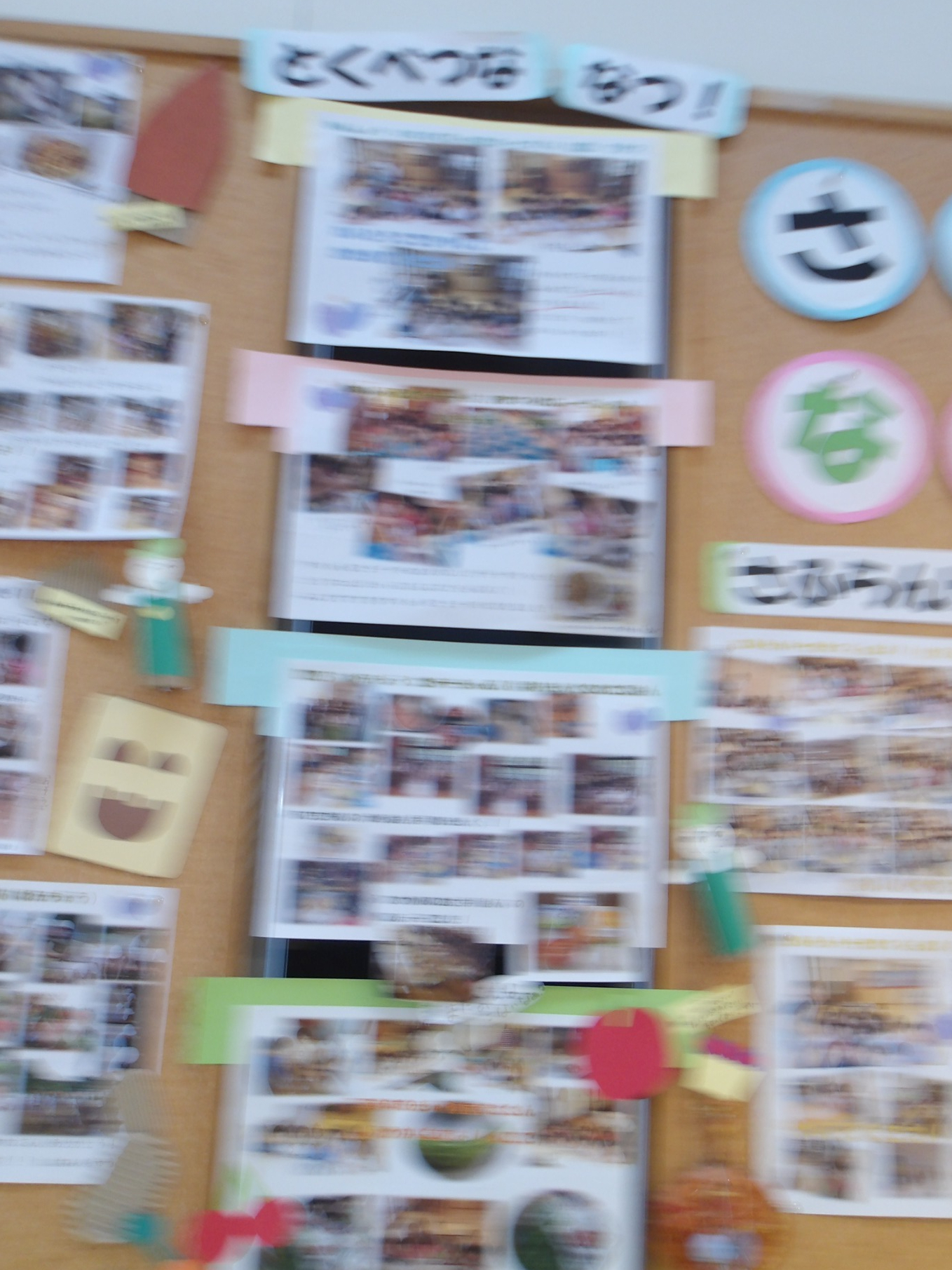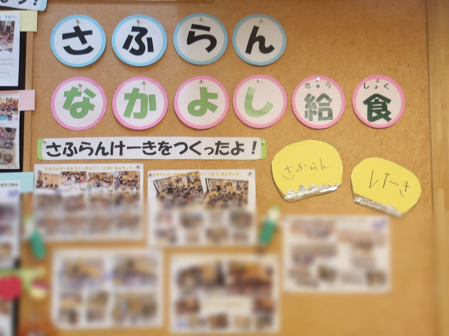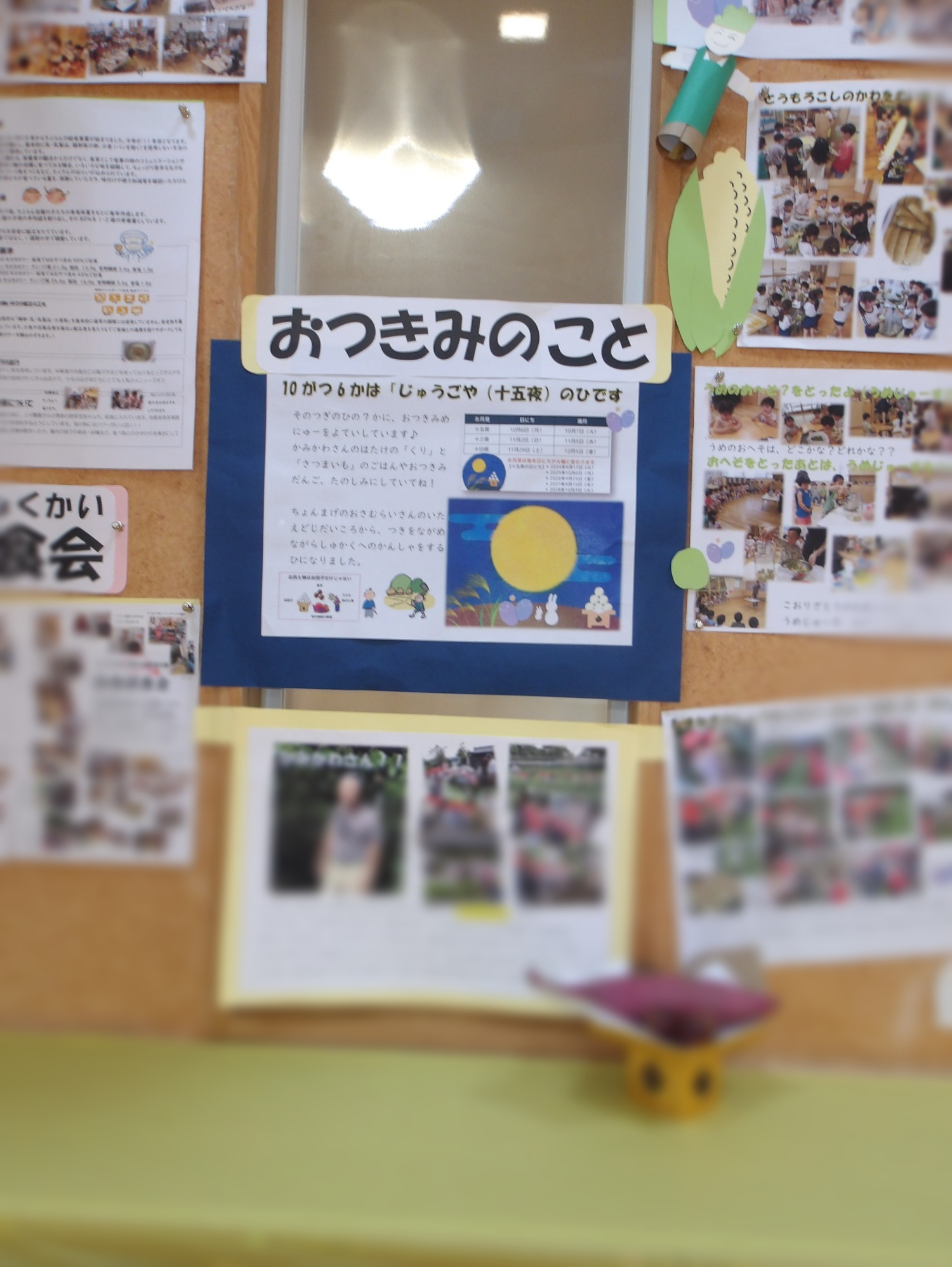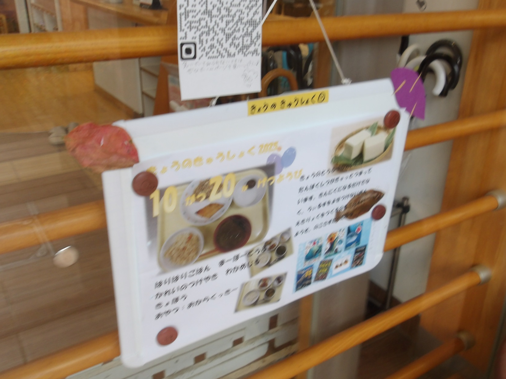 こちらは正面玄関に掲示の今日の給食です。 展示の高さは年長さんぐらいの子が背伸びしなくても抱っこしなくても園にお迎えの時に見られる高さにし、給食についてを語らえる場にしています。