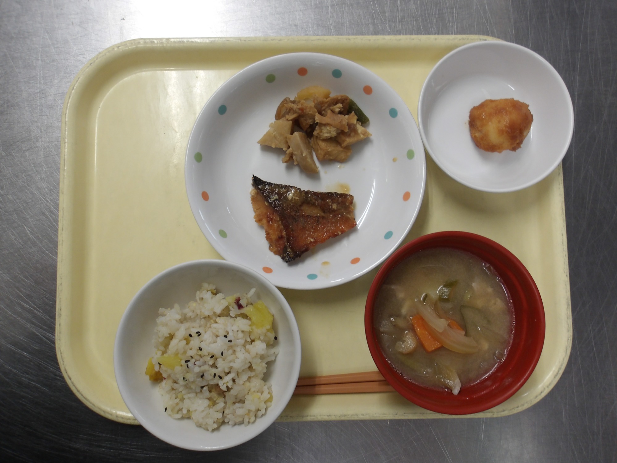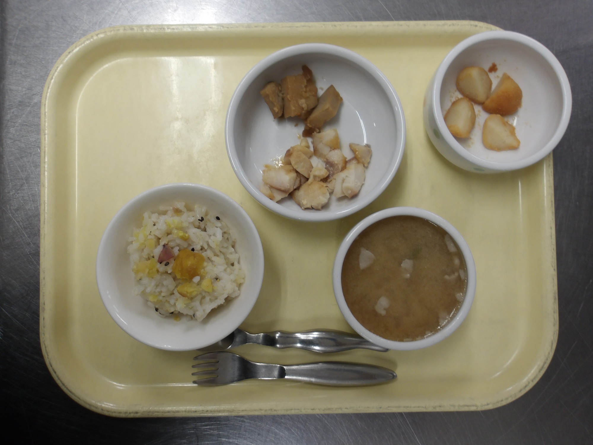 上川さんの畑の栗とさつまいもの入ったごはんめばるの西京焼き 里芋の煮物 豚汁 お月見団子 おやつ:うさぎケーキ