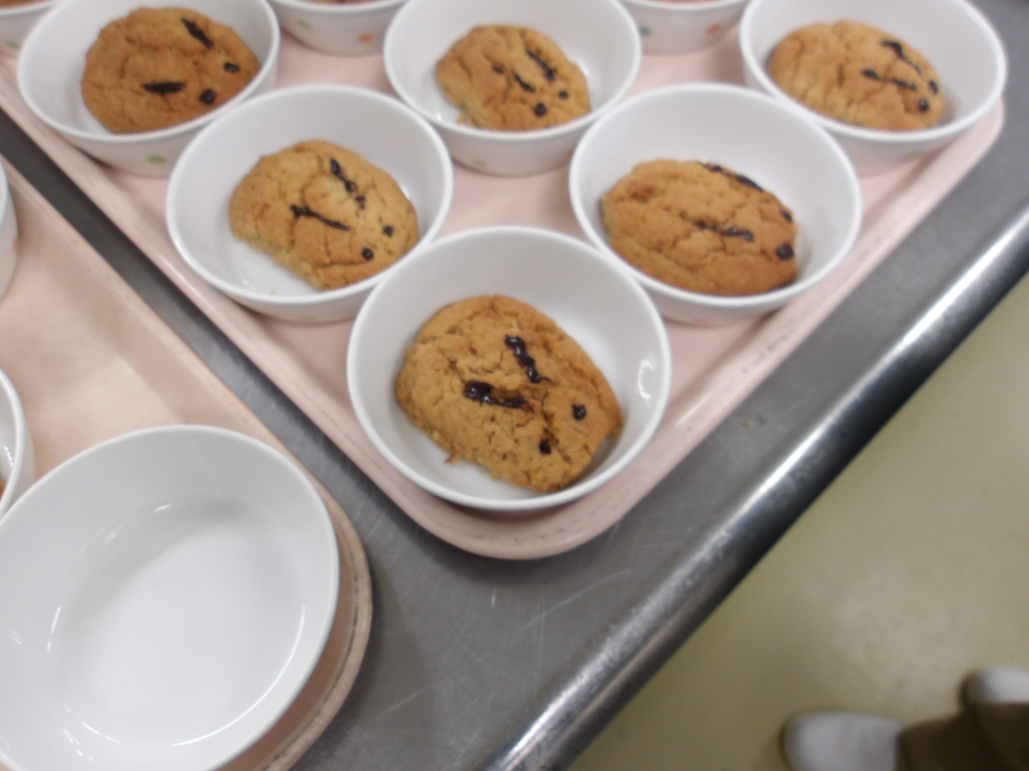 おやつは「うさぎケーキ」米粉のケーキに、 ココアと甜菜糖を練ってつくりお顔つけ。 サクサクおいしいケーキに仕上がりましたよ