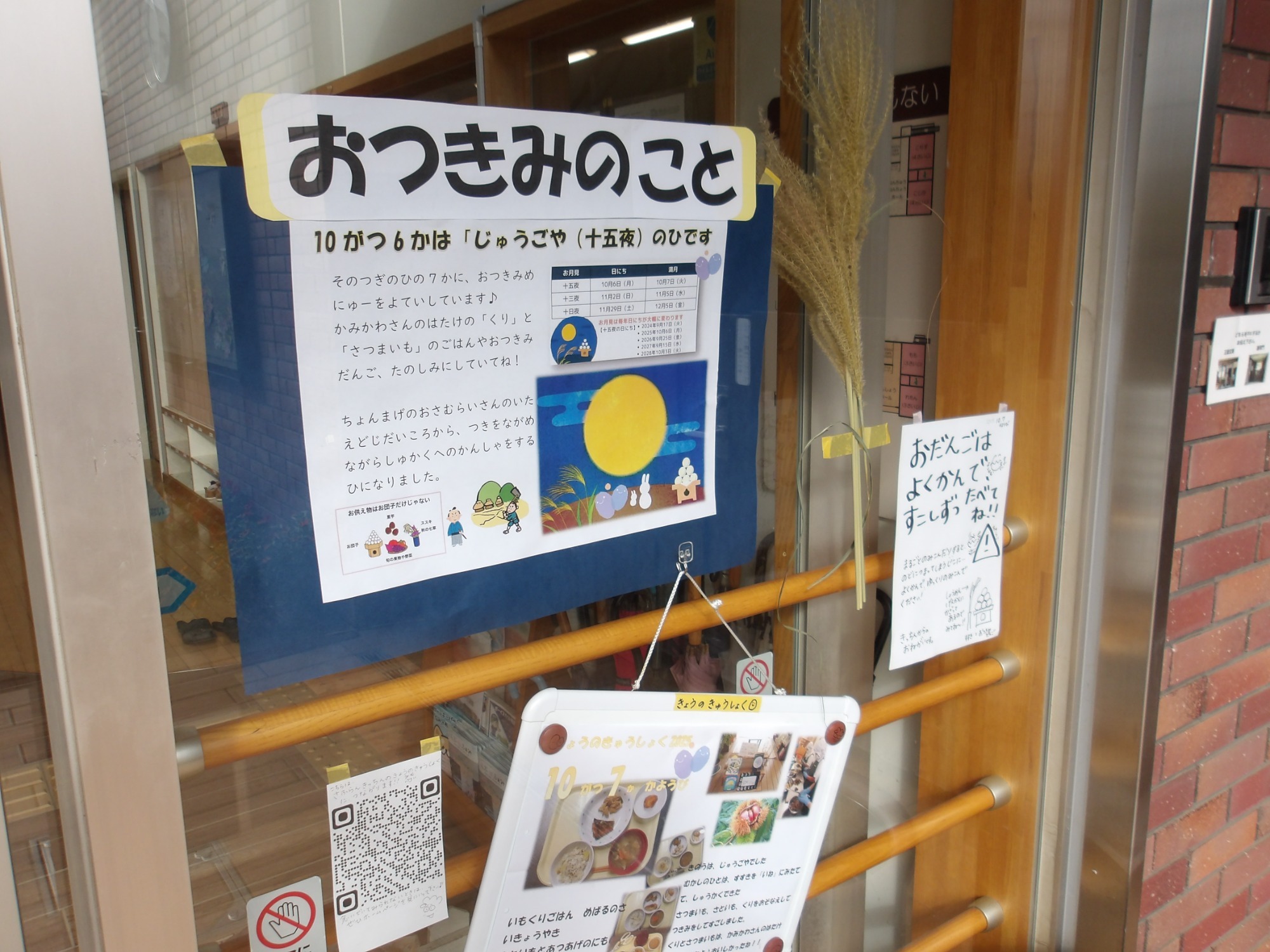正面玄関に展示をしたのはお月見のついてと ススキ、お供えの野菜、お月見団子です!