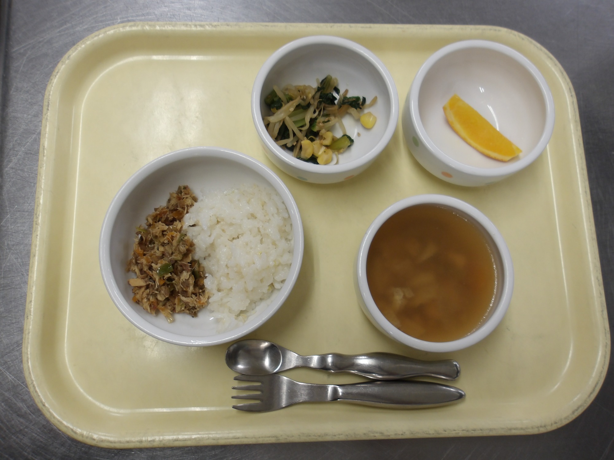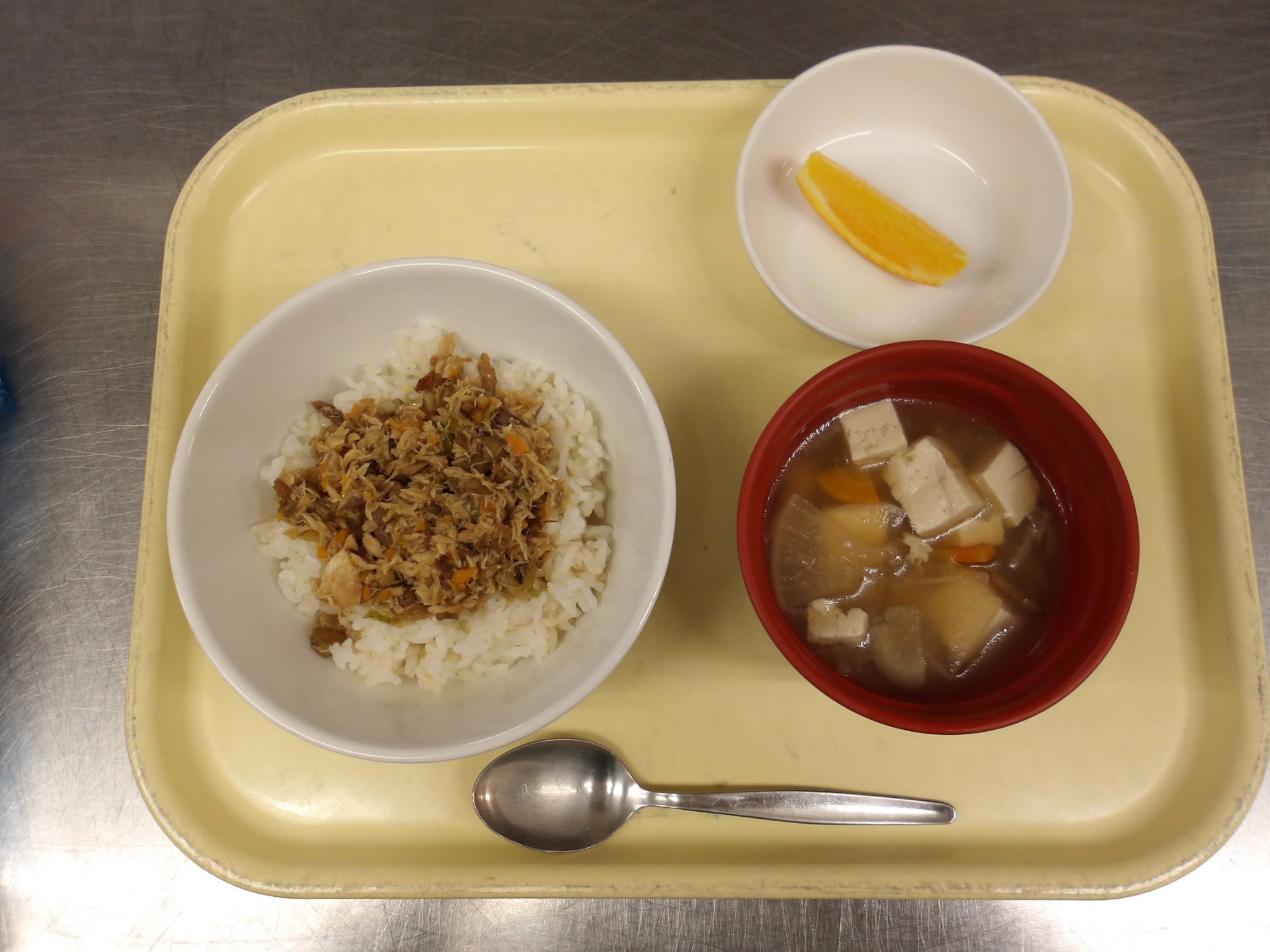 さばのそぼろどんぶり けんちん汁 オレンジ 青菜ともやしのナムル