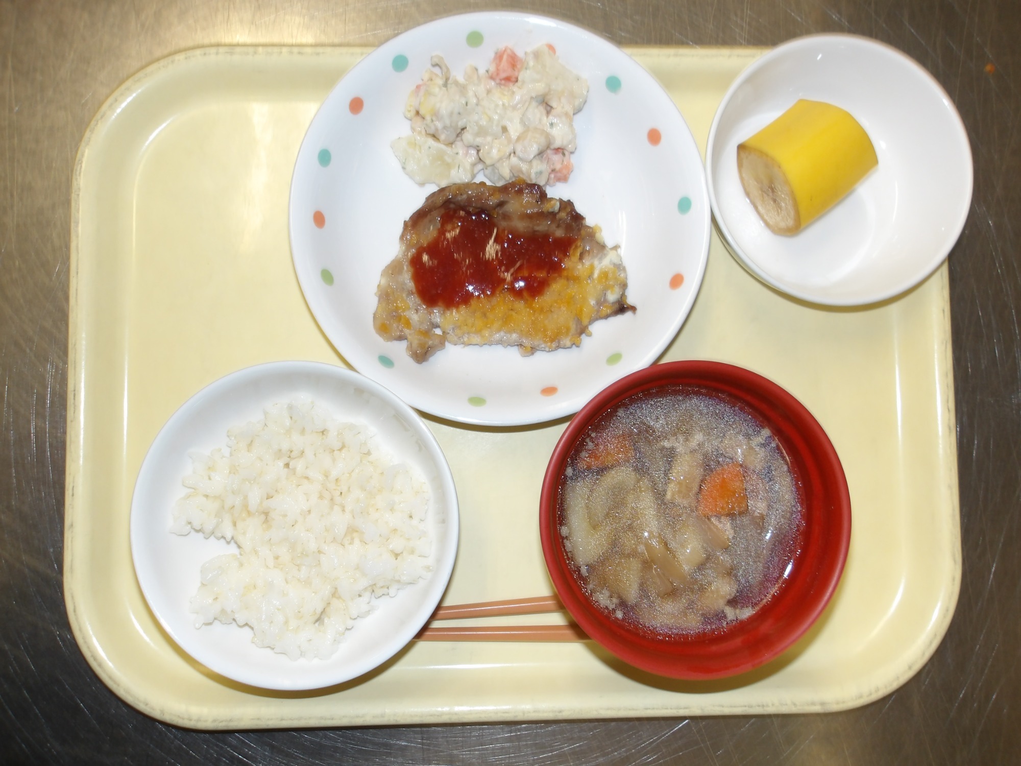 ごはん とんかつ 豆入りほくほくサラダ 吉野汁 バナナ おやつ:さつまいものケーキ