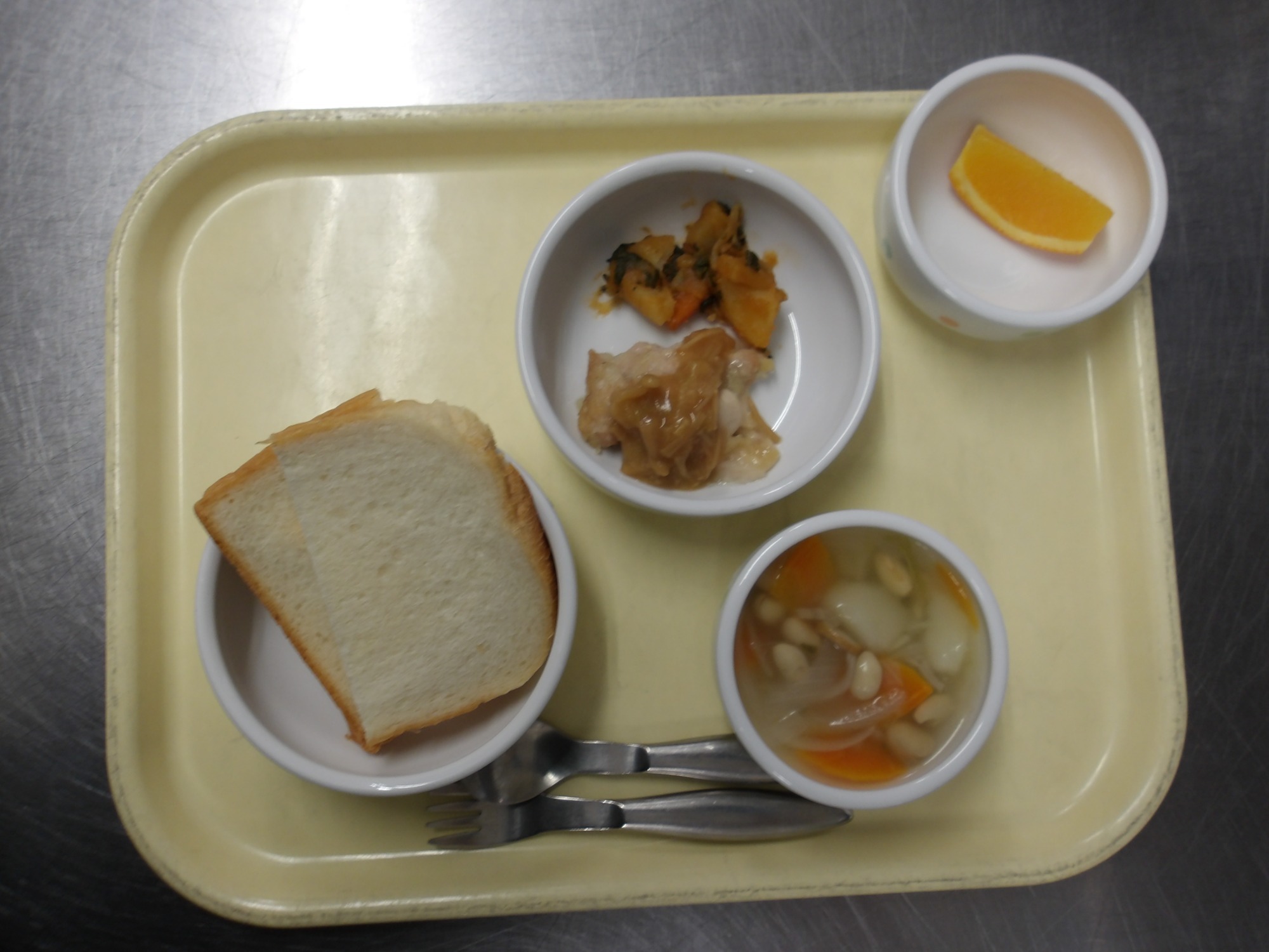 豆入り田舎スープ オレンジ おやつ:ひじきご飯のおにぎり