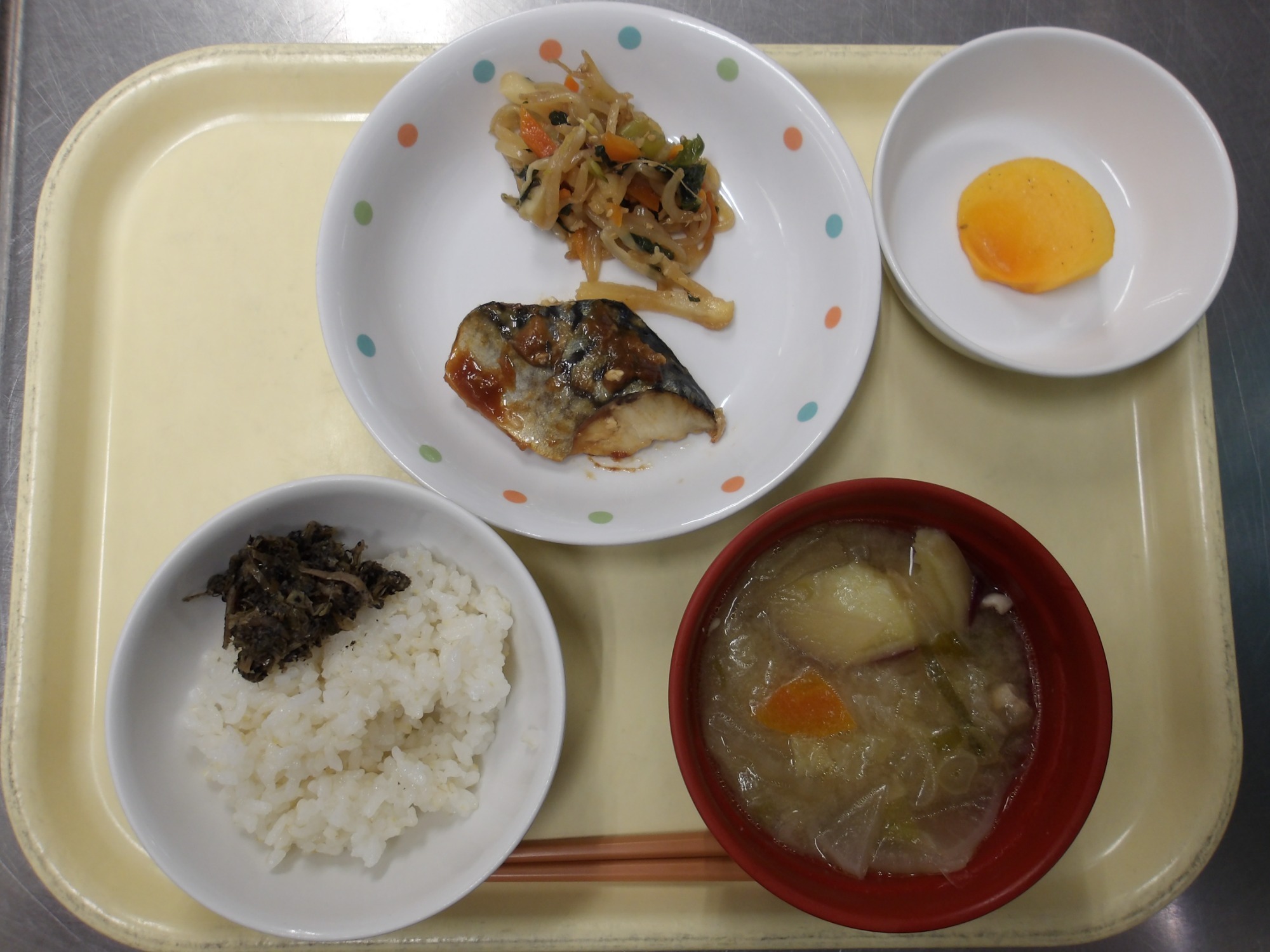 どろんこはりーのふりかけごはん サバ味噌煮ポテト入りナムル さつま汁 柿 おやつ:さつまいもの芋もち