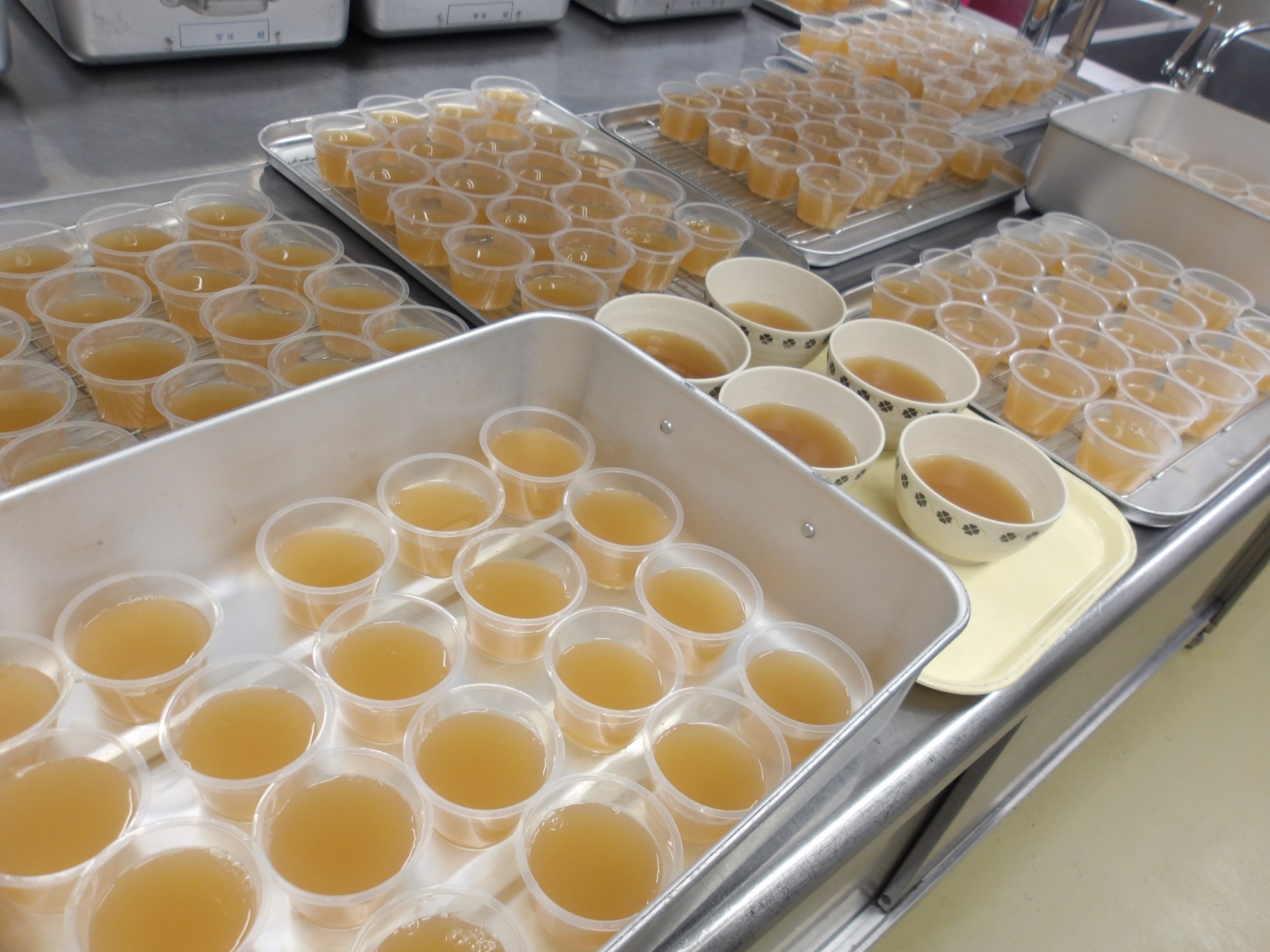 きょうは読書週間にちなんで「きんぎょがにげた」ゼリー。カップに入っているのはりんごゼリー。きんぎょになっているのはぶどうゼリーです。見つけたかな?