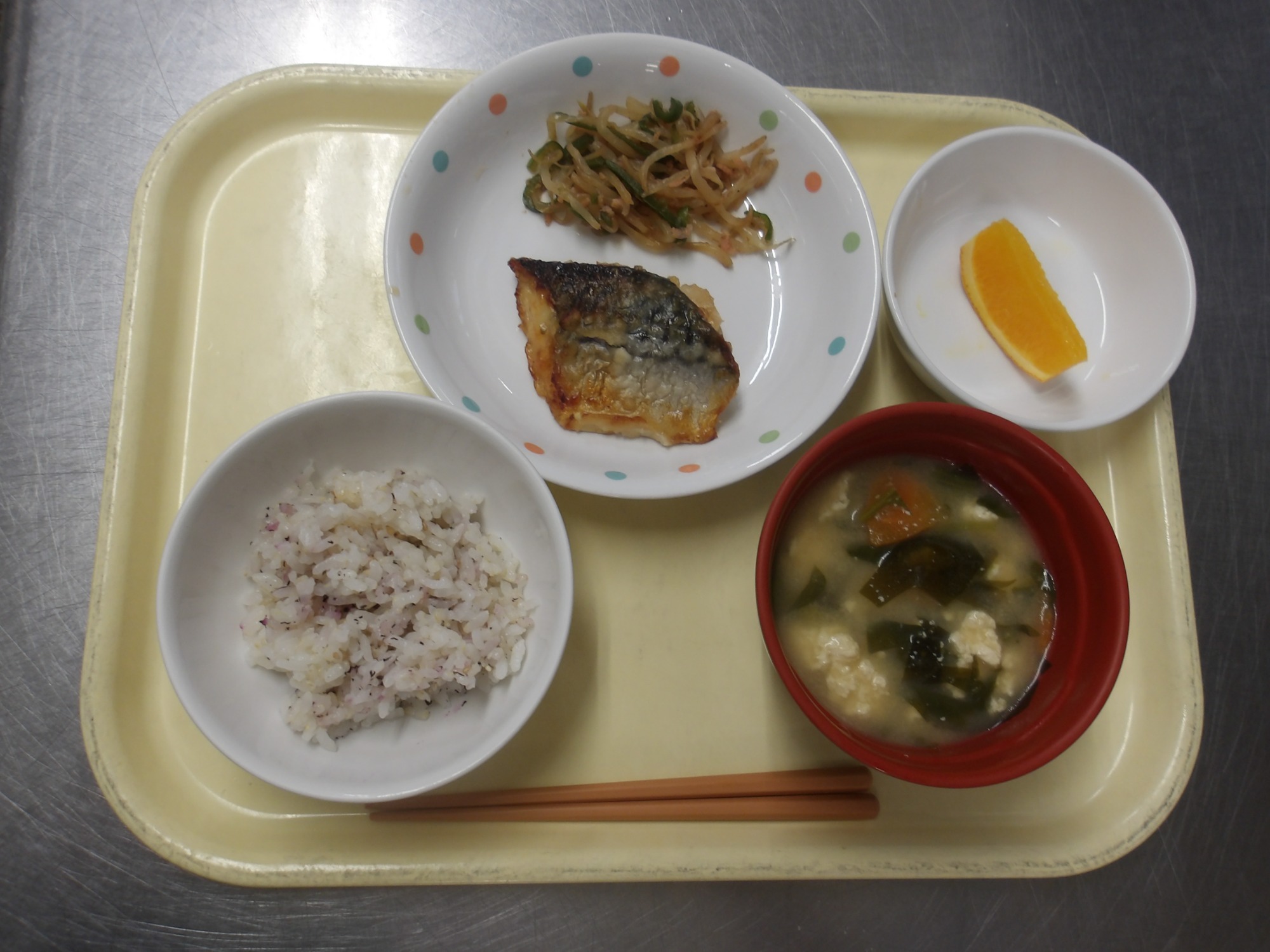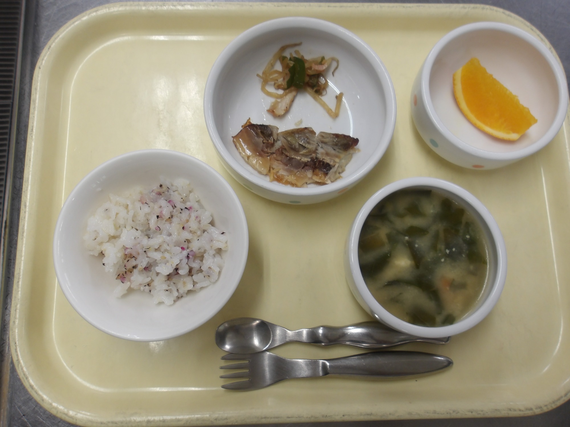 ゆかりご飯 サバの竜田焼 ピーマンの素干しエビあえ かみなり汁 オレンジ おやつ:豆腐ドーナツ