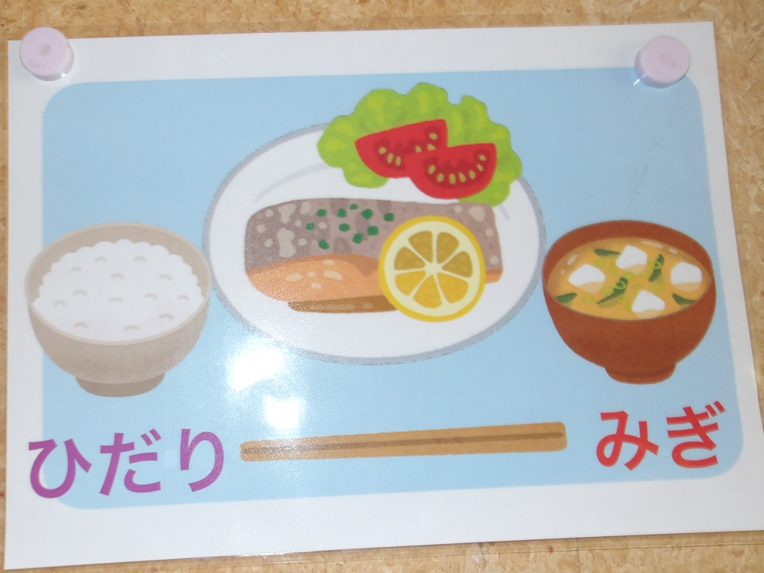 幼稚園のお部屋に貼ってあるお膳のセットの方法です。毎日繰り返していくと配膳のルールを覚えていきます。