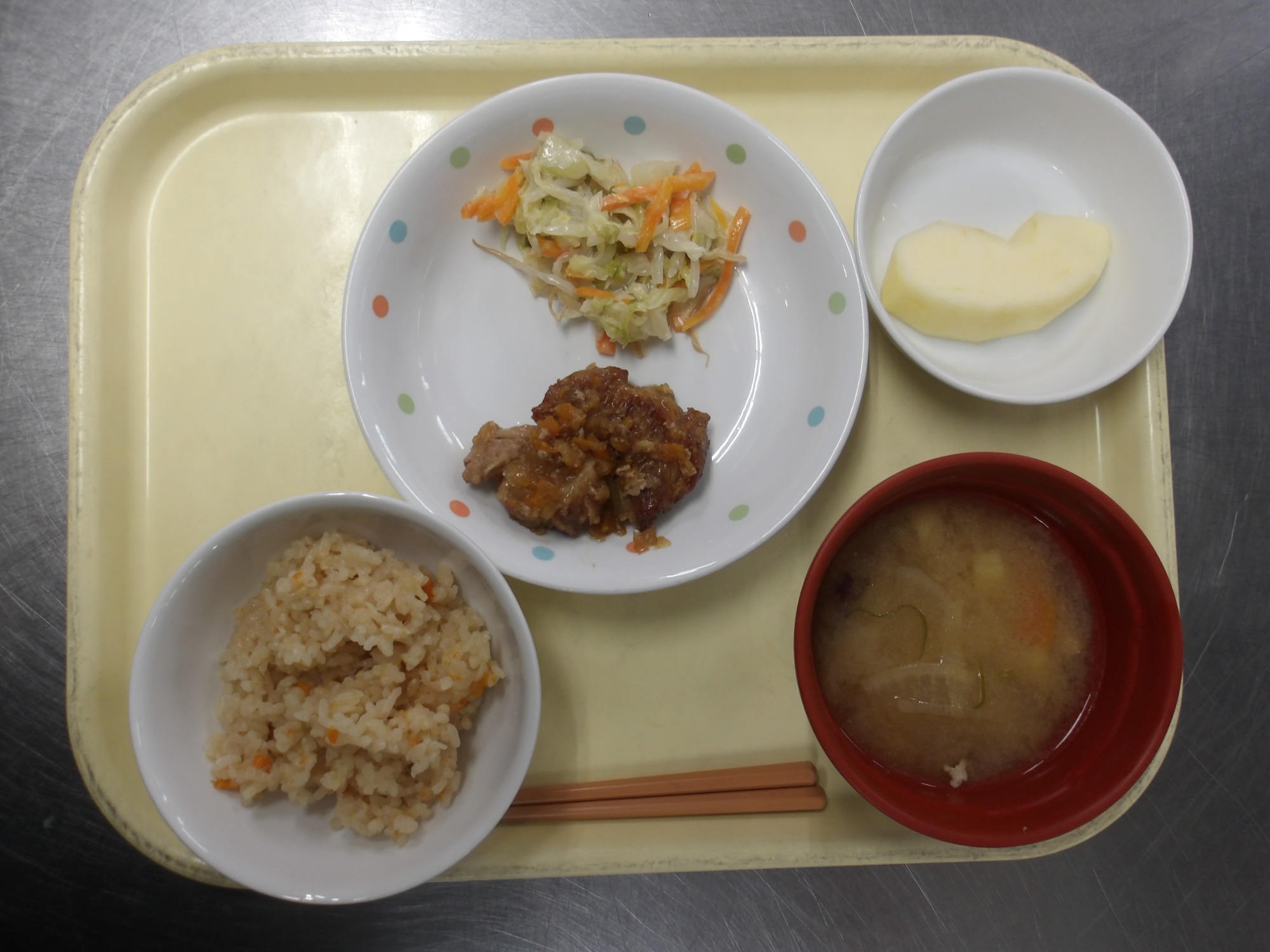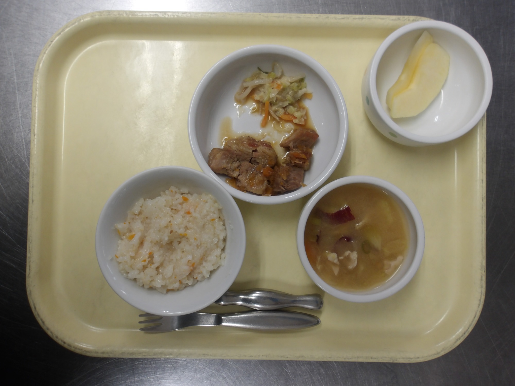 もみじごはん(にんじんをもみじのあざやかないろにみたてています) 豚の角煮 コールスローサラダ さつま汁 りんご