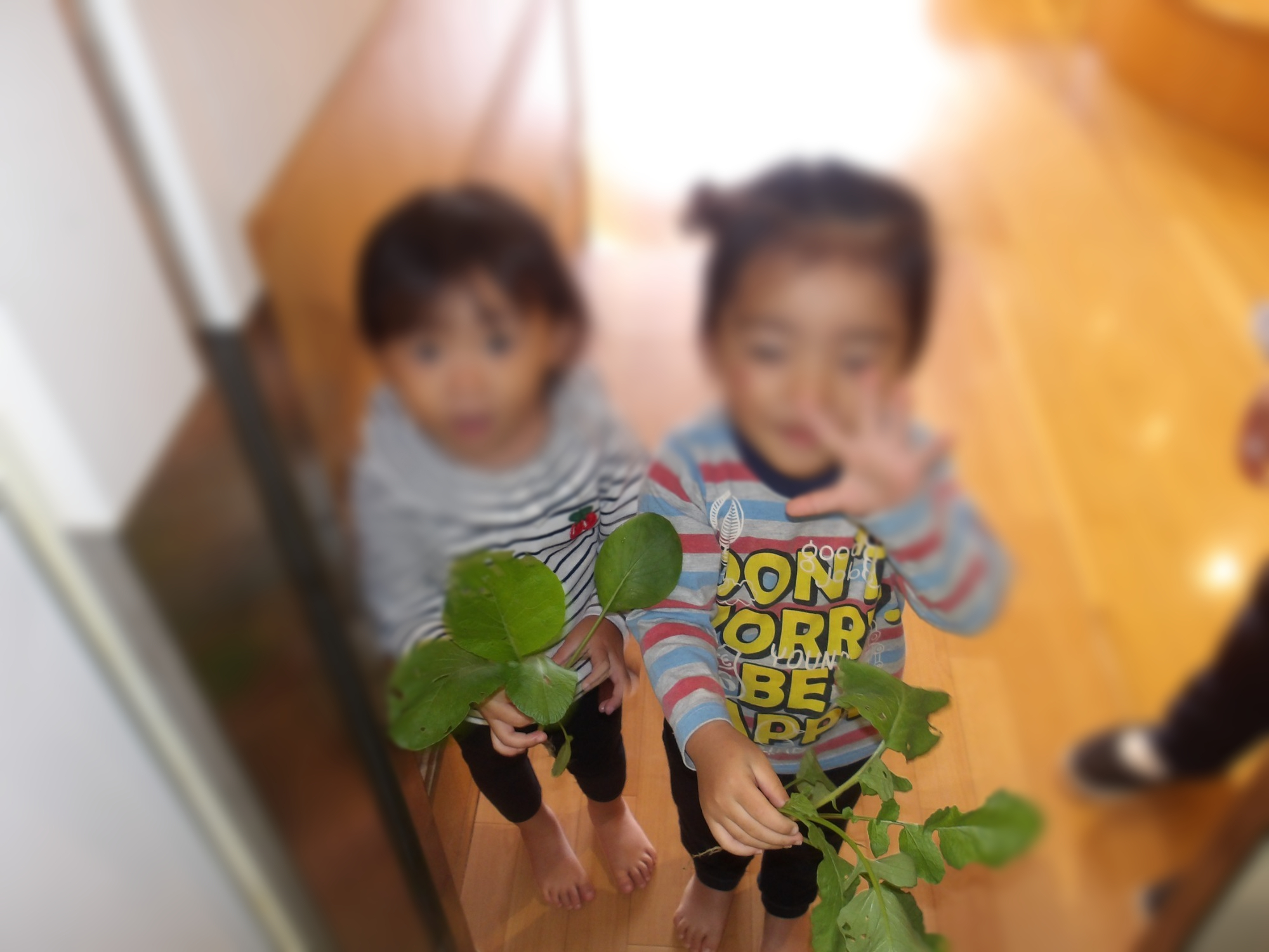 昨日、お試し収穫を持ってきてくれたりんご組さんのお二人。小松菜とはつか大根。