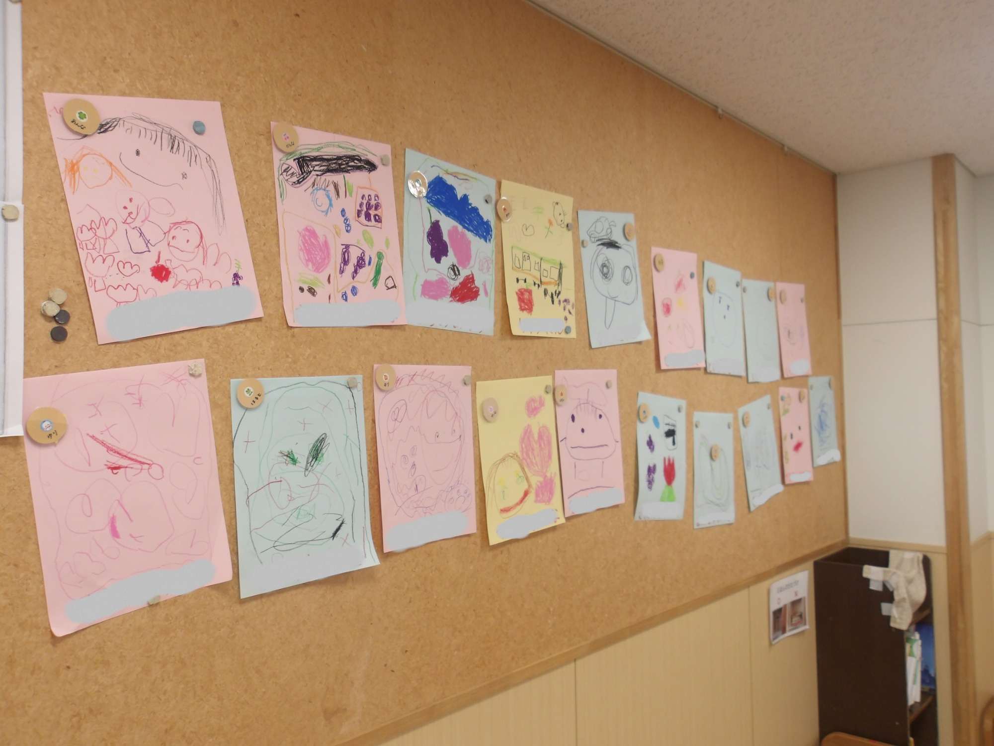 年少組で配膳中に発見!運動会の旗が描かれていました♪ 運動会当日は、園庭を彩ってくれる大切な旗です。全クラス一人一人の旗をお楽しみに。