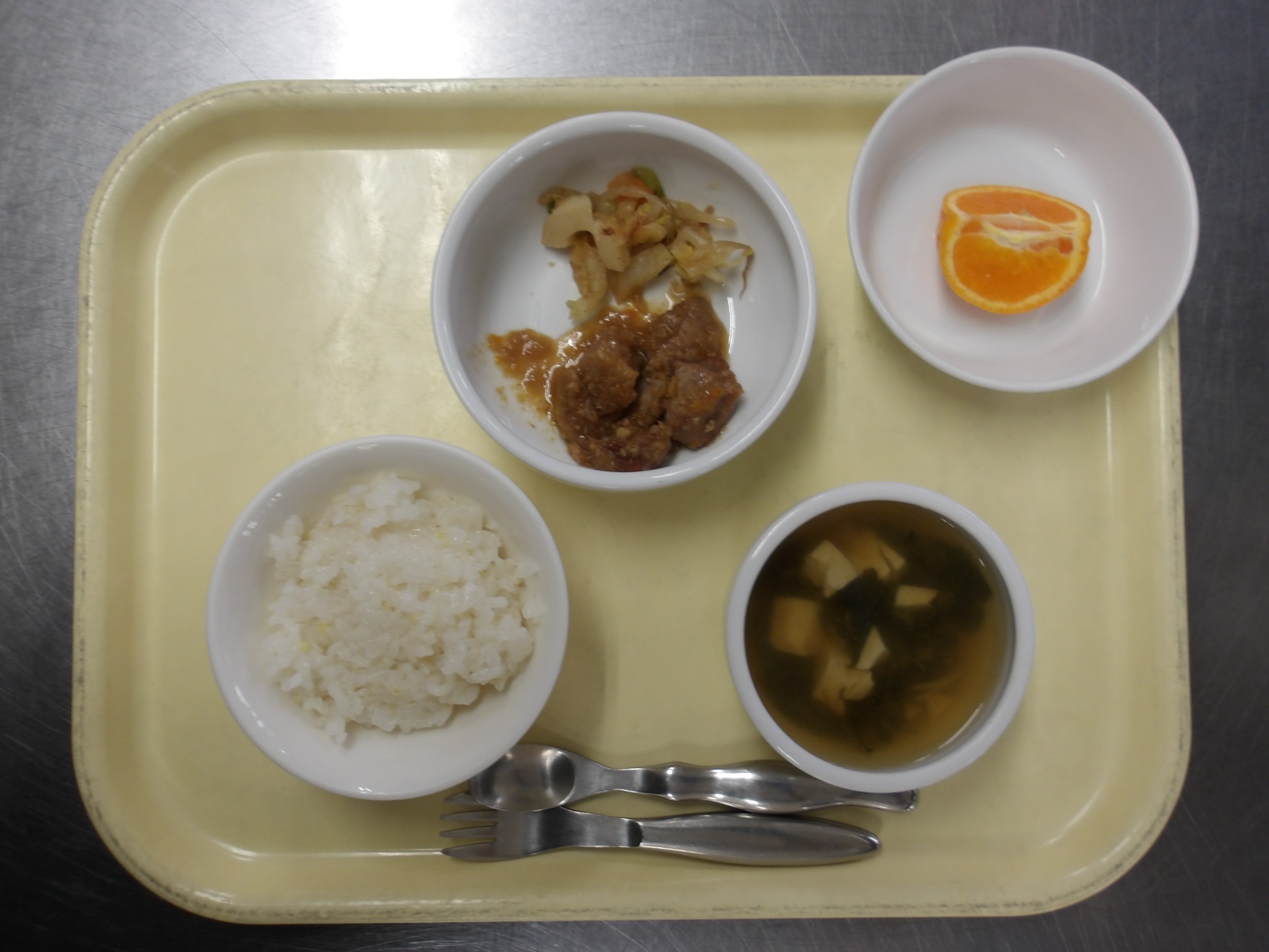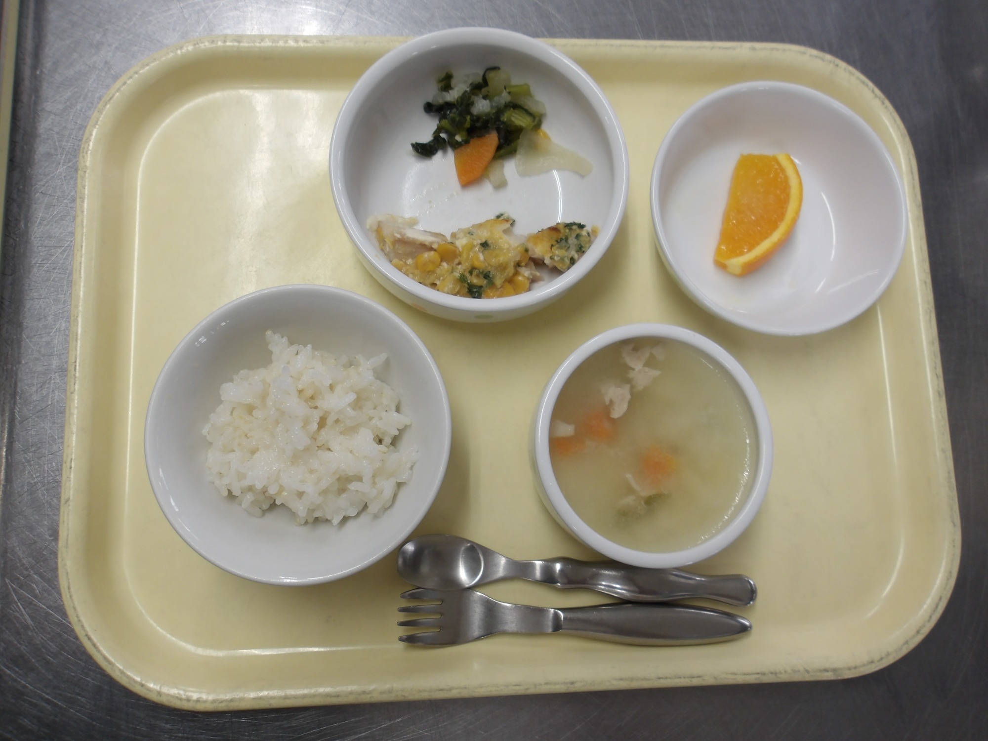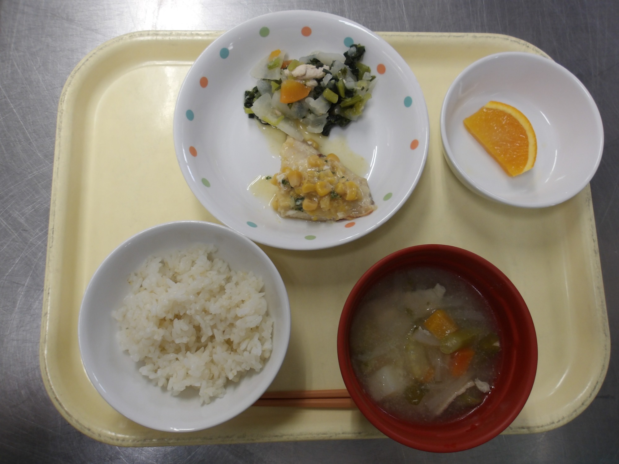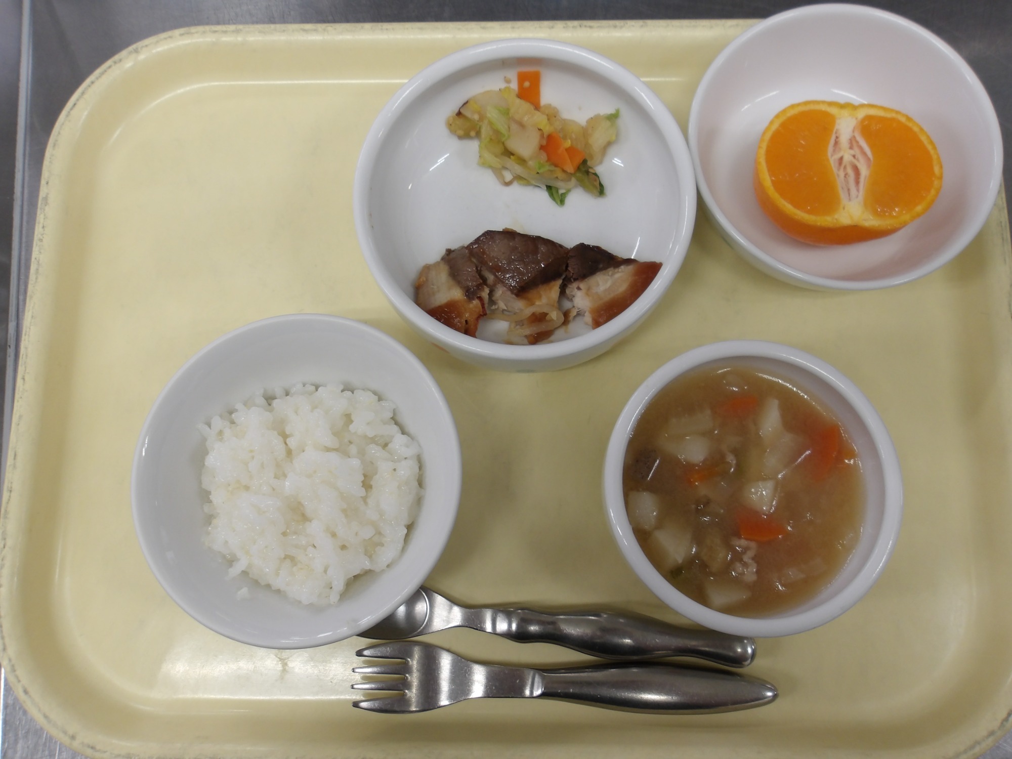 きびごはん 煮豚 白菜のお浸し ぽんかん 春菊のすまし汁 おやつ:コーンケーキ
