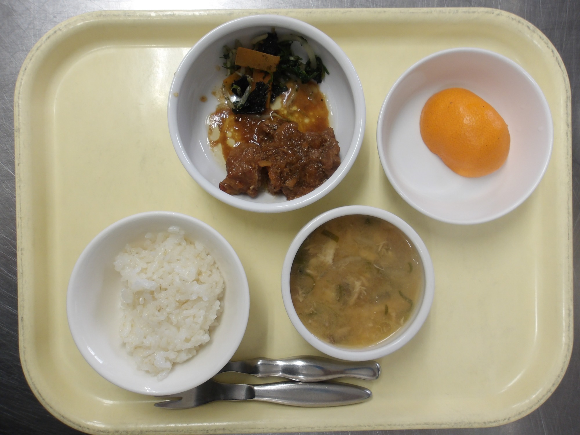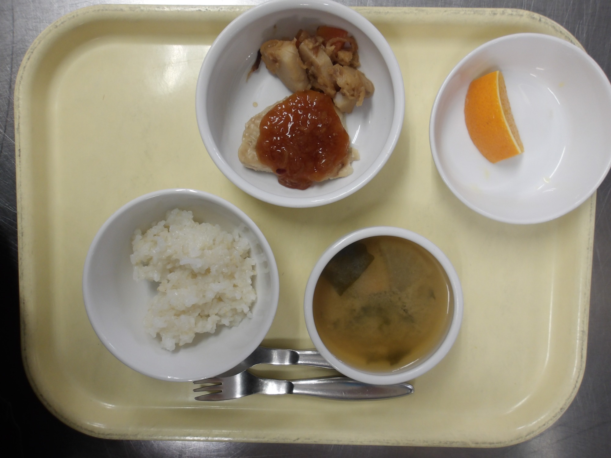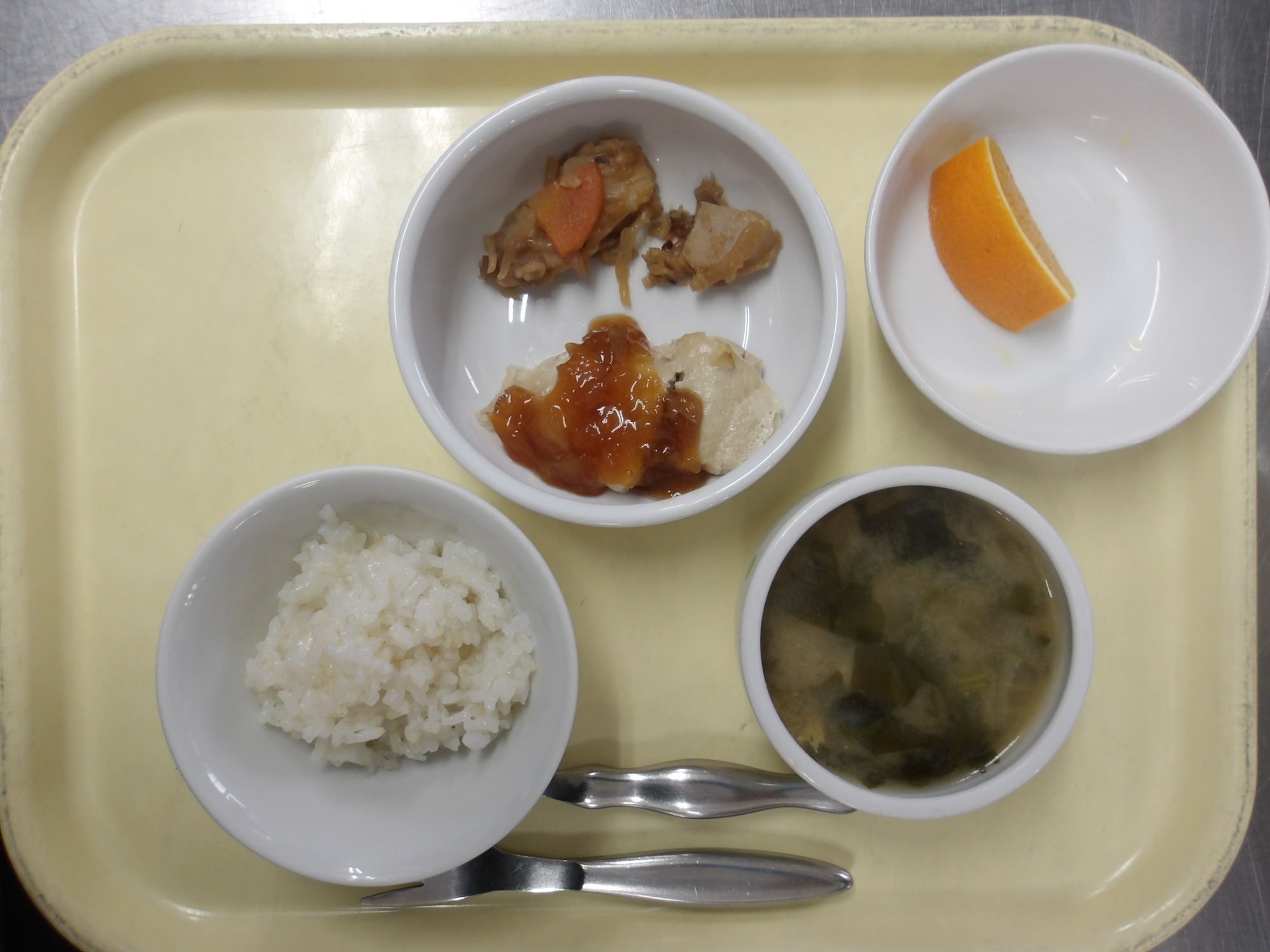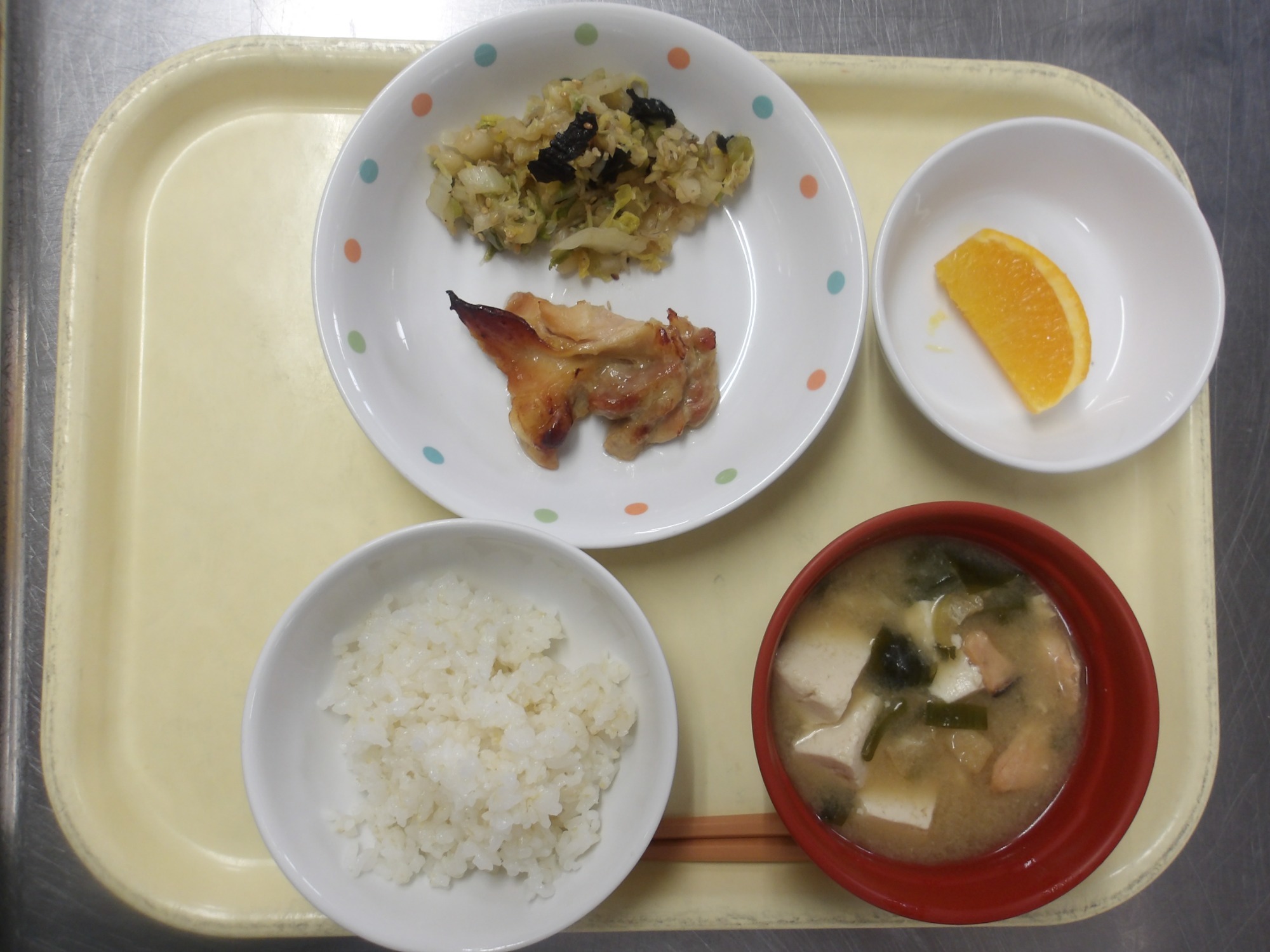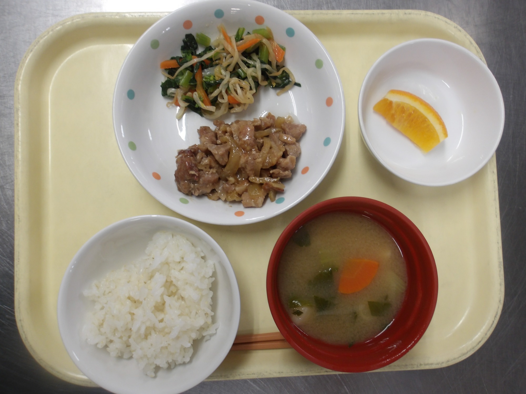 きびごはん 煮豚 白菜のお浸し ぽんかん 春菊のすまし汁 おやつ:コーンケーキ