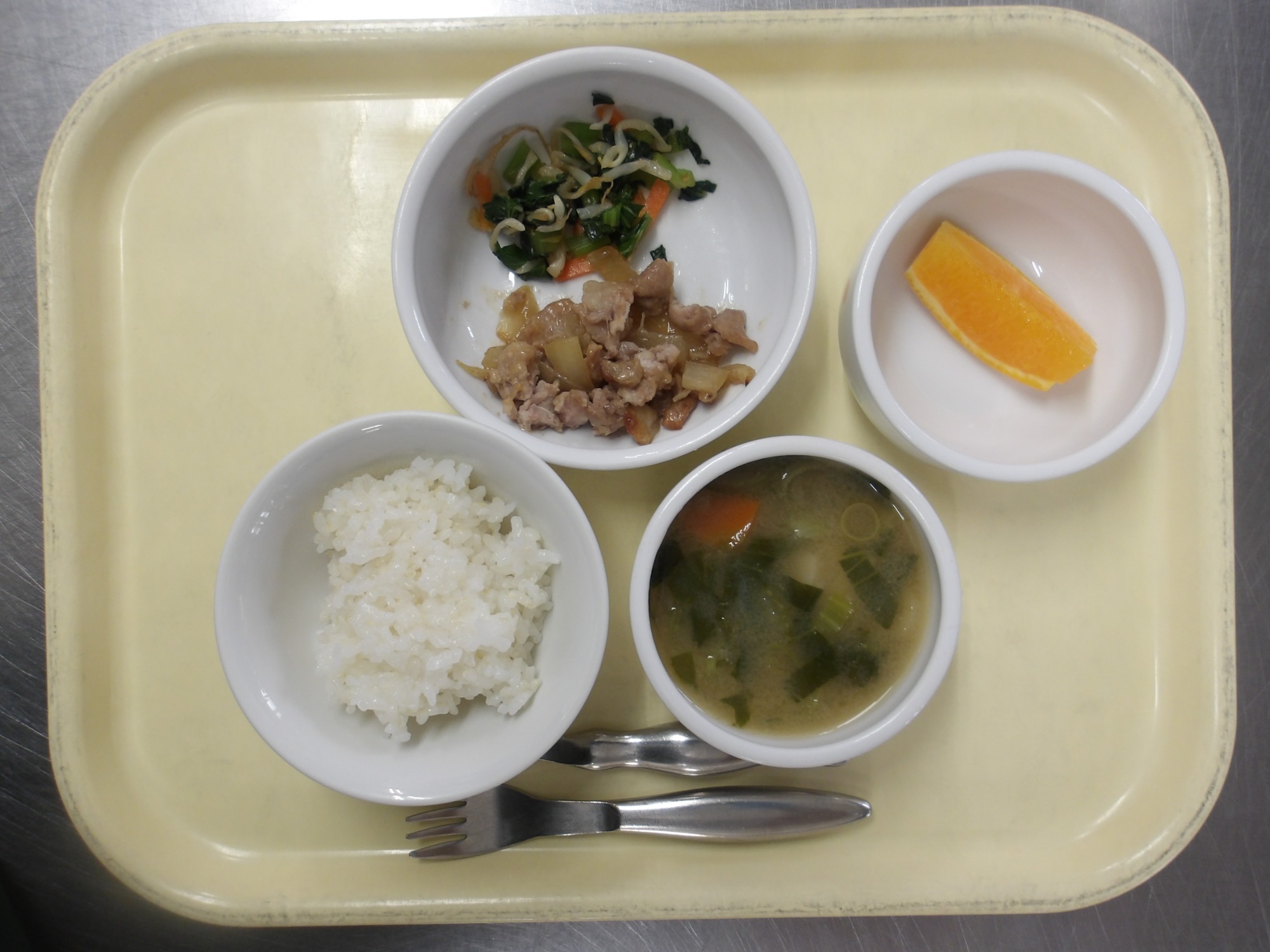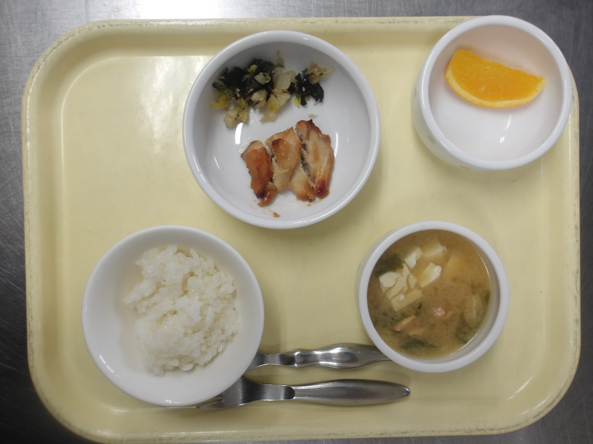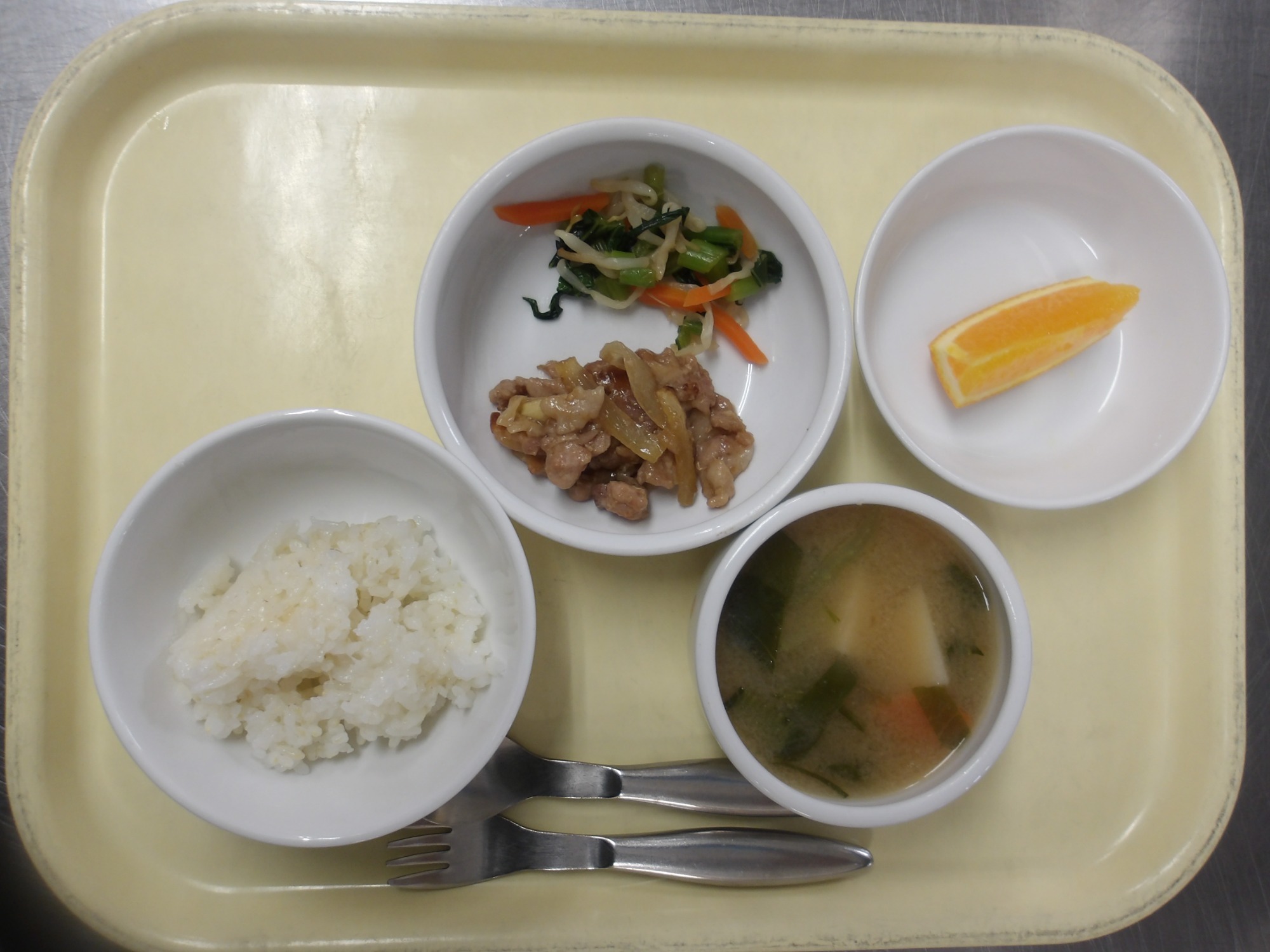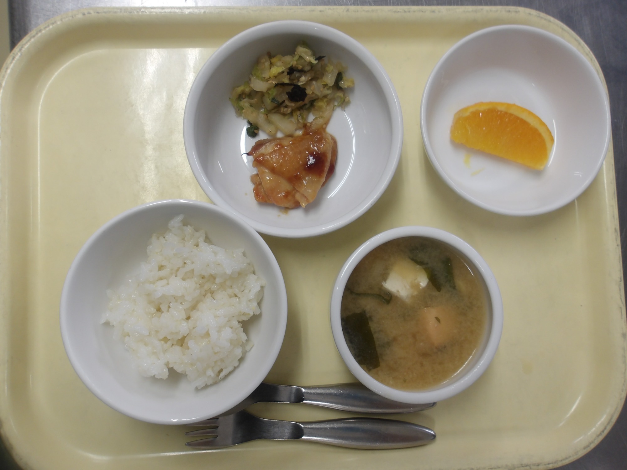 きびごはん 煮豚 白菜のお浸し ぽんかん 春菊のすまし汁 おやつ:コーンケーキ