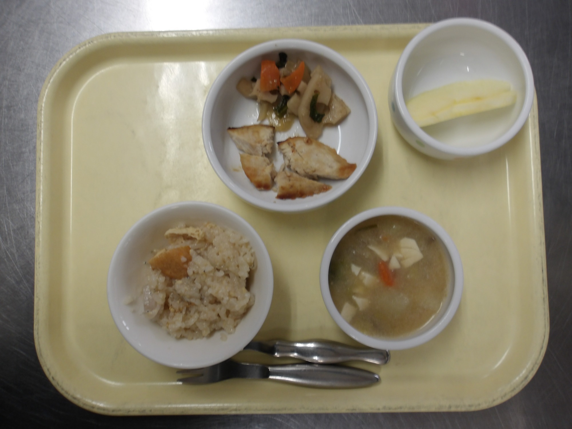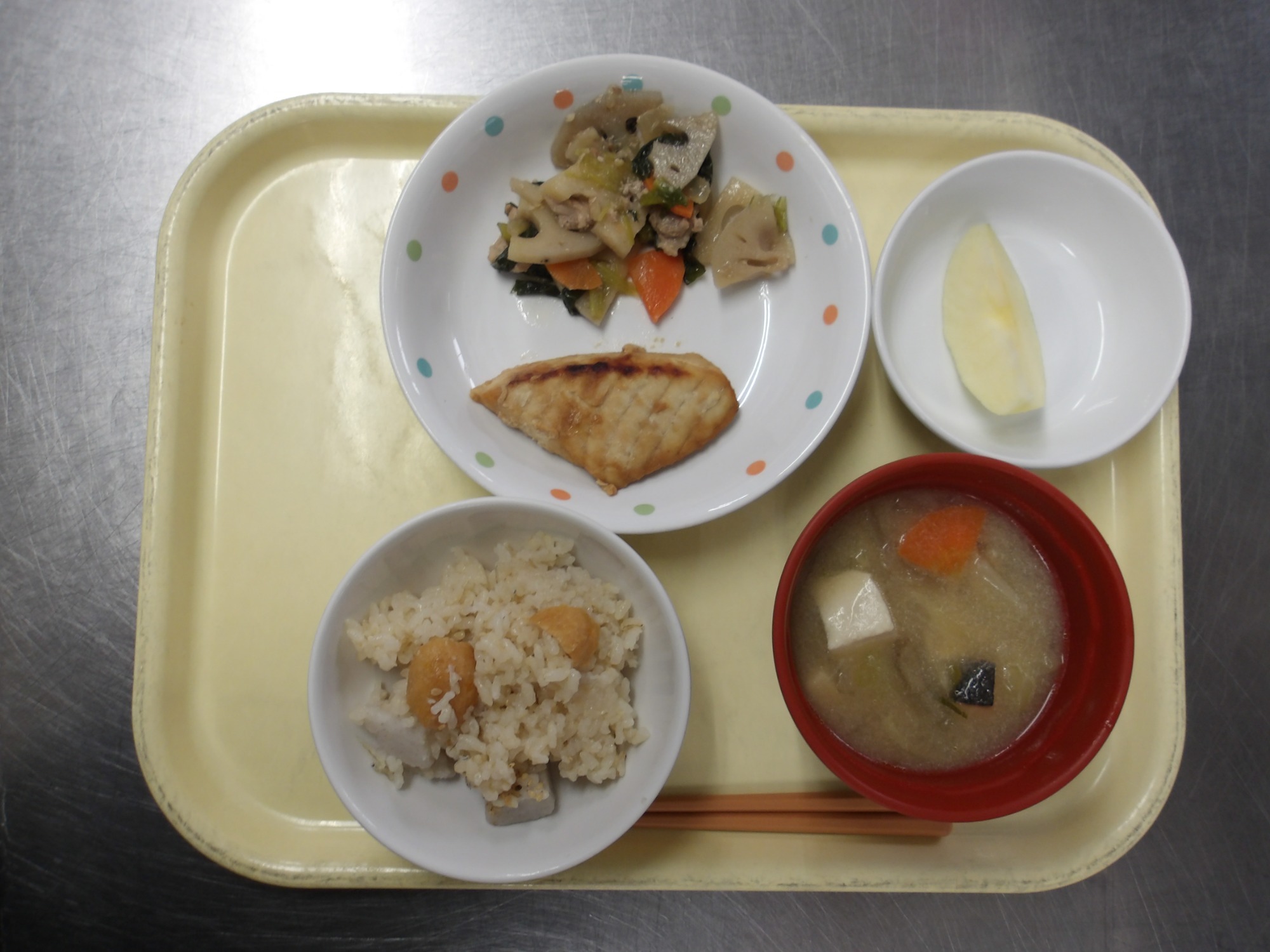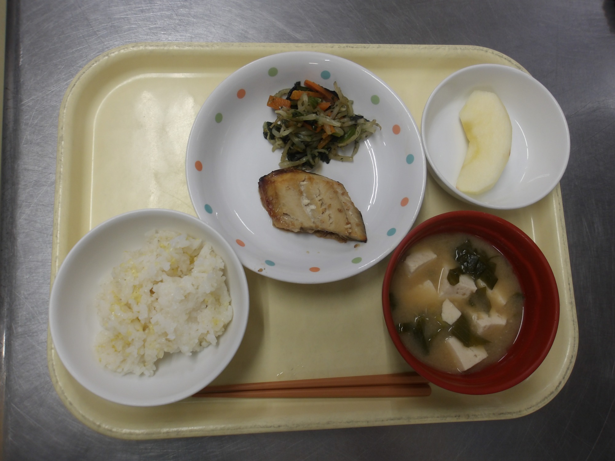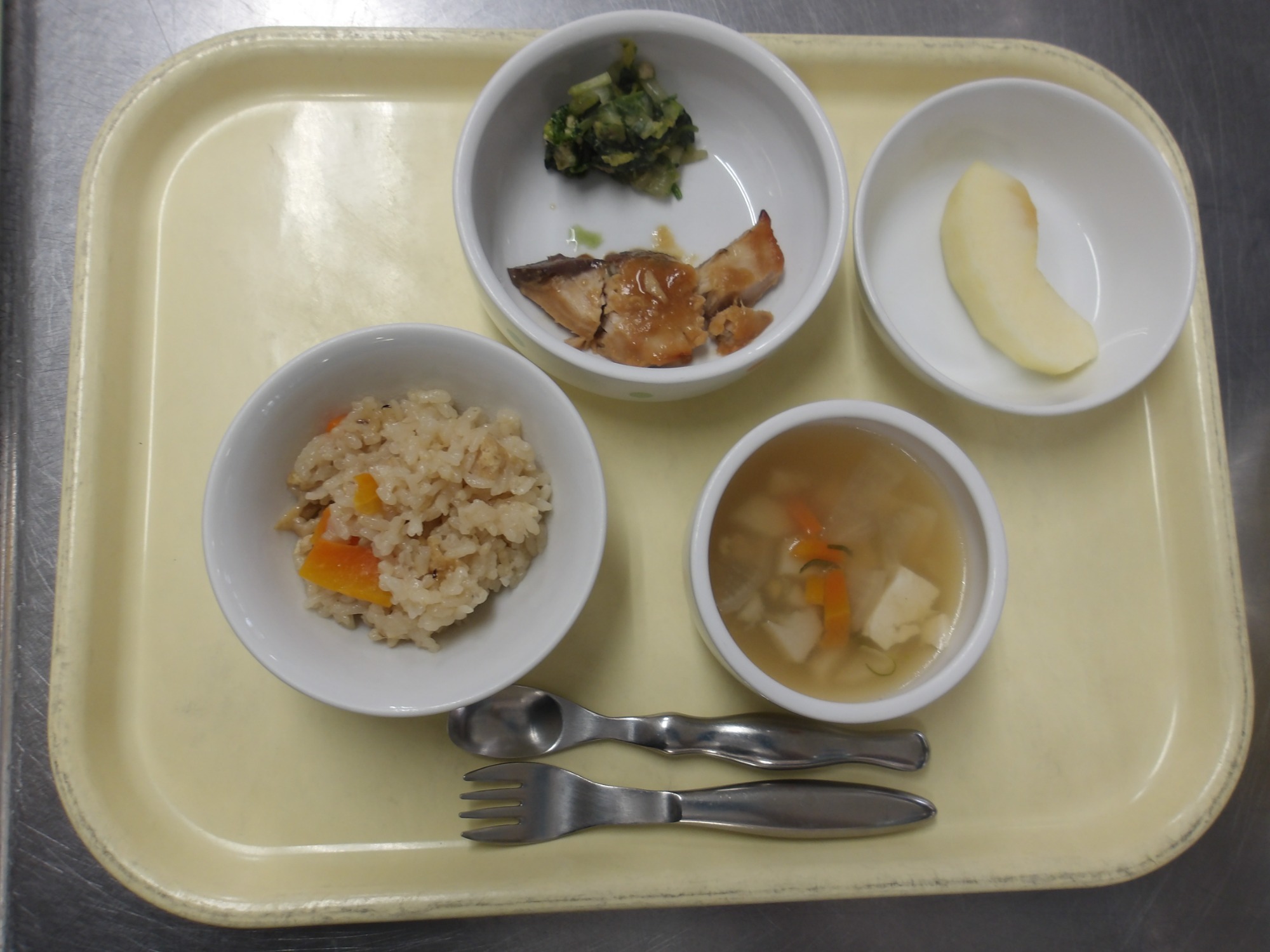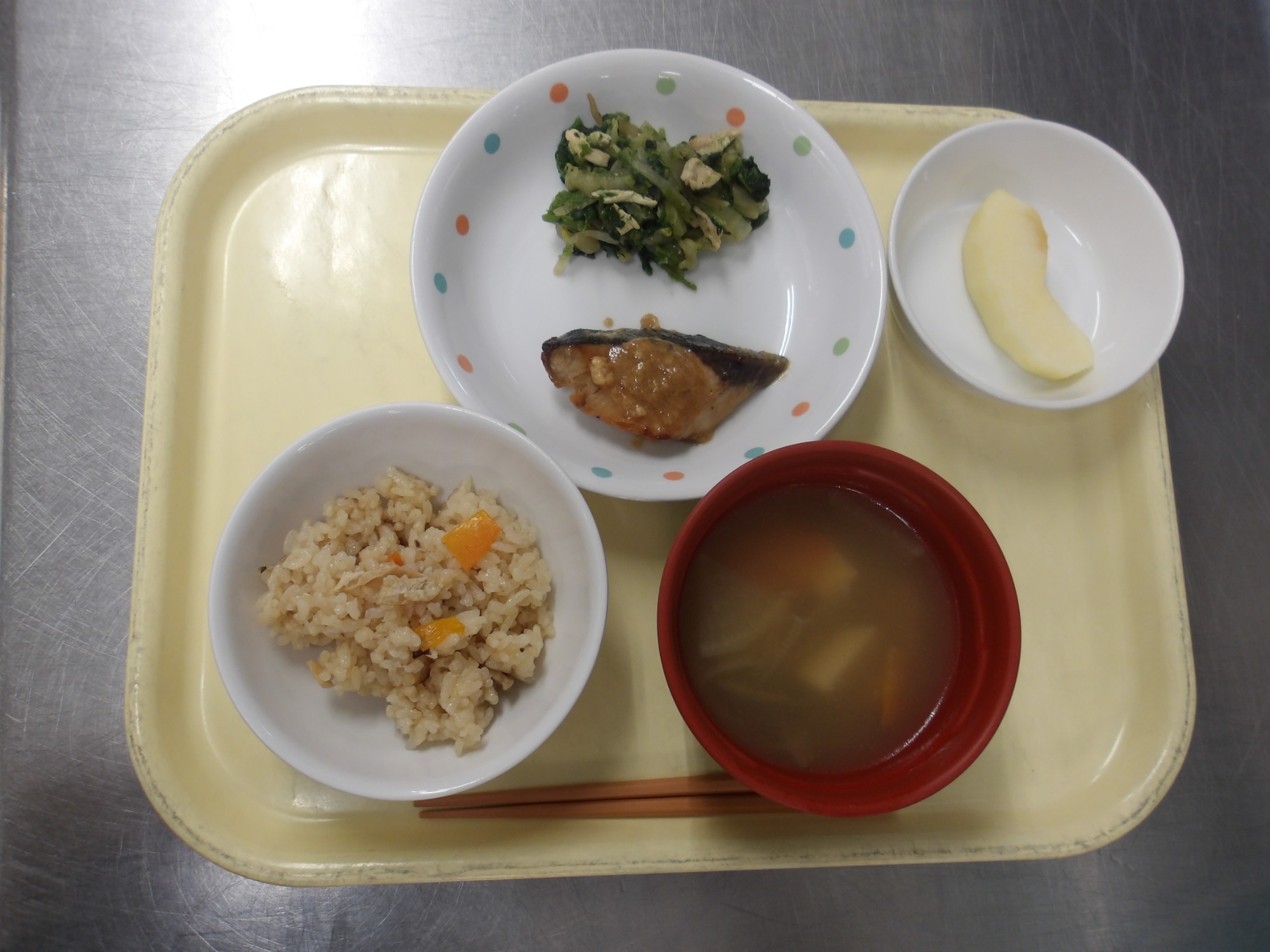 こんこんごはん(キツネの大好きな油揚げたっぷりのごはんです)いなだのみそ照りやき 白菜とほうれん草のお浸し けんちん汁 りんご おやつ:さつまいもとりんごの甘煮