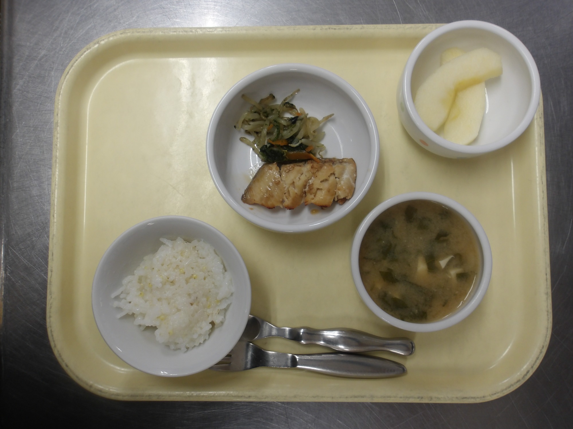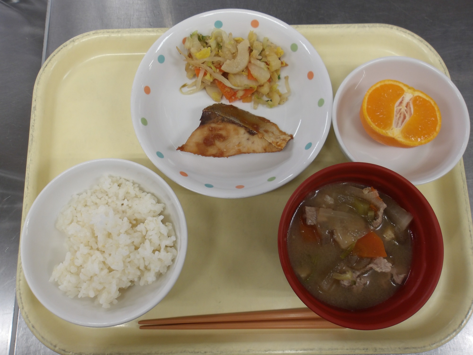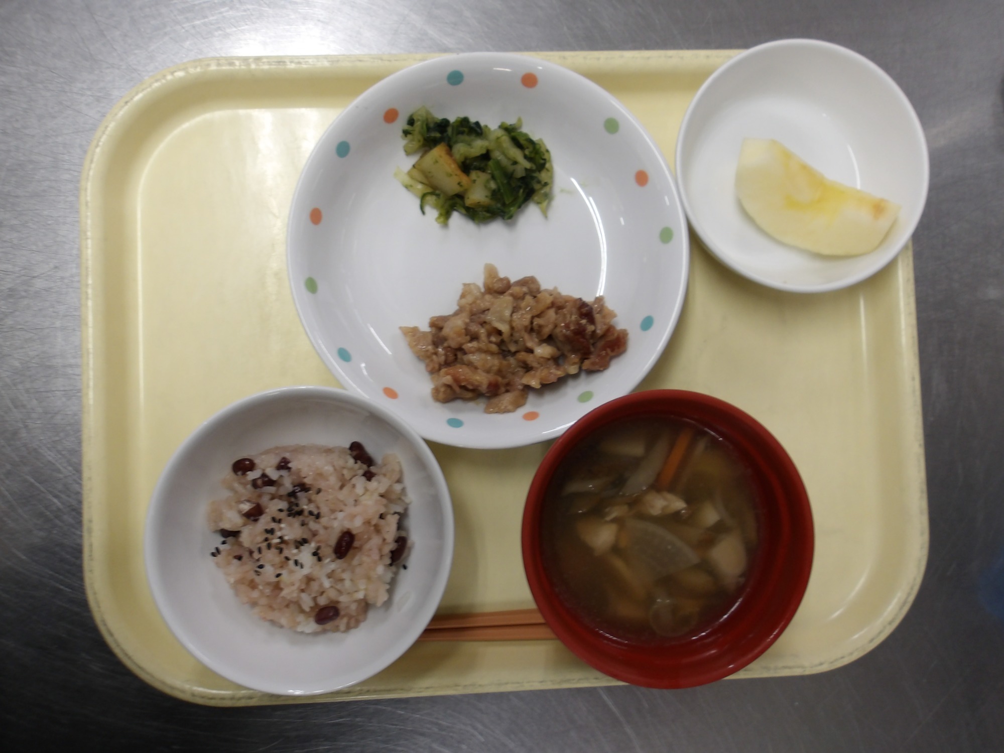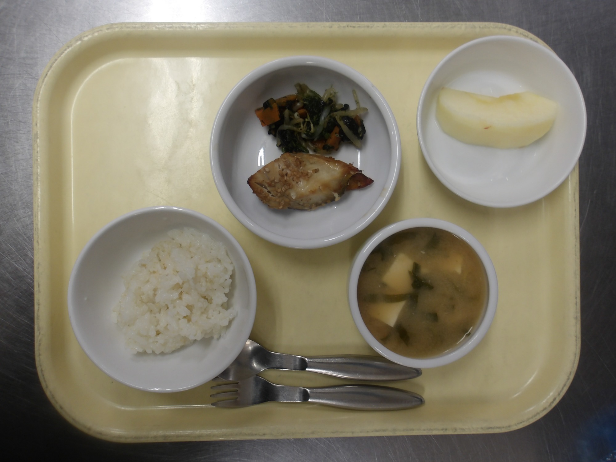 こんこんごはん(キツネの大好きな油揚げたっぷりのごはんです)いなだのみそ照りやき 白菜とほうれん草のお浸し けんちん汁 りんご おやつ:さつまいもとりんごの甘煮