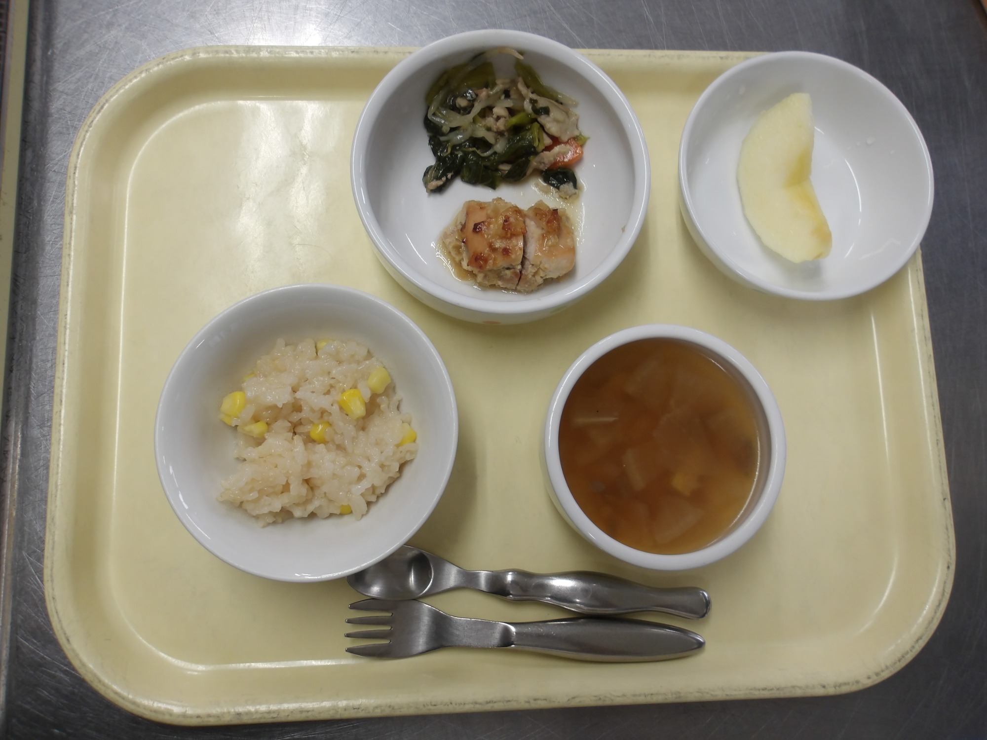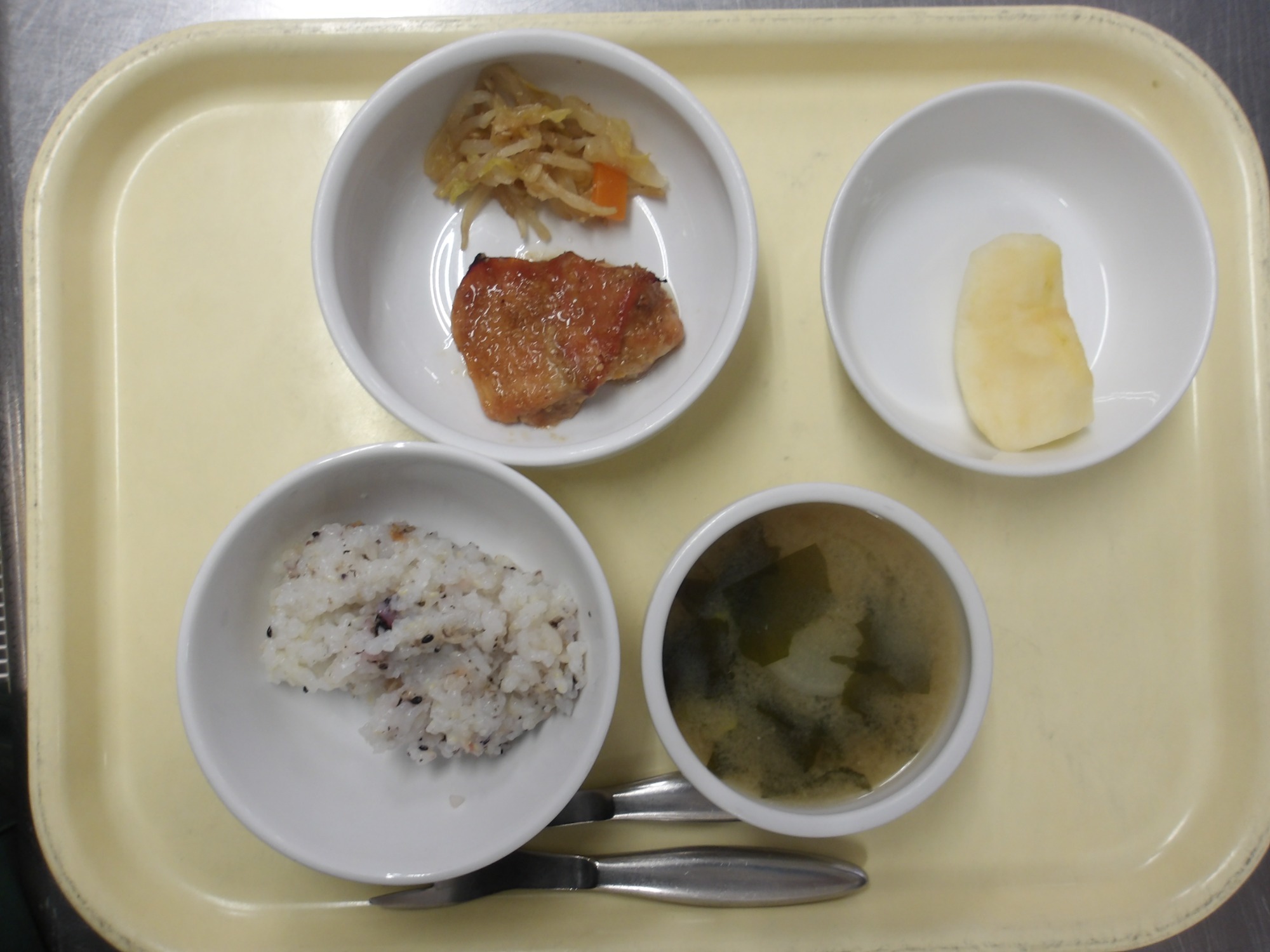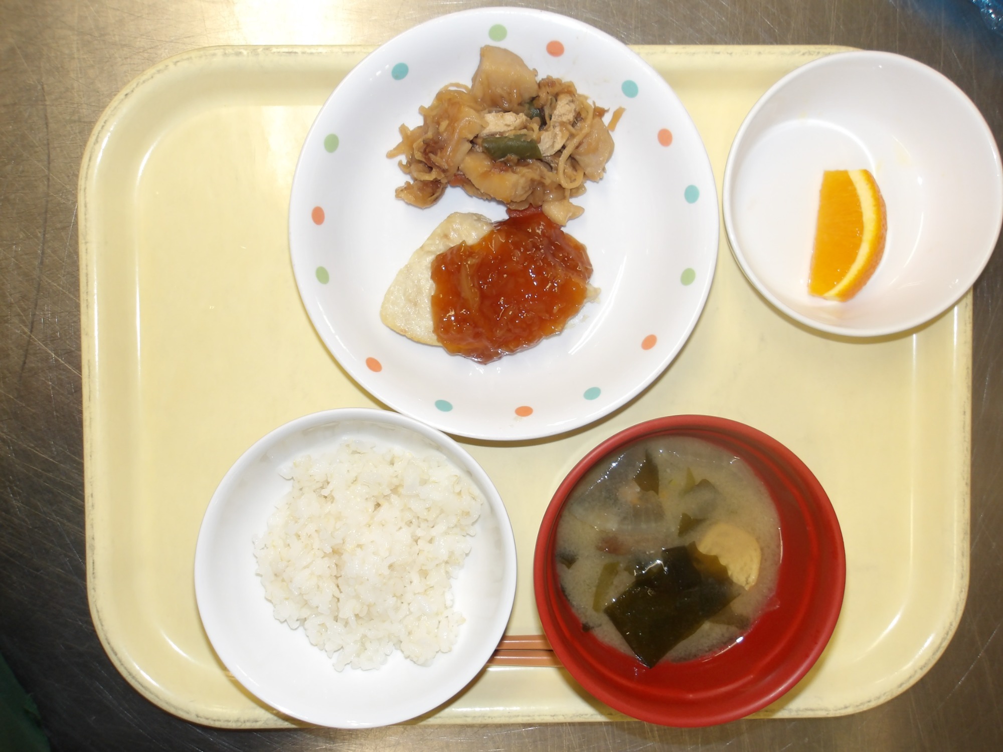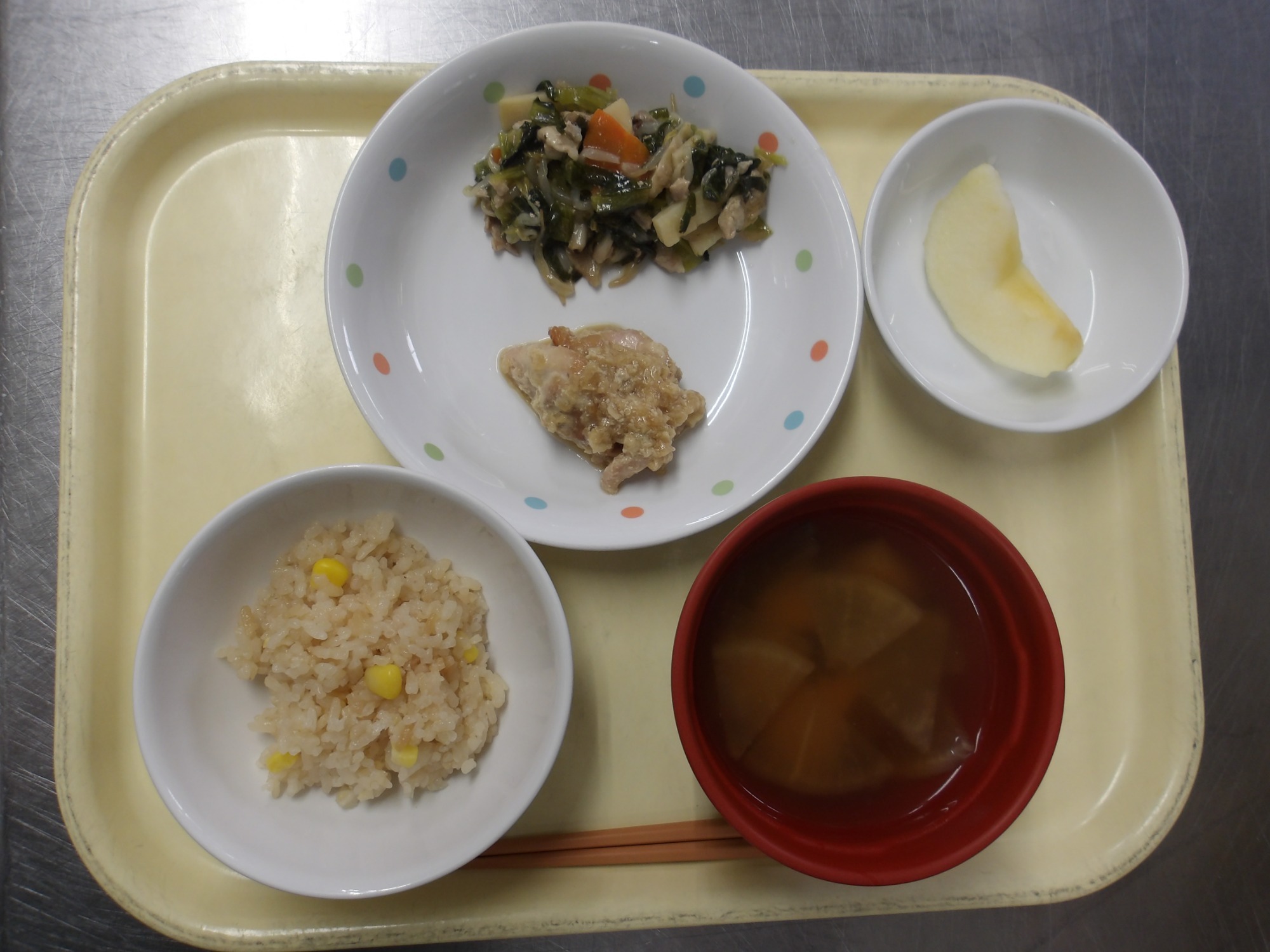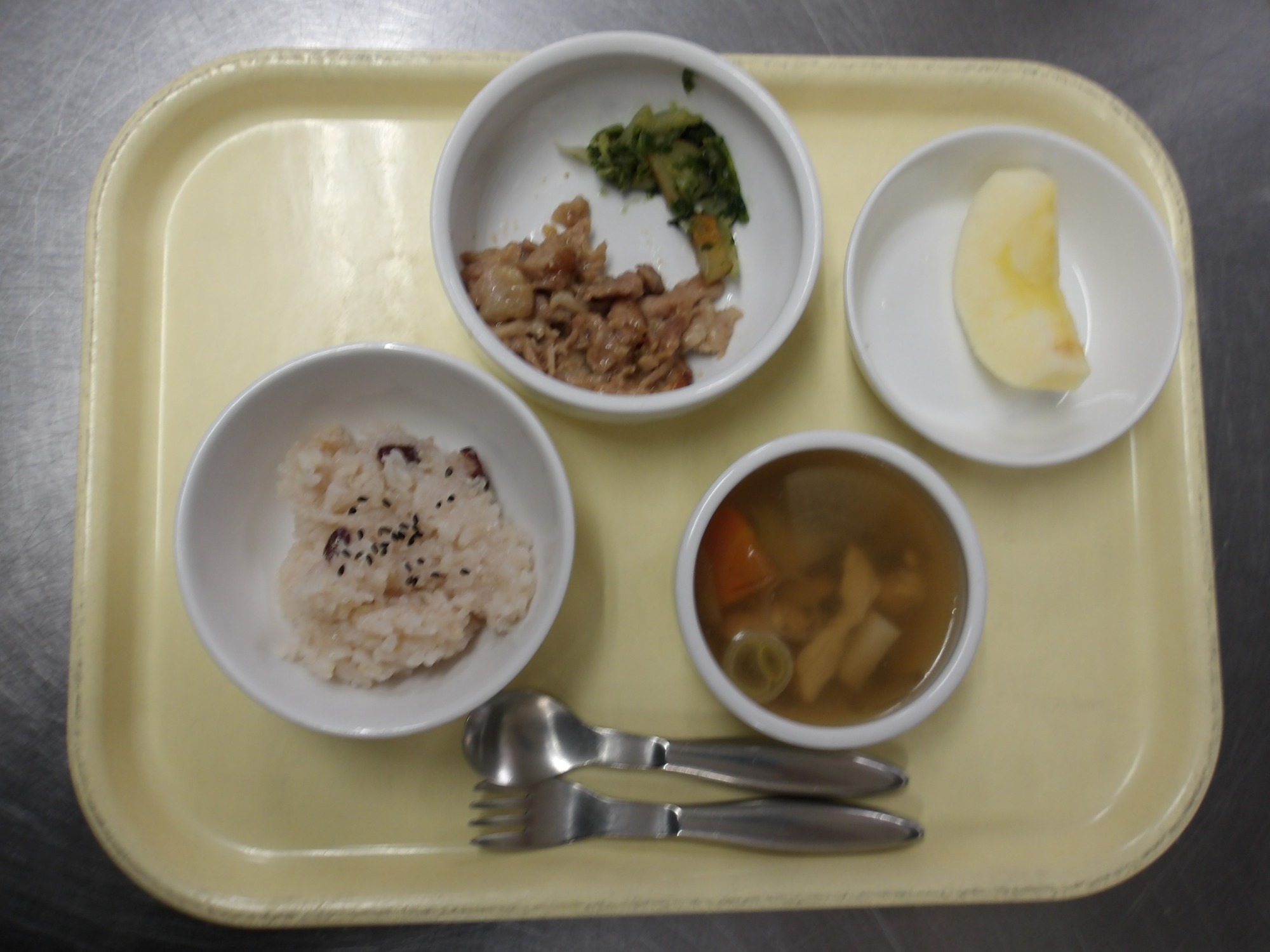 こんこんごはん(キツネの大好きな油揚げたっぷりのごはんです)いなだのみそ照りやき 白菜とほうれん草のお浸し けんちん汁 りんご おやつ:さつまいもとりんごの甘煮