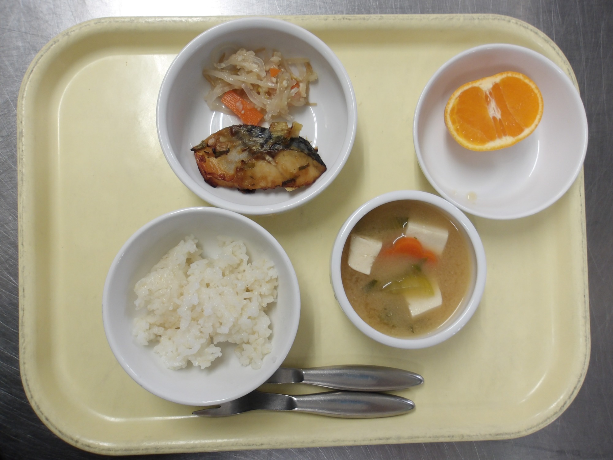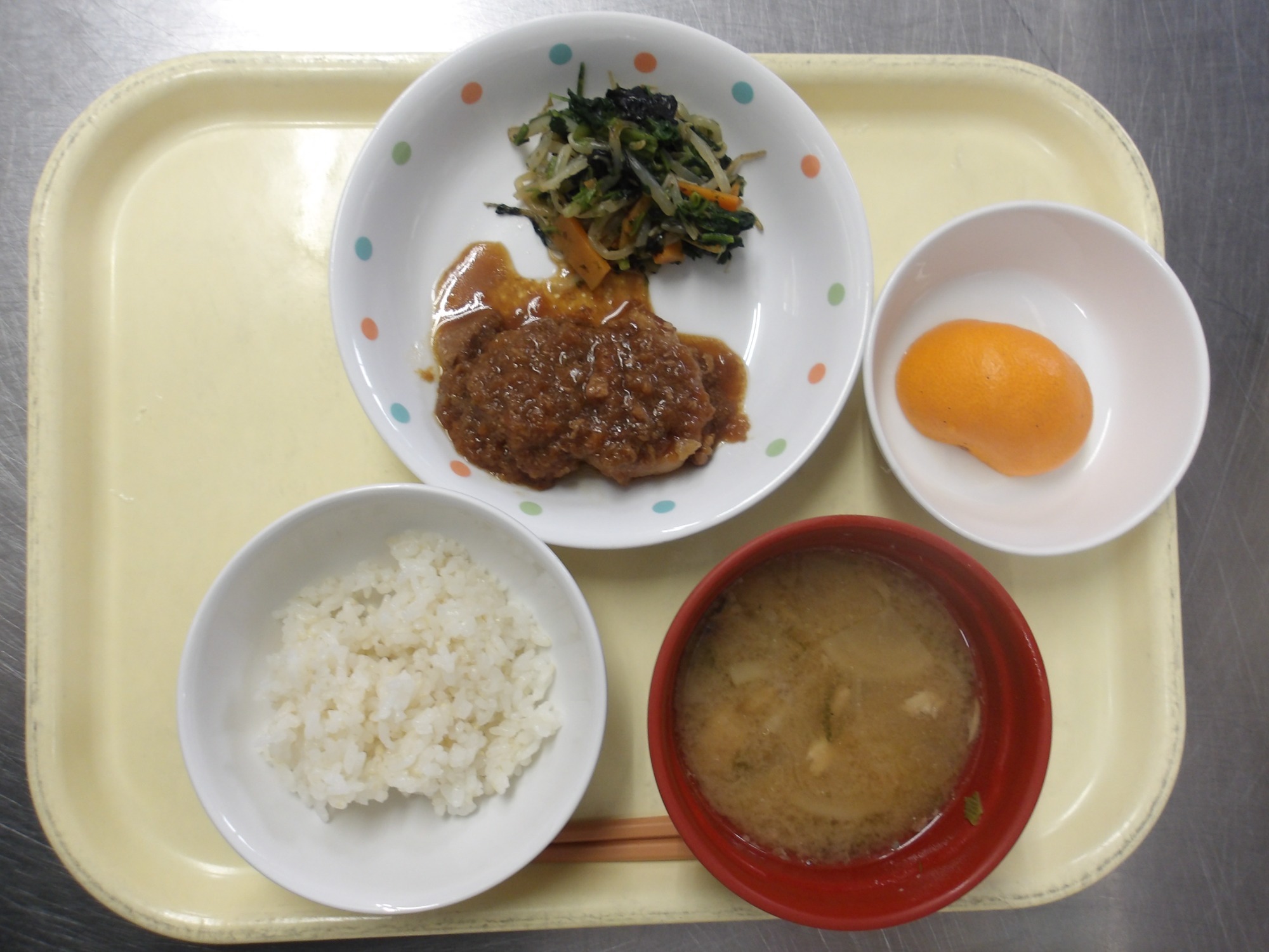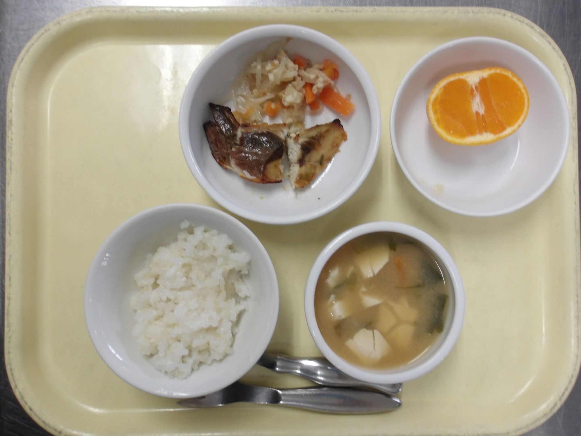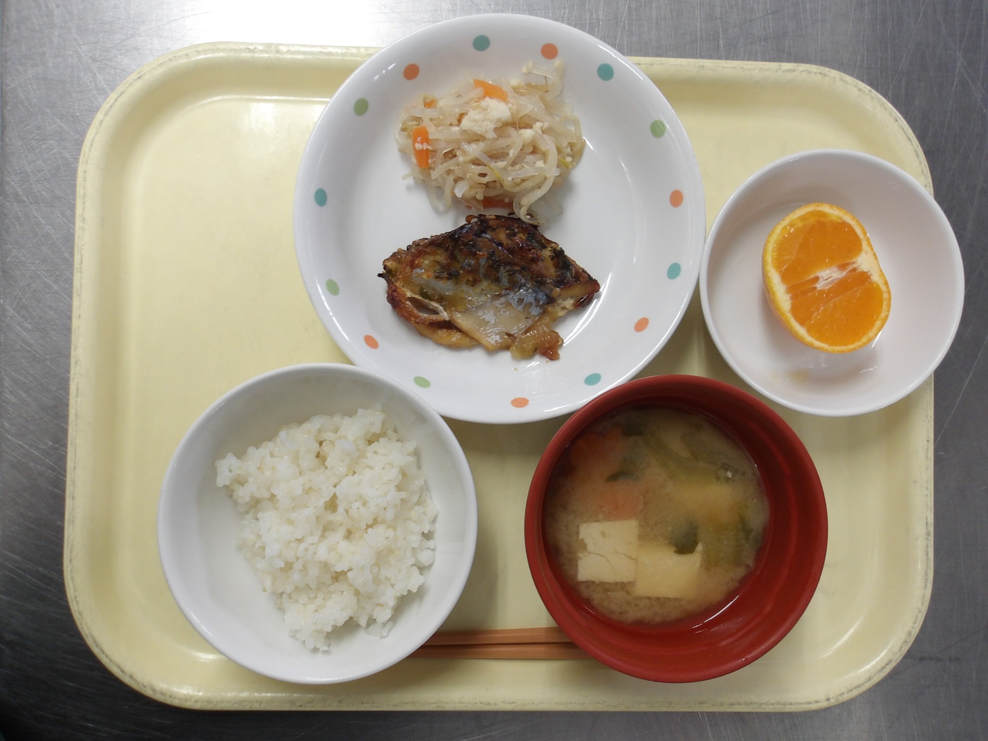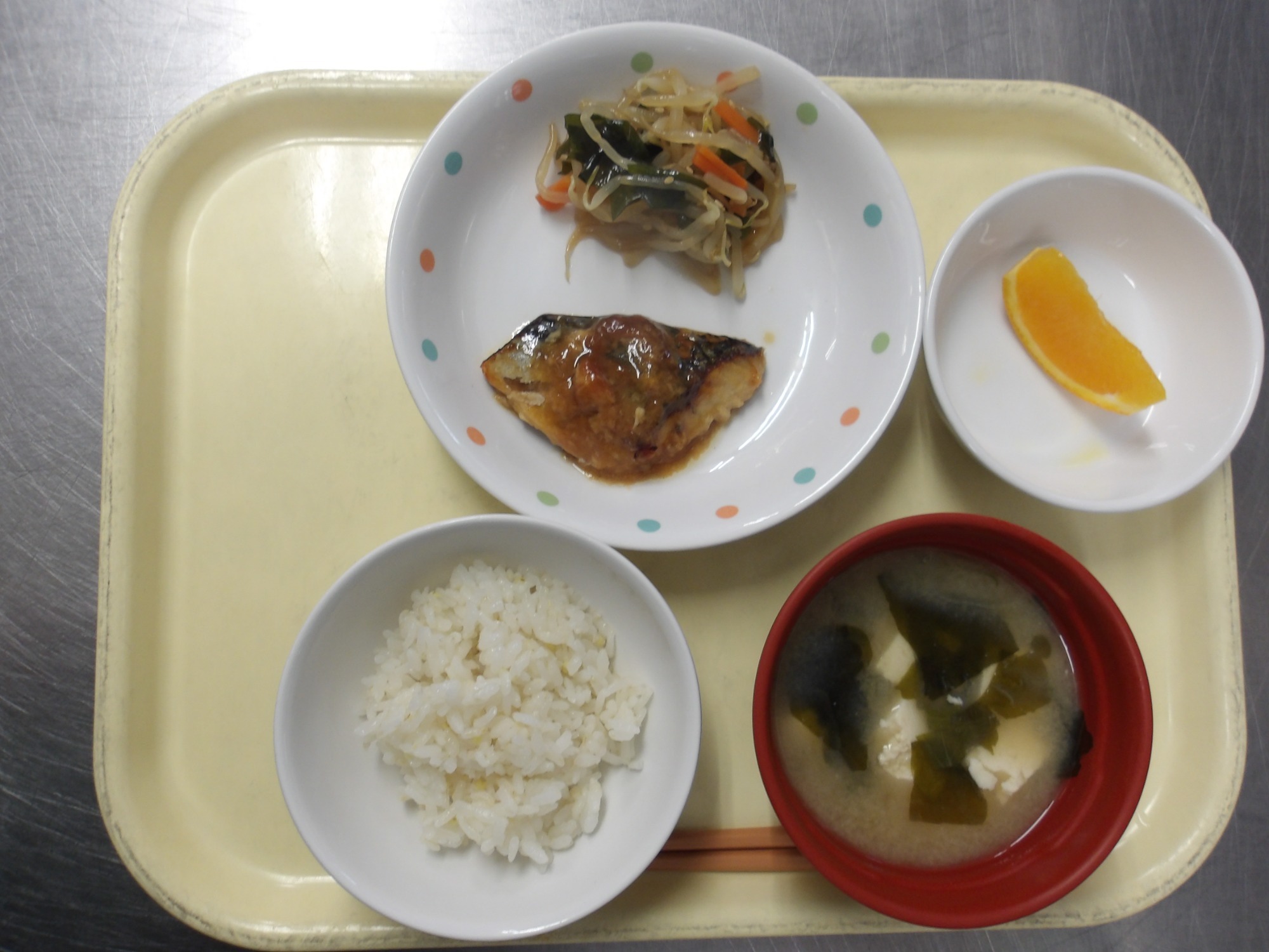 こんこんごはん(キツネの大好きな油揚げたっぷりのごはんです)いなだのみそ照りやき 白菜とほうれん草のお浸し けんちん汁 りんご おやつ:さつまいもとりんごの甘煮