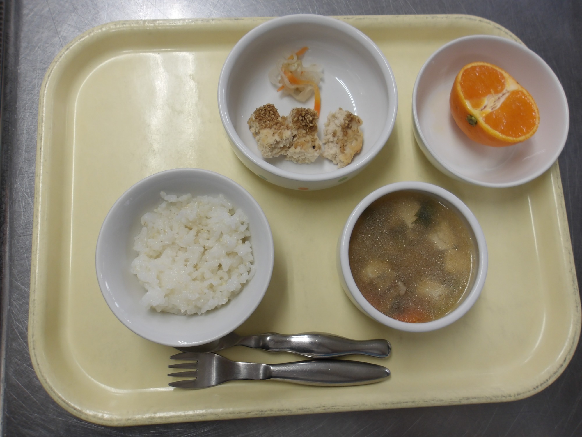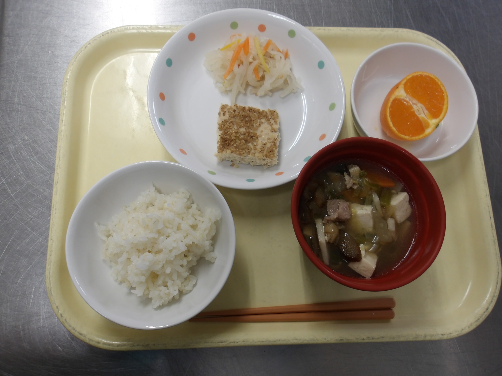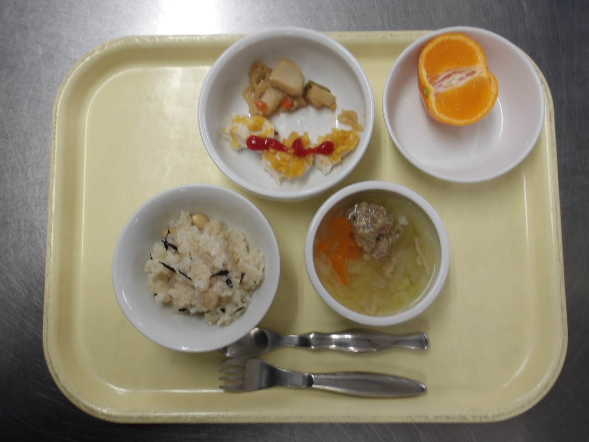 だいずごはん ささみのこん棒焼き みかん 里芋と糸こんにゃくの味噌煮 いわしのつみれスープ おやつ:鬼除け大豆クッキー
