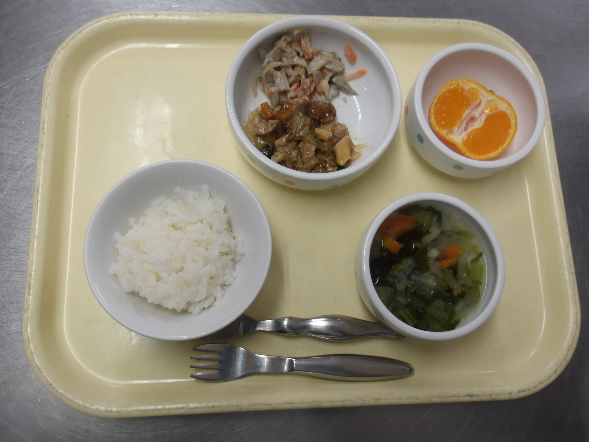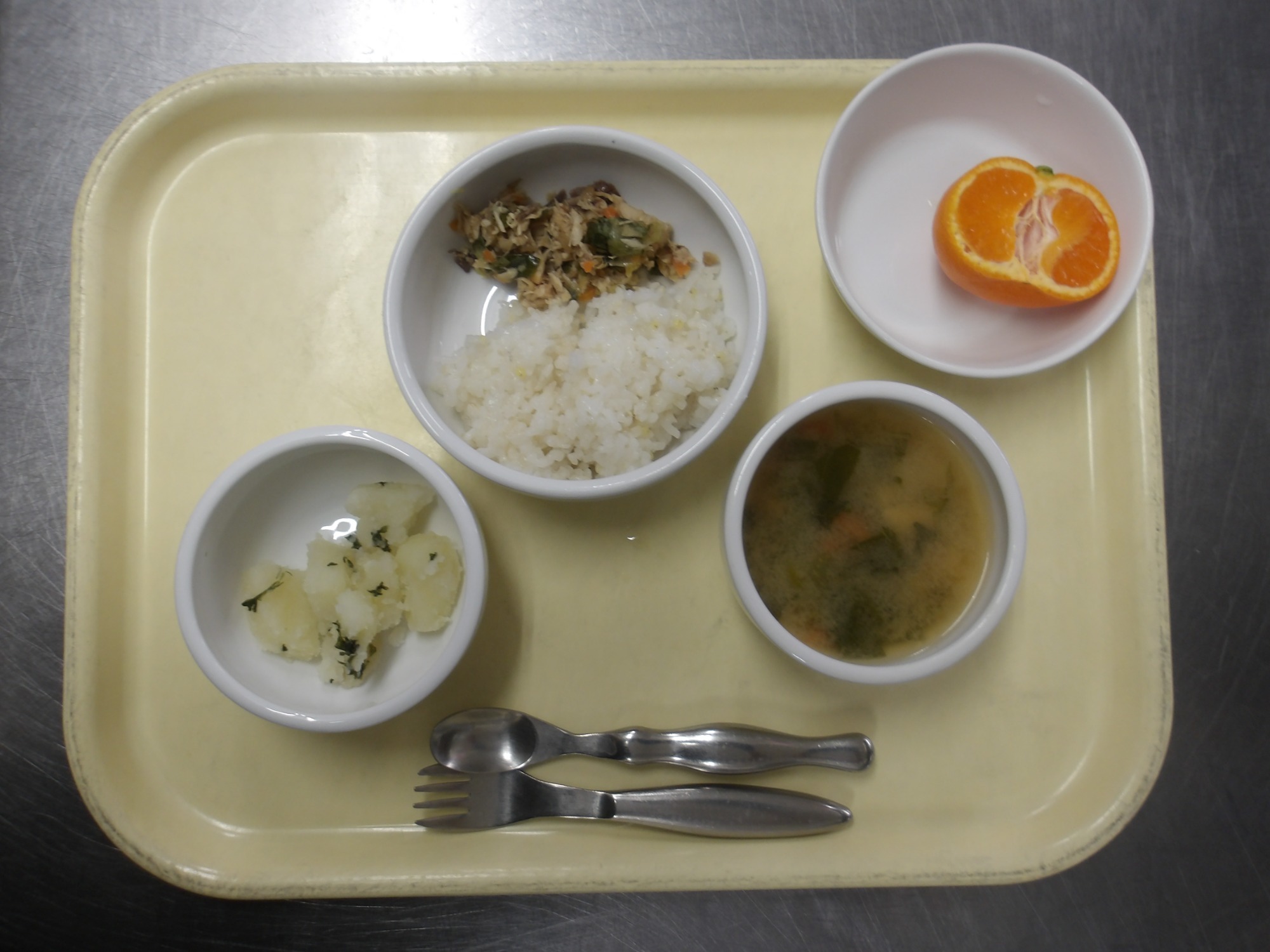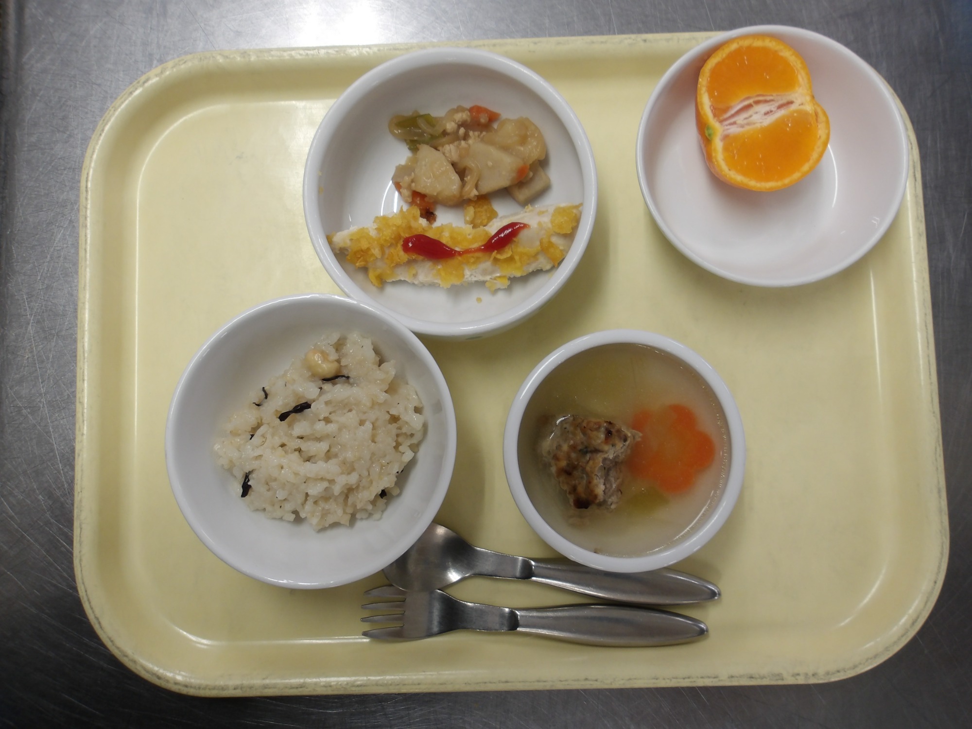 だいずごはん ささみのこん棒焼き みかん 里芋と糸こんにゃくの味噌煮 いわしのつみれスープ おやつ:鬼除け大豆クッキー