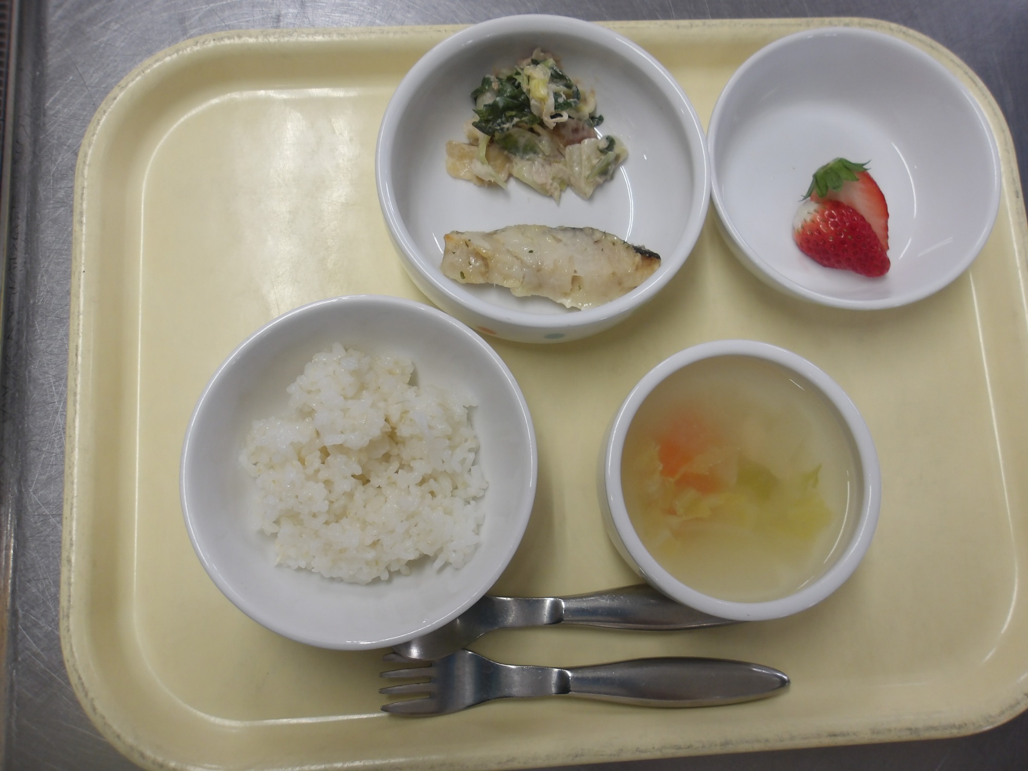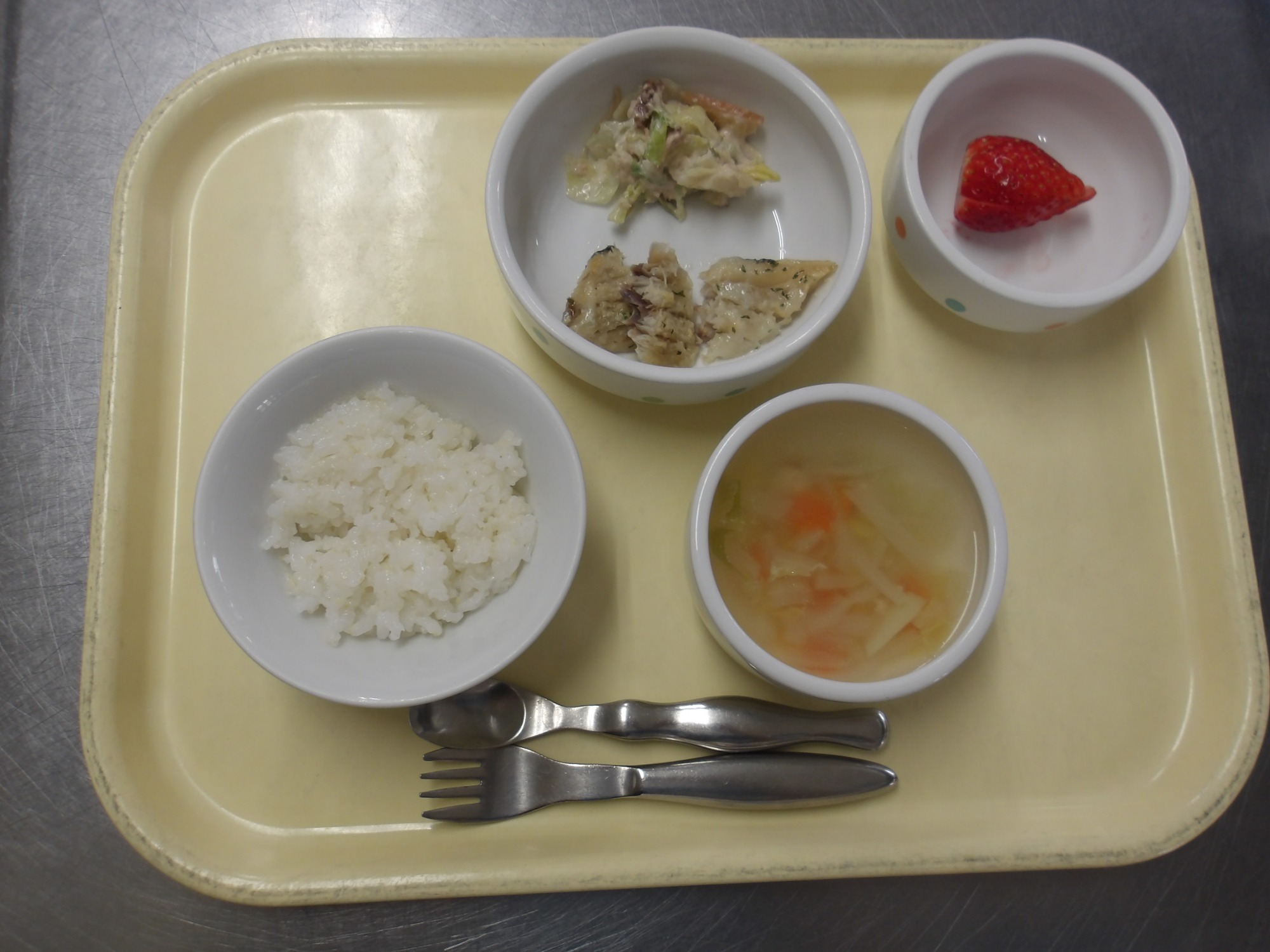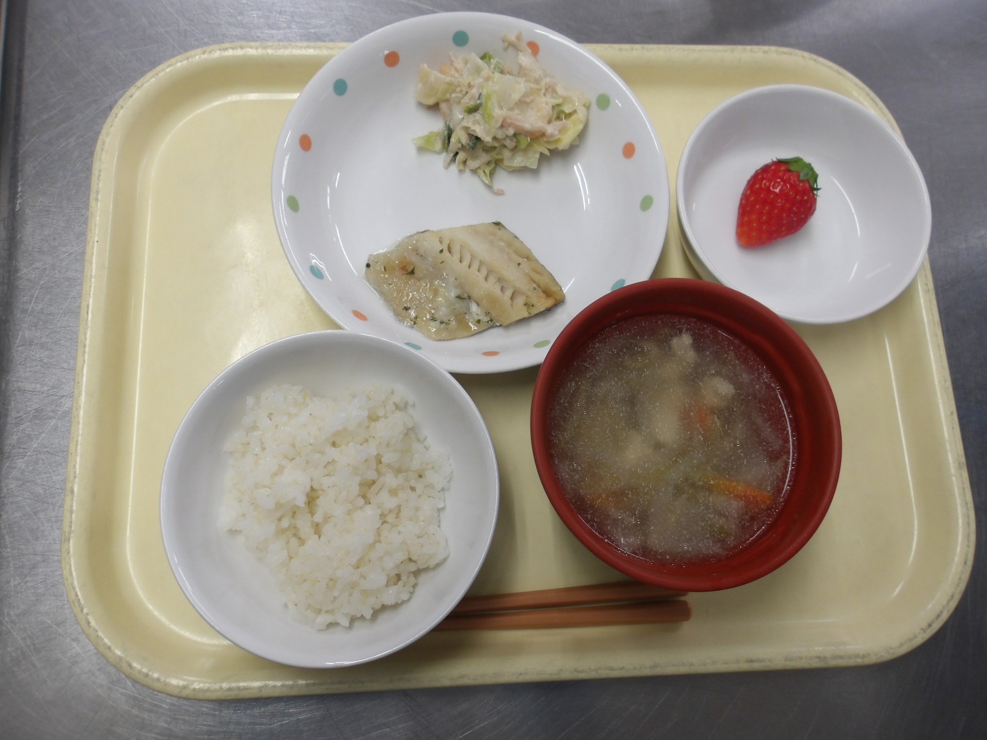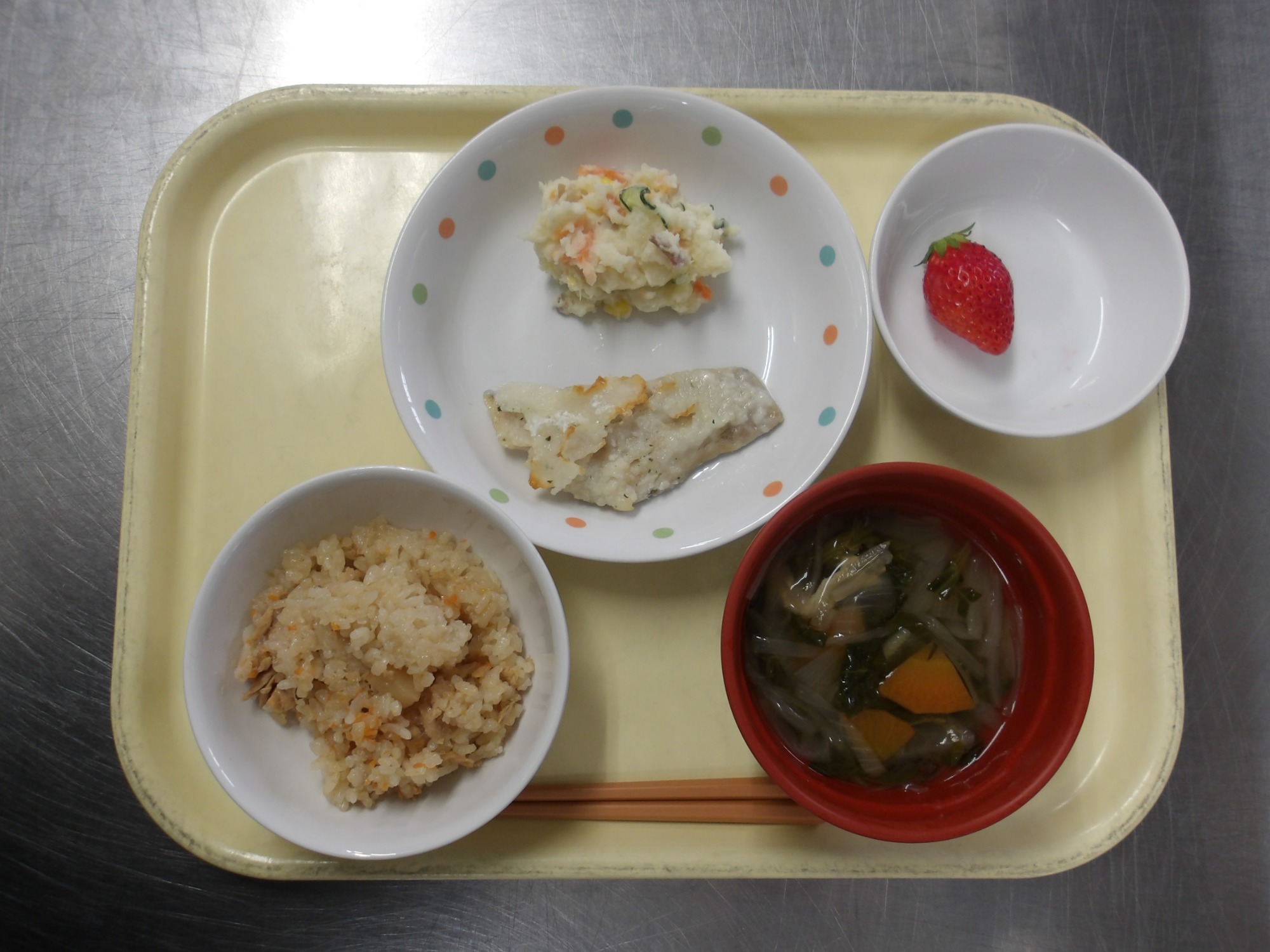 ツナごはん 鱈のガーリックムニエル ポテトサラダ 野菜スープ いちご