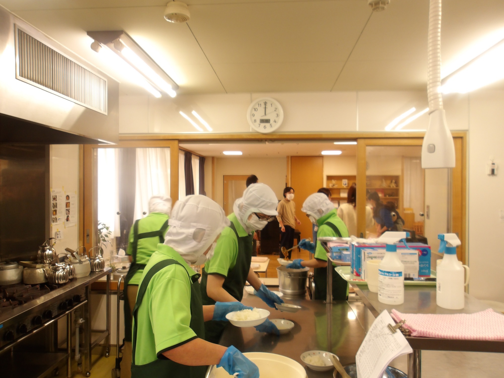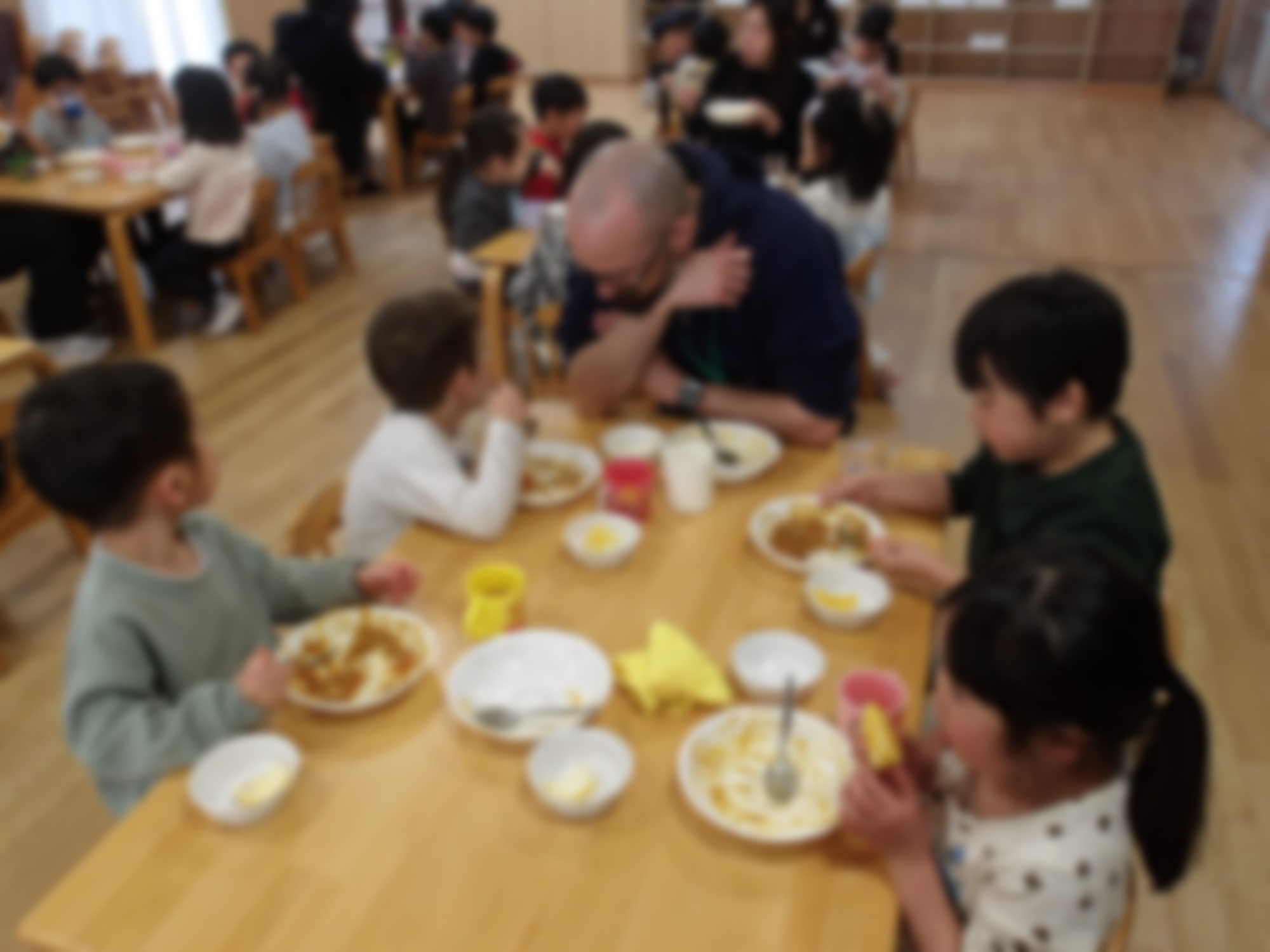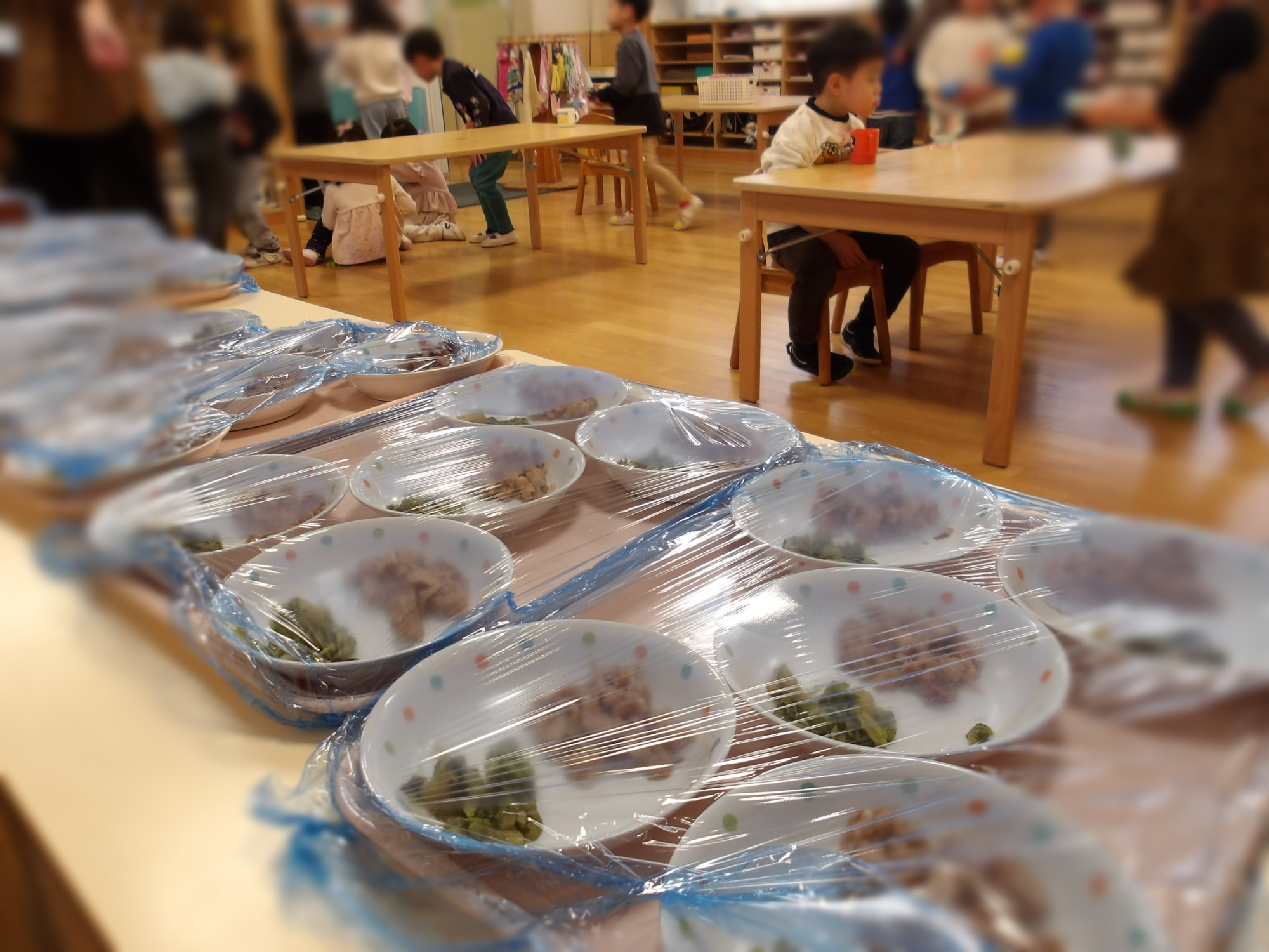 いつもは自分で盛り付けの年長さんも今日はキッチンで盛り付けして保護者の方に準備をお手伝いいただきました