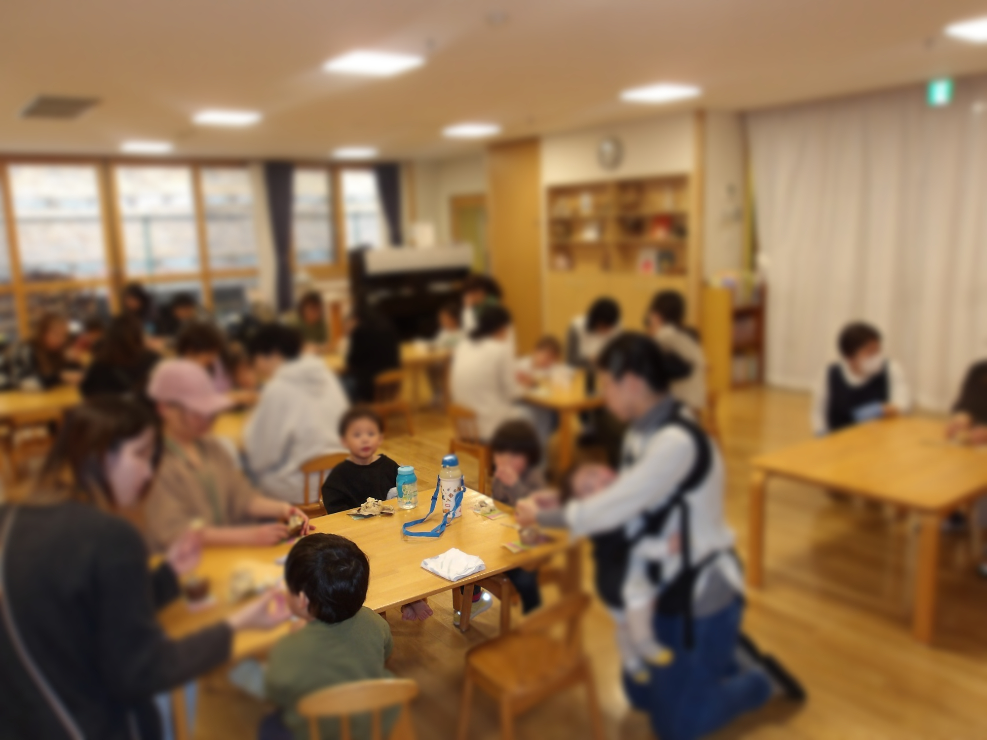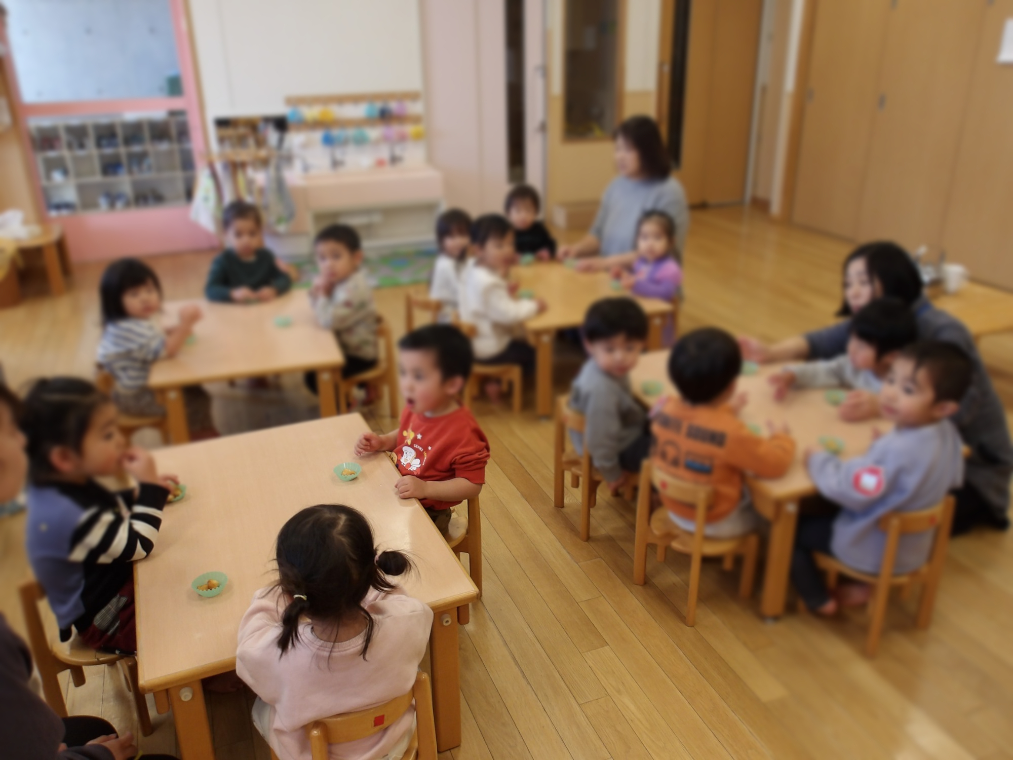 未就園クラスのひつじ組がさつまいものケーキを食べました。園のおやつで使用している米粉、きび糖、豆乳をつかったケーキなので卵・乳・小麦粉がアレルゲンのお友達も心配なく食べられます♪