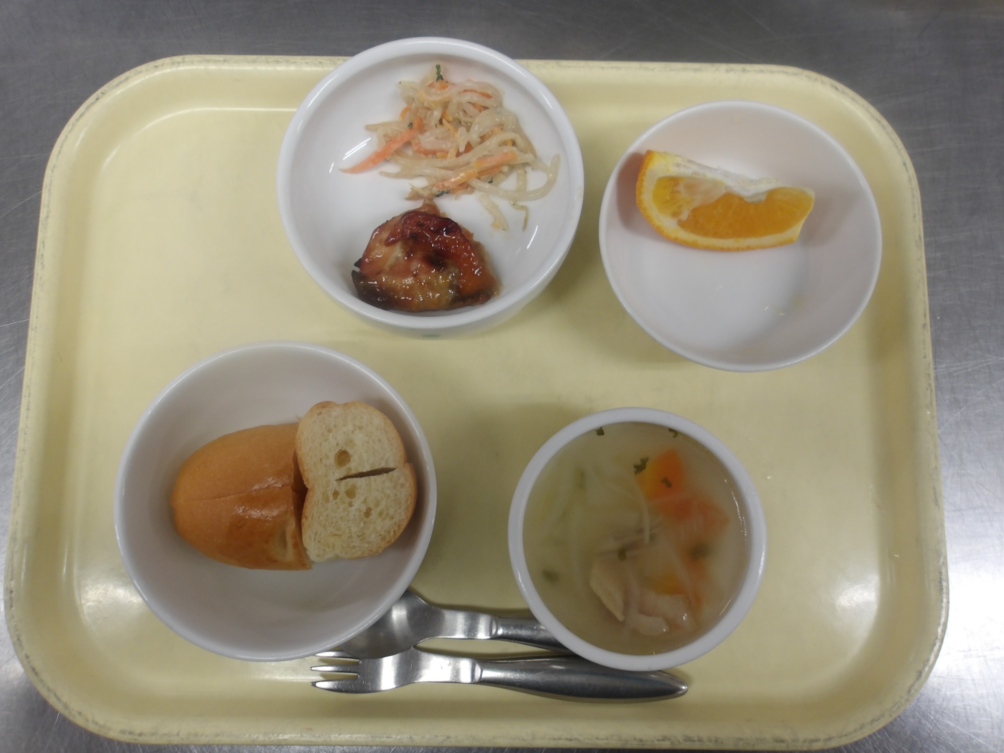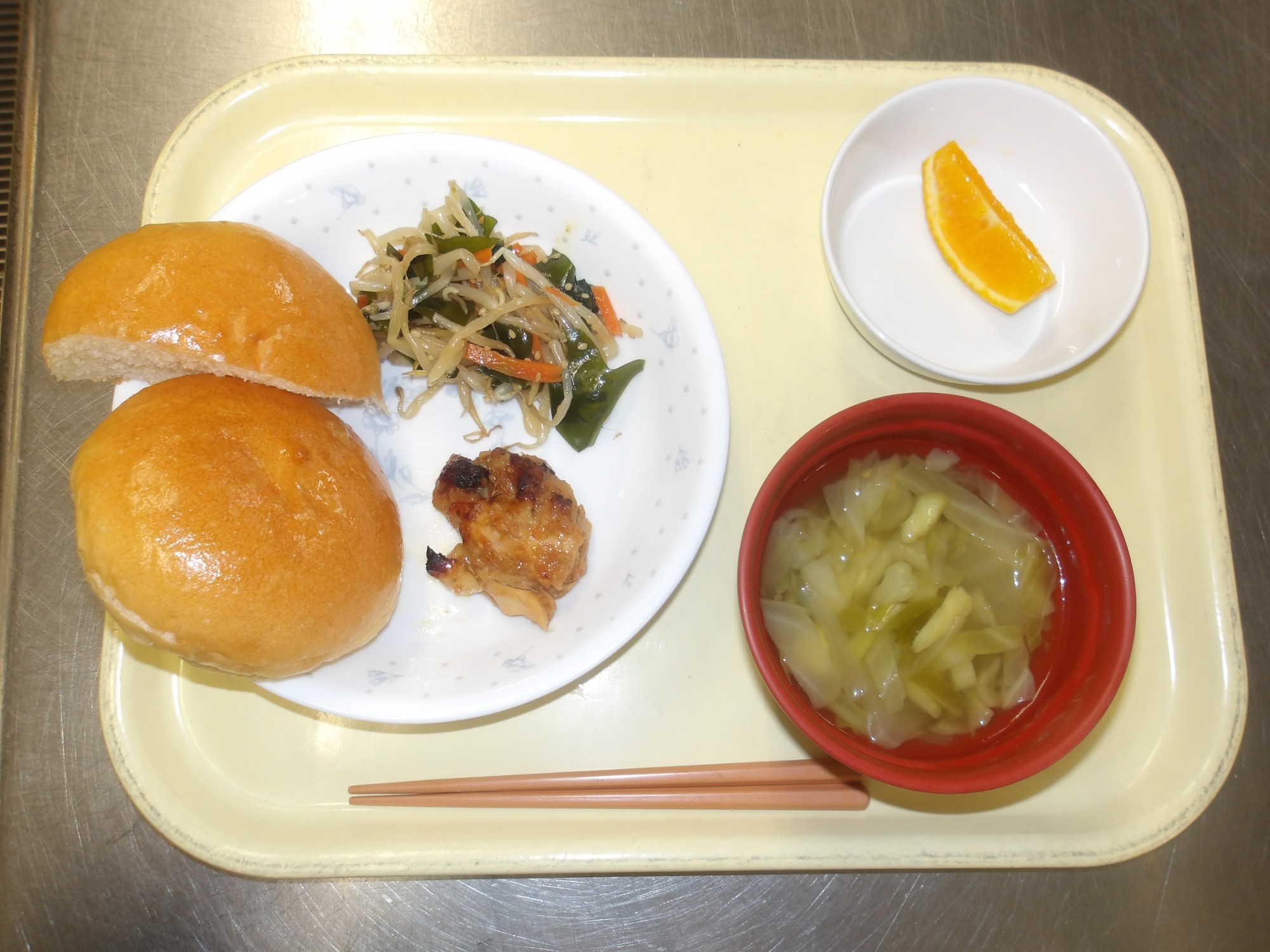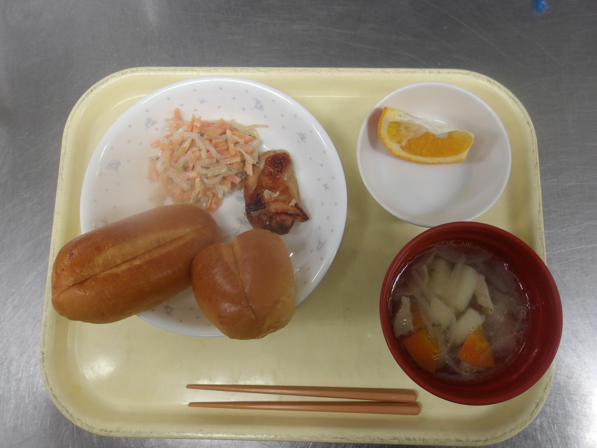 セルフチキンバーガー(ミルクパンと鶏の照り焼き) 人参のごまあえサラダ 野菜スープ いよかん おやつ:炊き込みご飯おにぎり