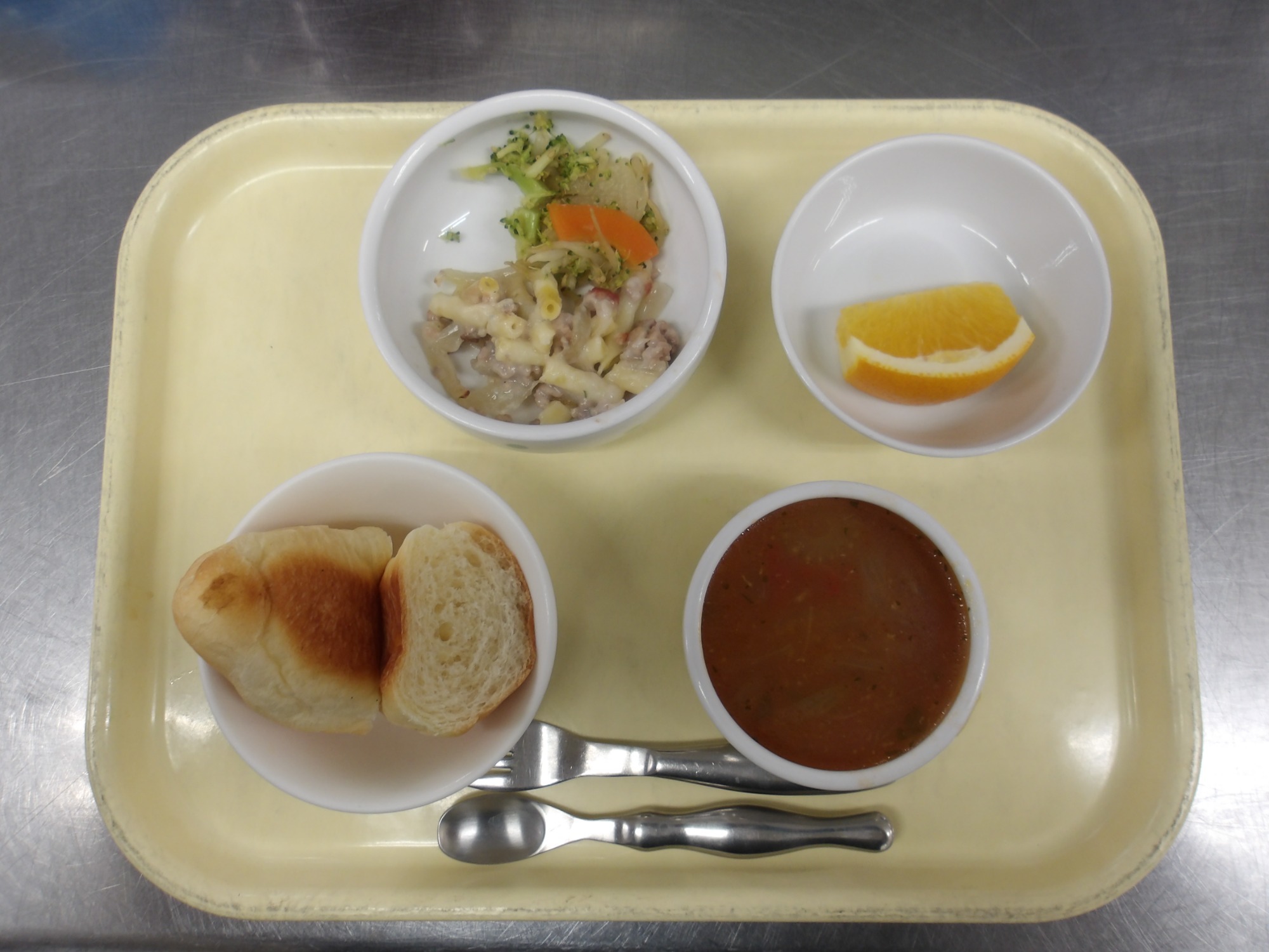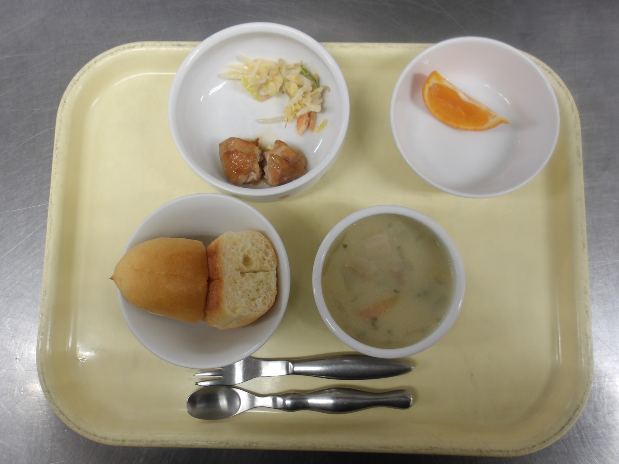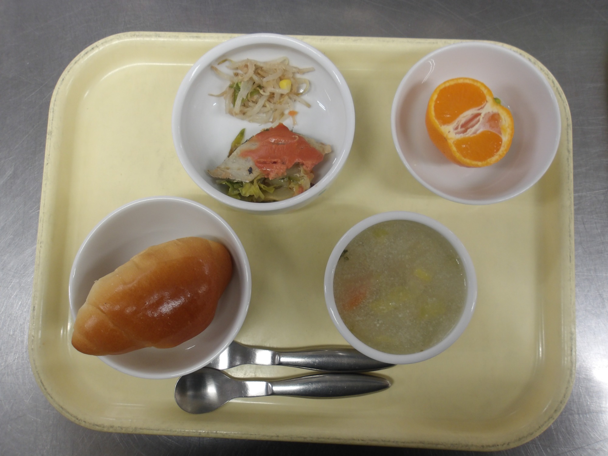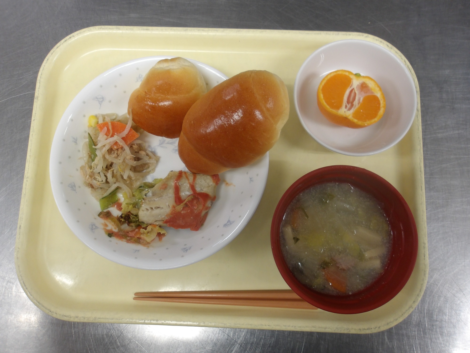 ロールパン マカロニグラタン ブロッコリのごま酢あえ ブイヤベース はっさく