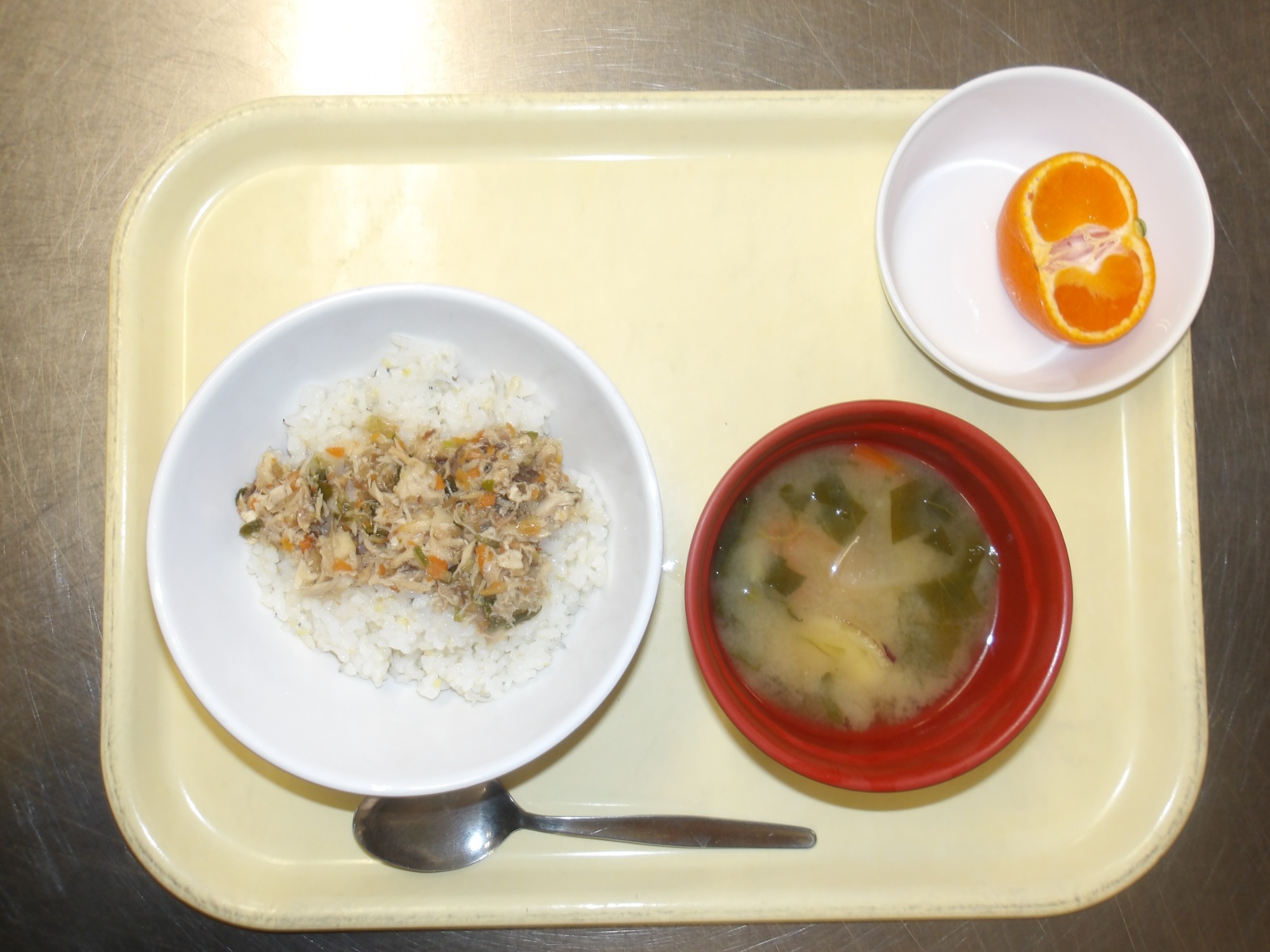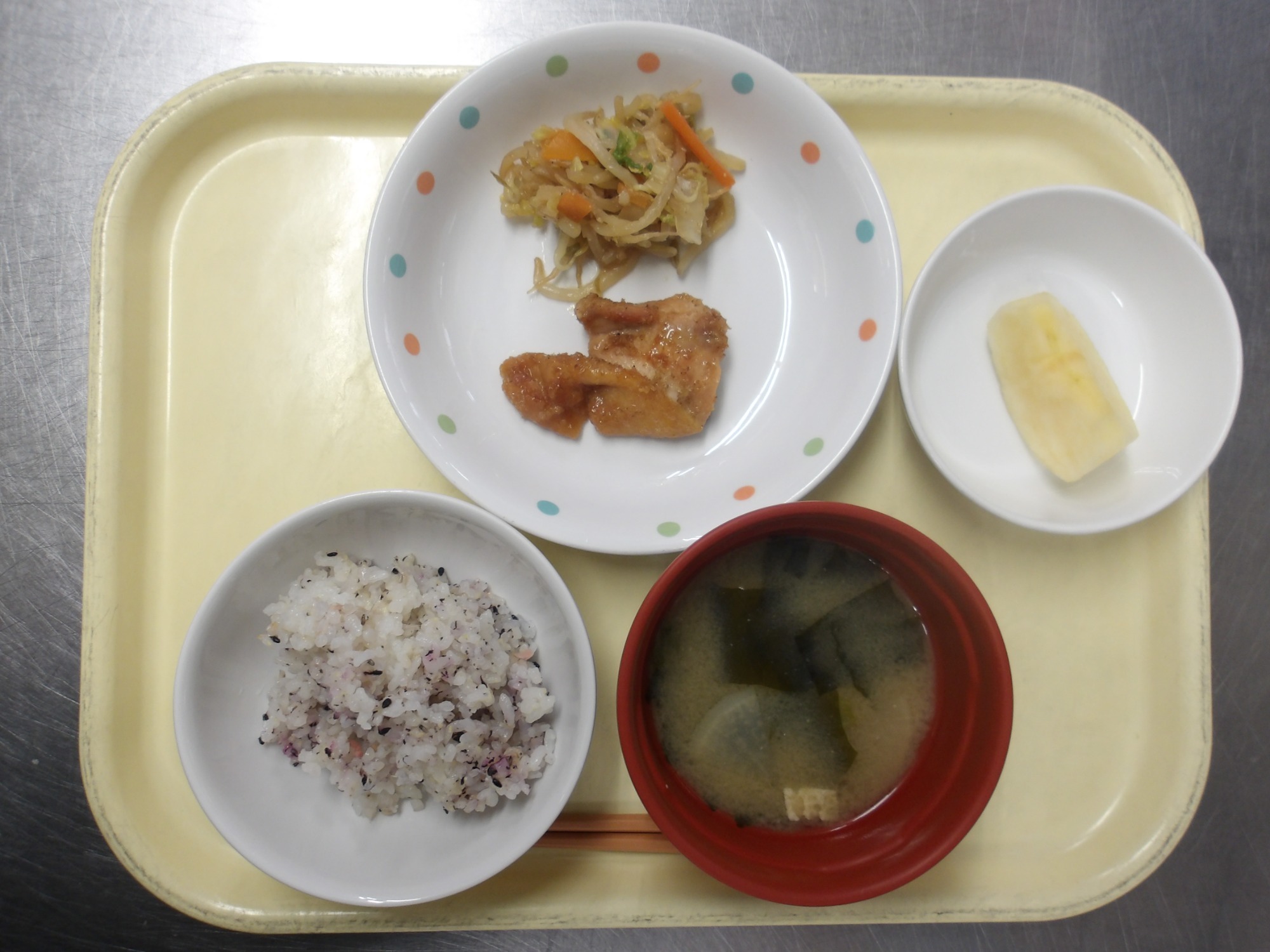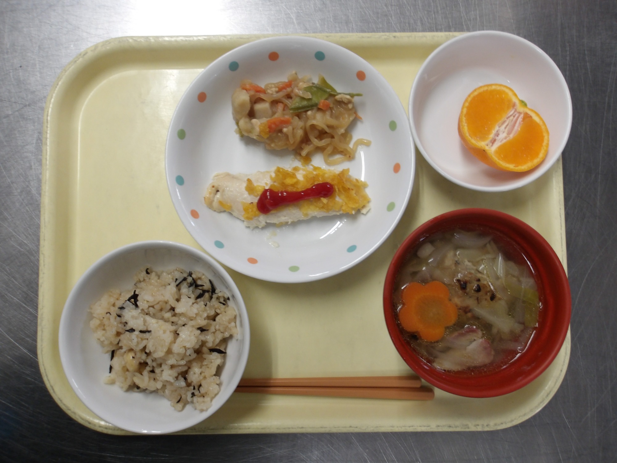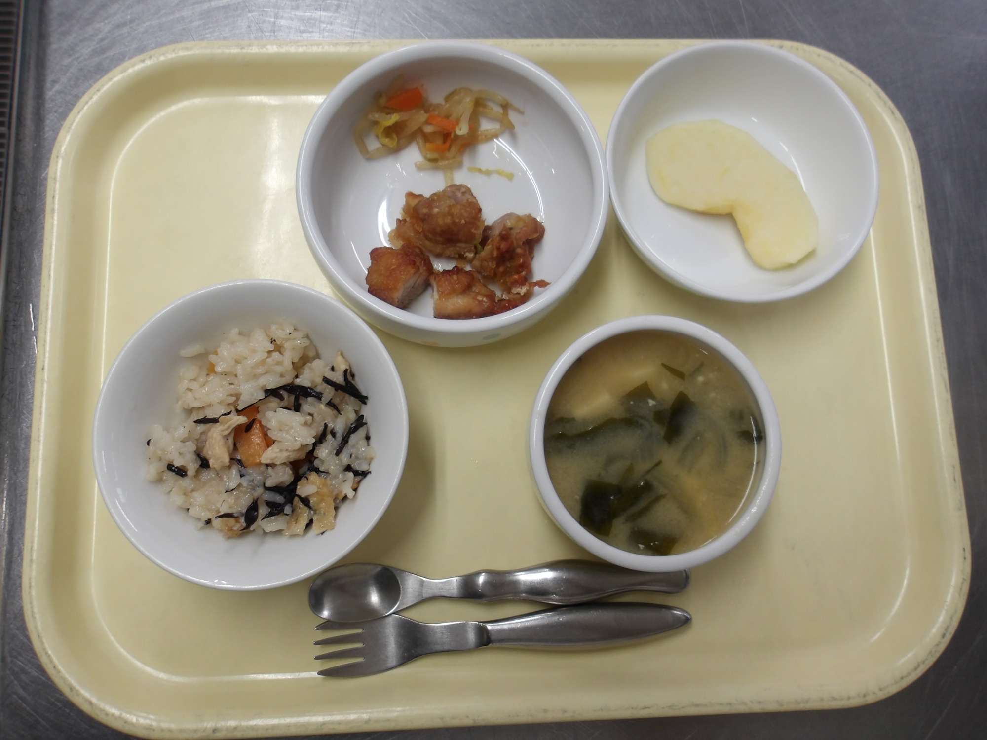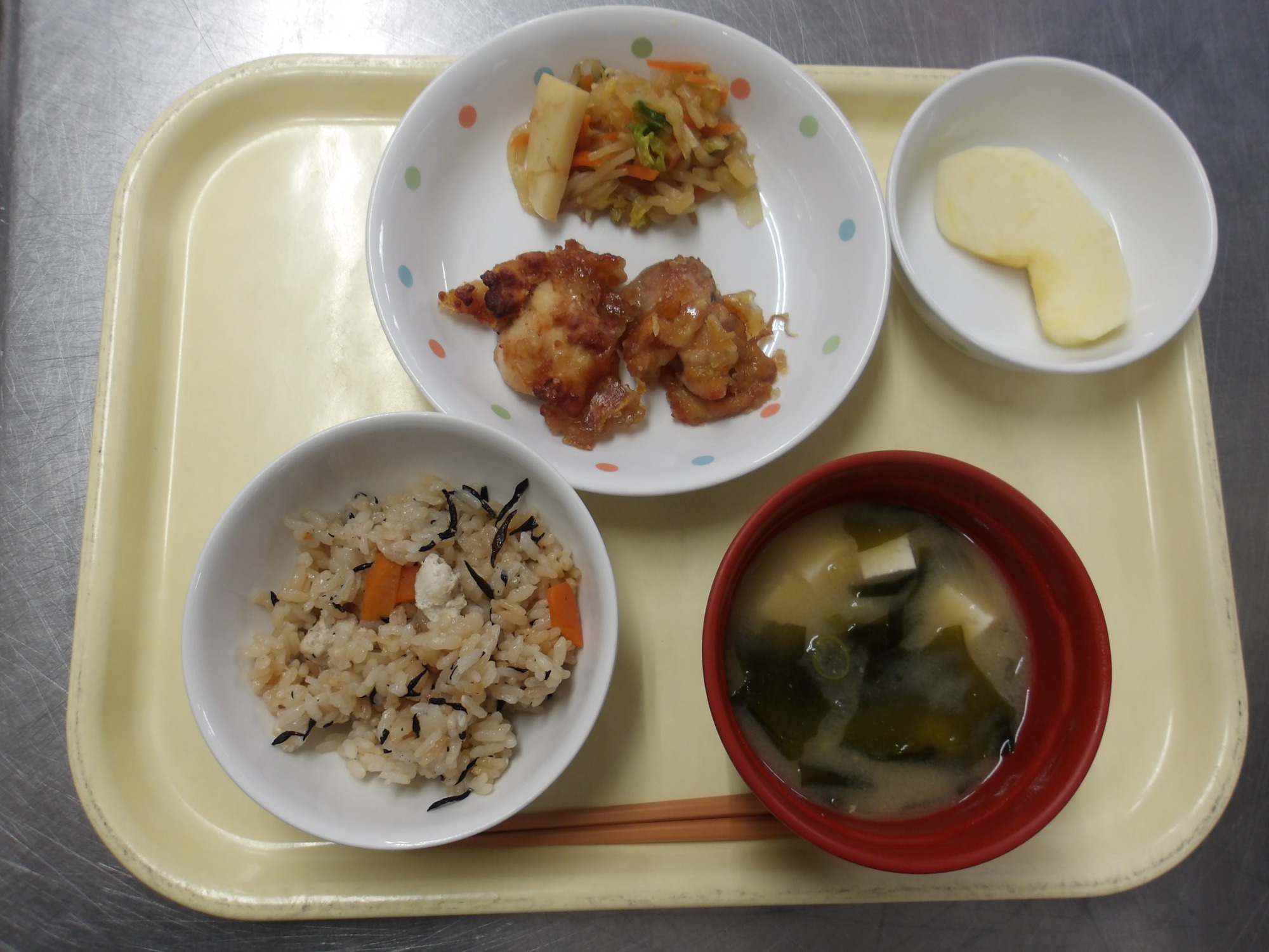ひじきごはん 鶏のから揚げ おかかあえ 豆腐のみそ汁 りんご おやつ:おからクッキー
