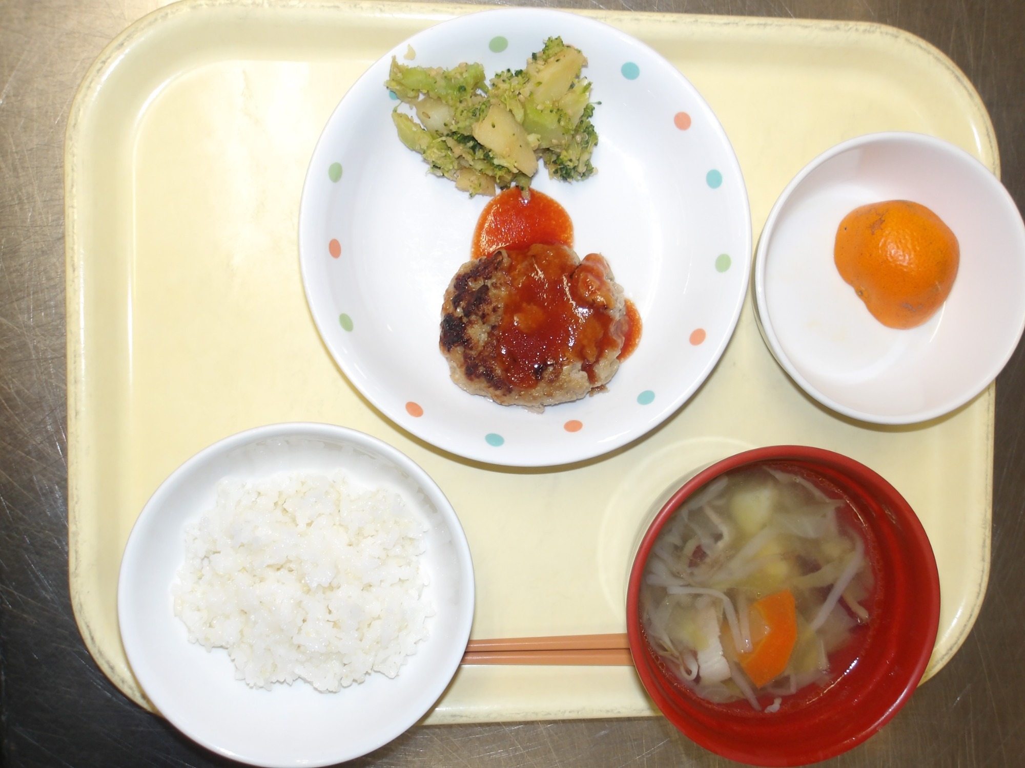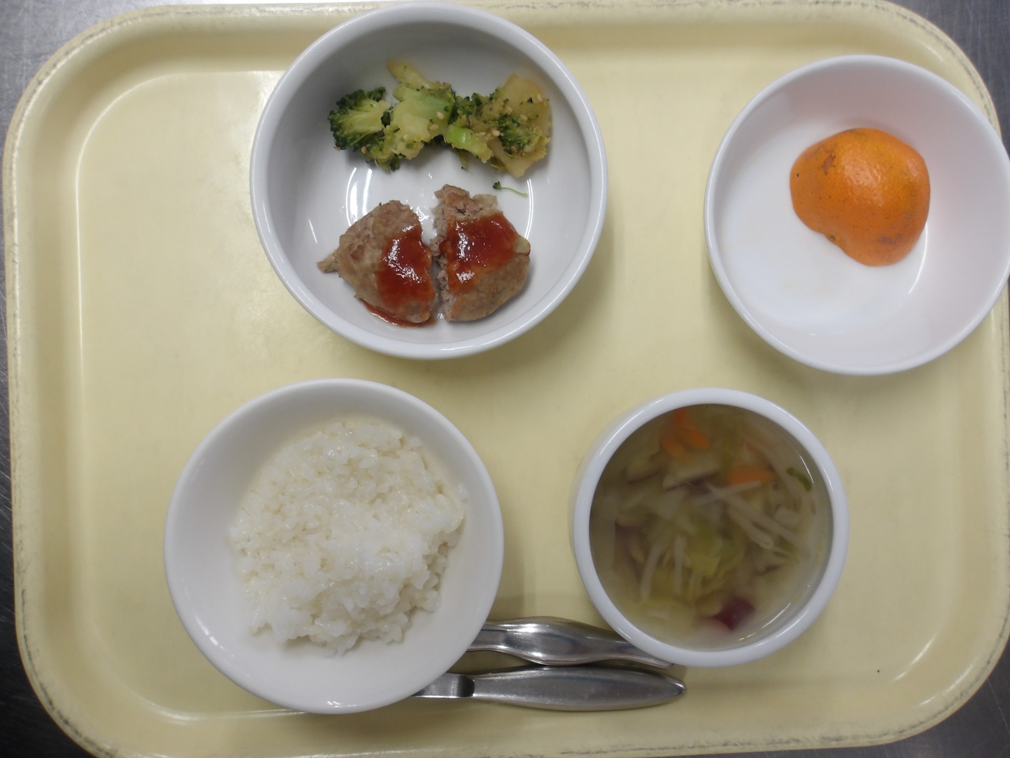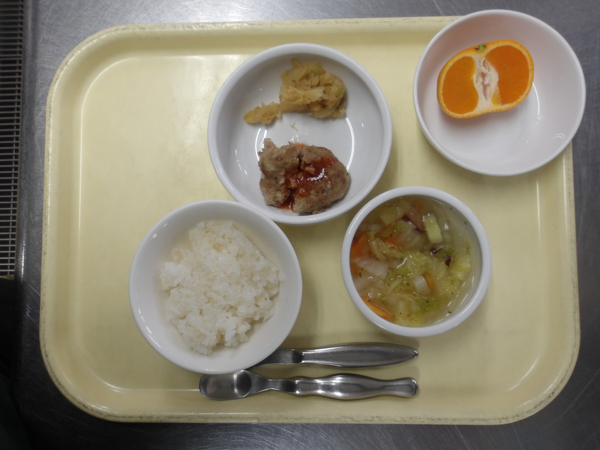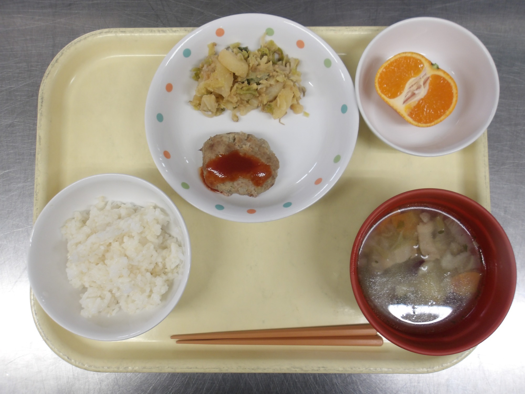 ごはん ハンバーグ きゃべじゃがサラダ さつまいものスープ みかん おやつ:黒ゴマきなこトースト